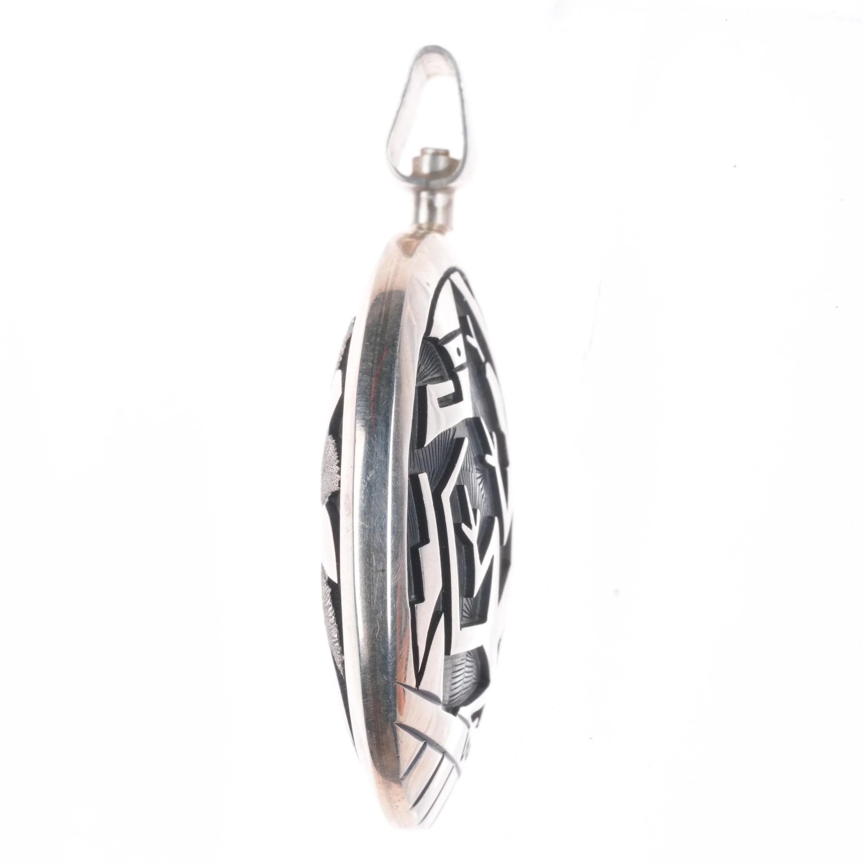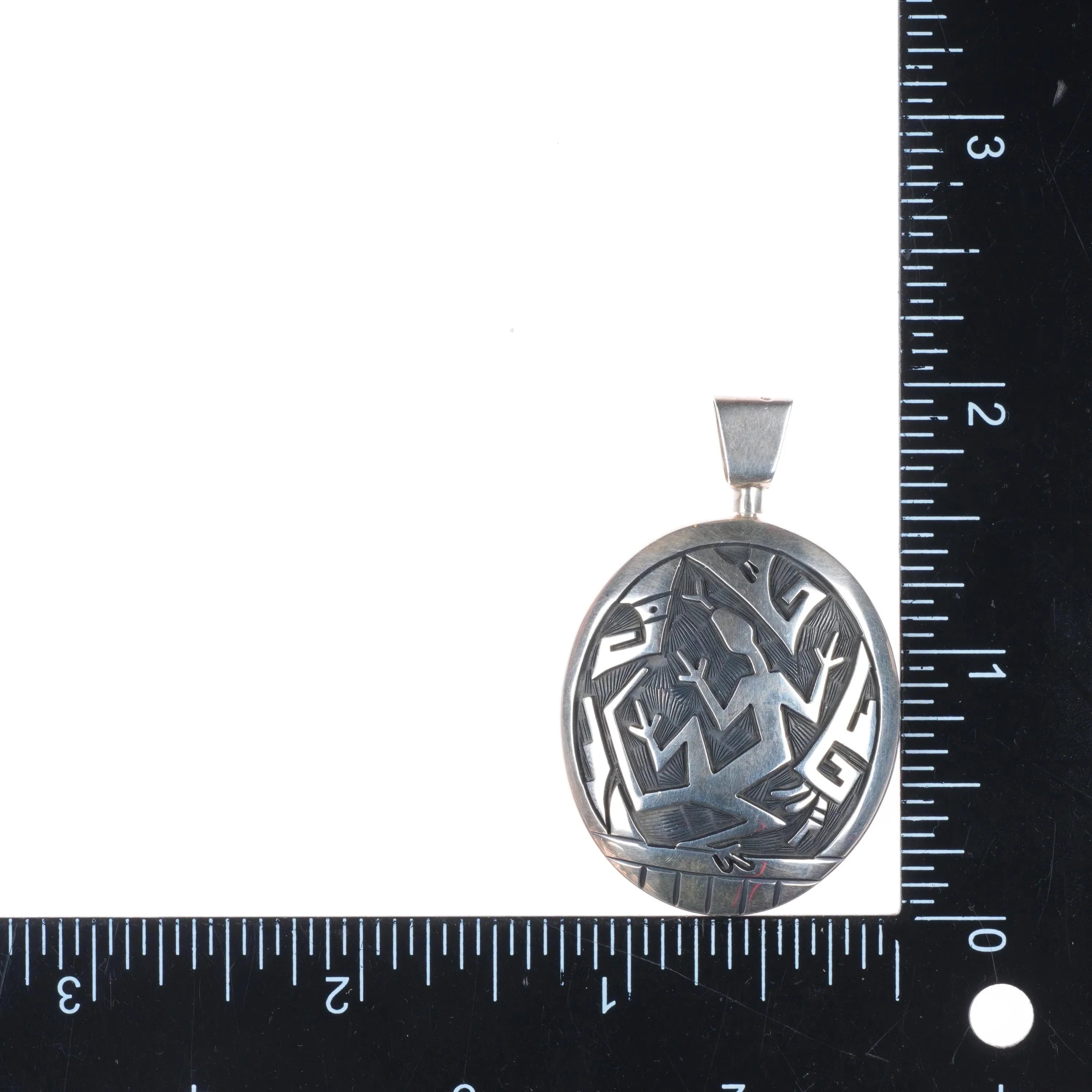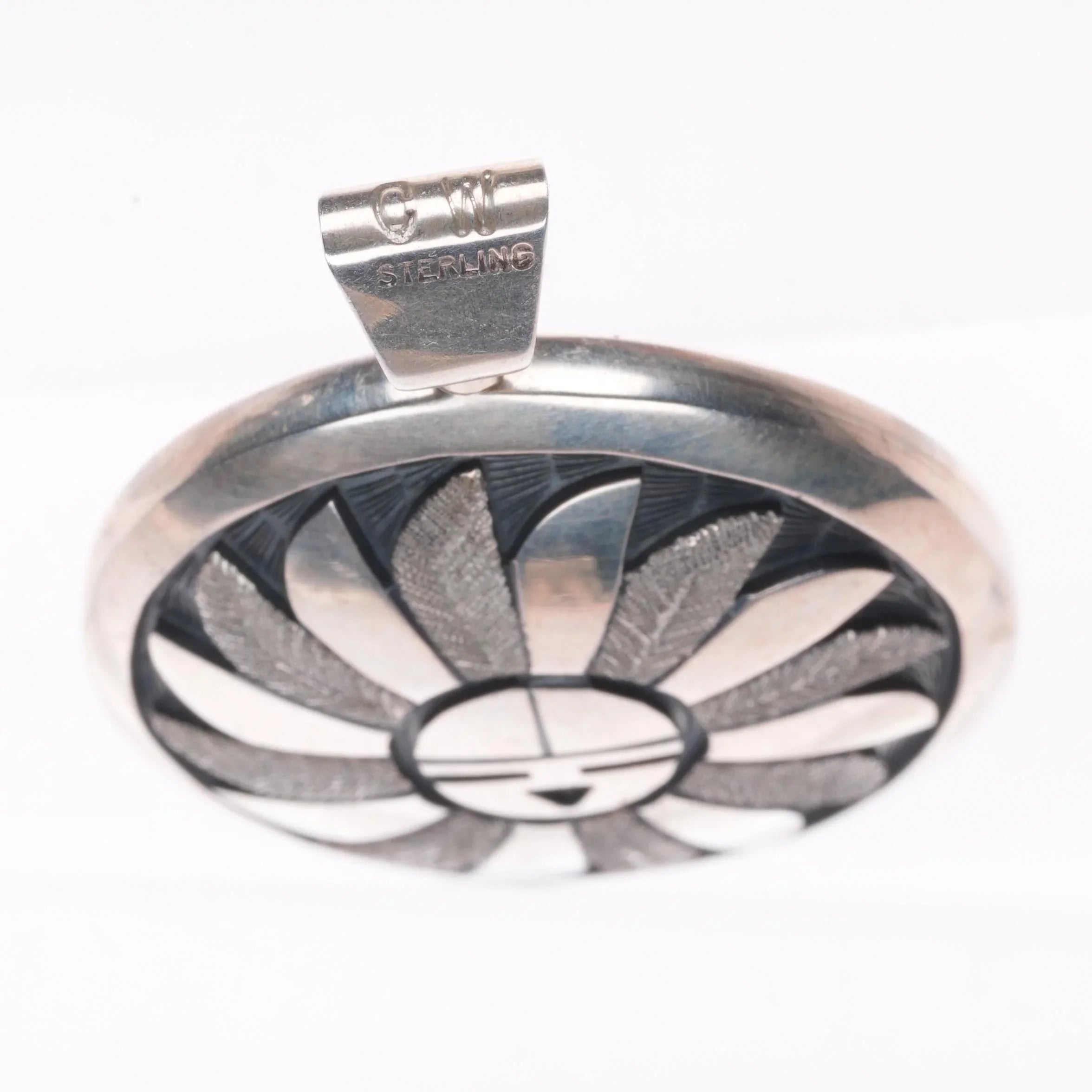 Cheryl Wadsworth Hopi overlay spinner gecko/sunface pendant sterling silver. Reversible spinner 2 sided as shown. Solid sterling silver tested and guaranteed with weight and measurements in the pictures. No issues, circa last quarter of the 20th century.