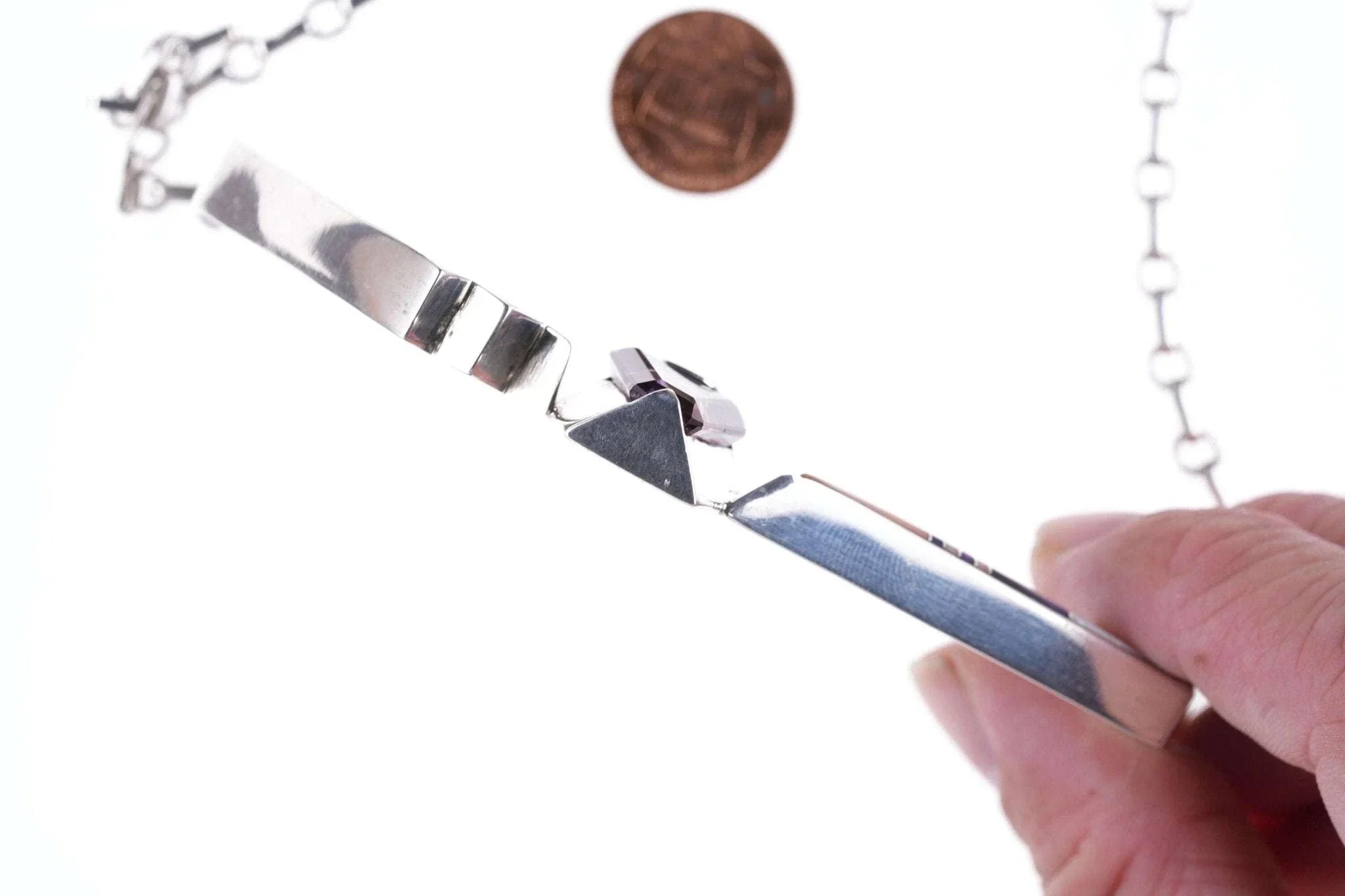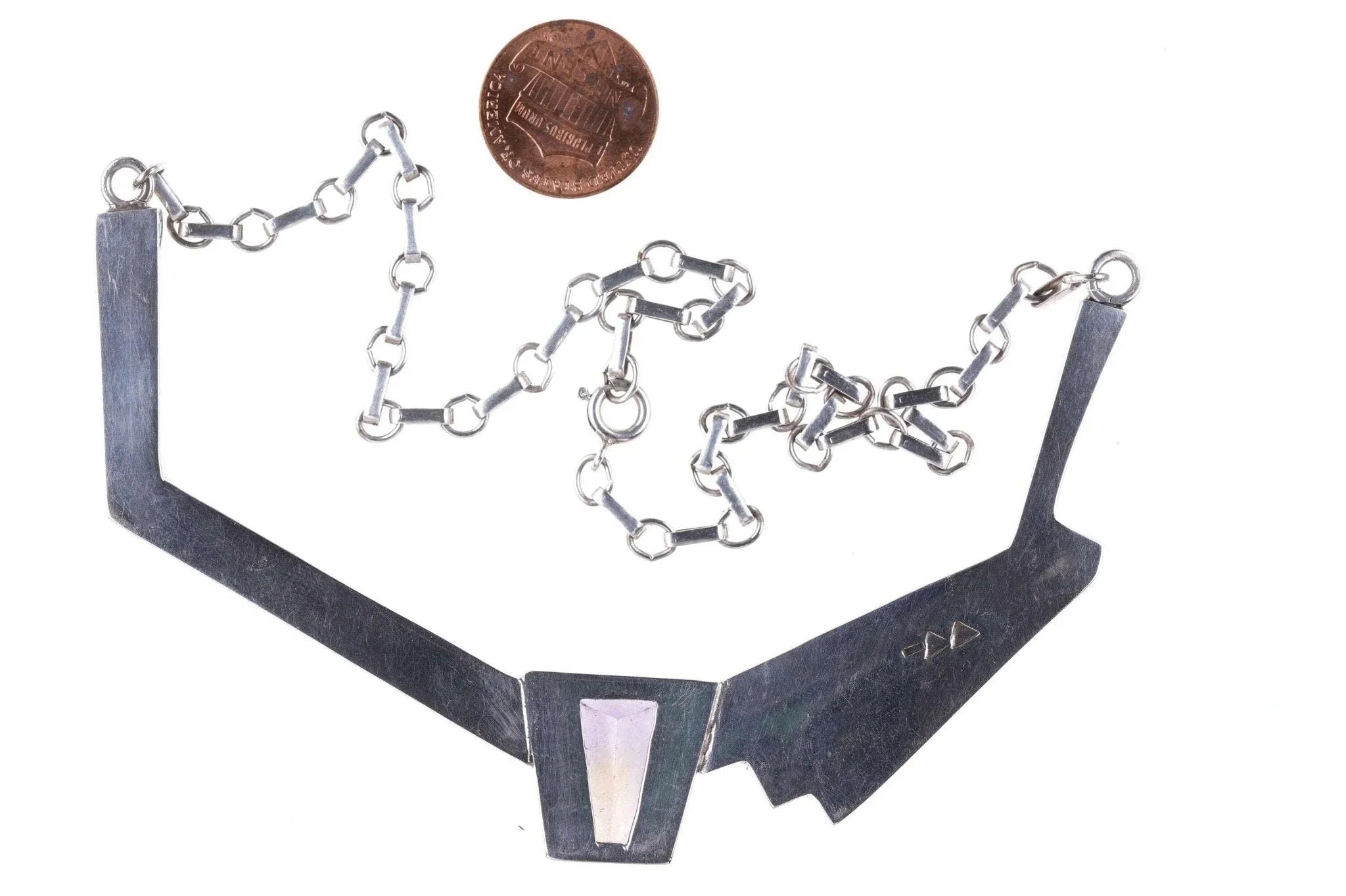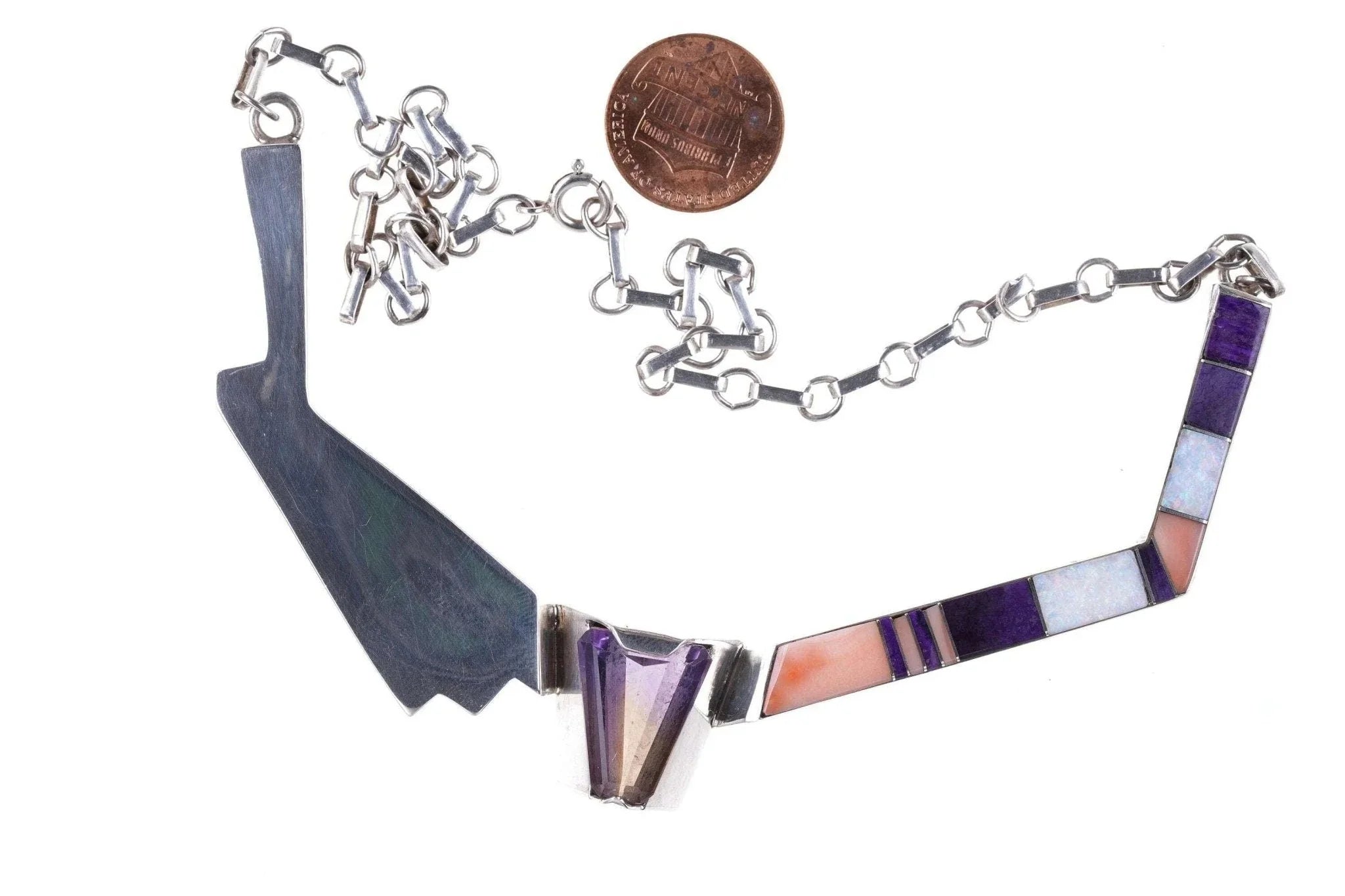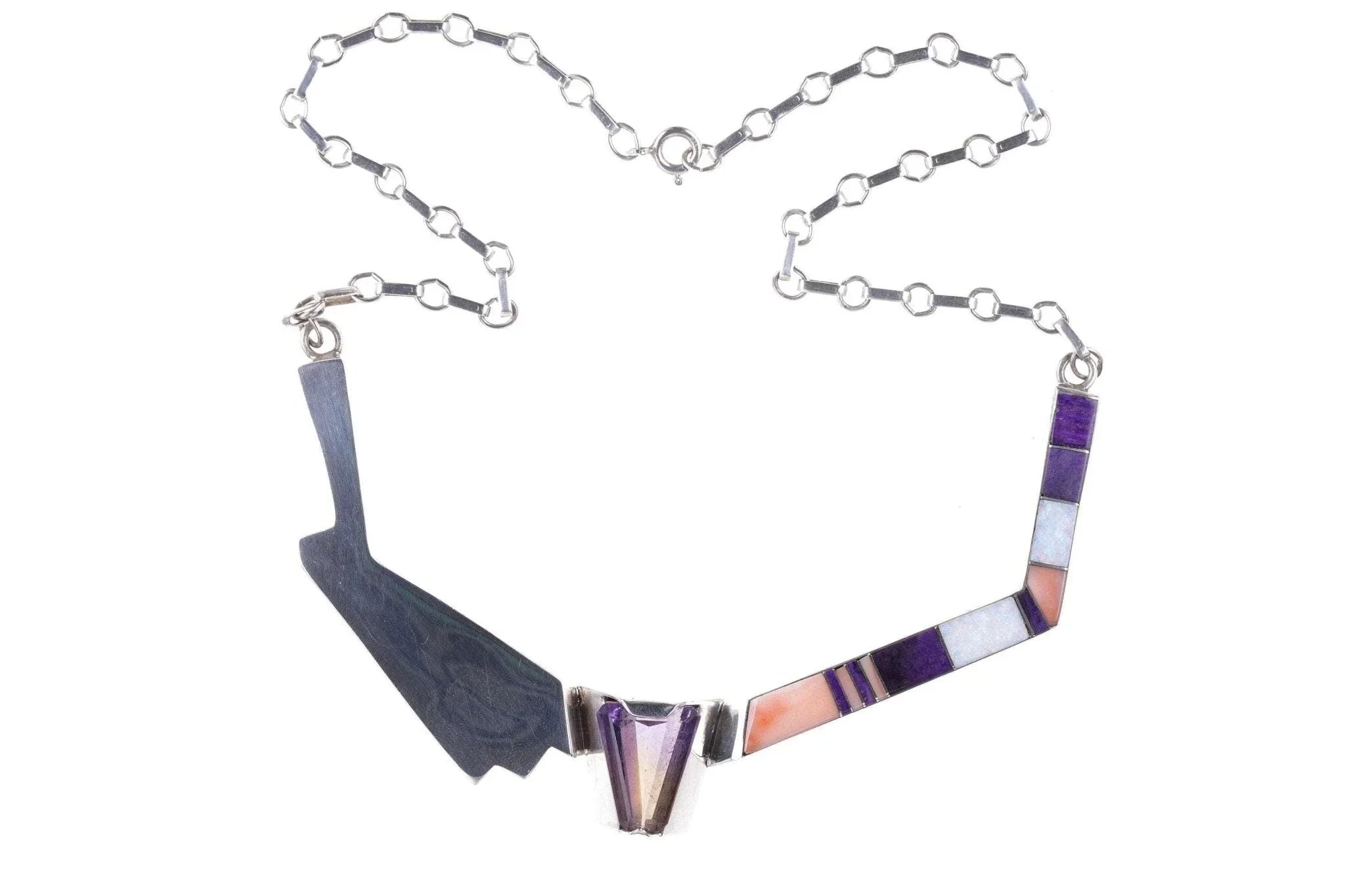 Doug Nava Taos/Apache Sterling silver multistone Channel inlay Necklace.<br>Approximately 17" total length, unmarked other than Nava's hallmark, tests<br>sterling. Composed of a large Central amethyst, Charoite, Spiny oyster shell,<br>and Opal. 44.9 grams.<br><br>Doug Nava was born and grew up in Southwest Colorado. His father was Apache and<br>his grandfather(mother’s father) was a Taos Indian. Doug’s grandfather’s name<br>was on the list of students at St. John’s school in Taos.<br><br>Doug went to college in Gunnison in Western Colorado. He earned a degree in art<br>and was also self taught as he went along. His wife, Elizabeth, also has an art<br>degree. One year after graduation, Doug bought Bennett’s Indian and Lapidary. He<br>made jewelry and sold it in his shop. His jewelry has evolved over the years<br>from Navajo style to fine inlay work. Doug is very talented in other art mediums<br>as well including painting and sculpting. He uses only the finest materials in<br>his jewelry.