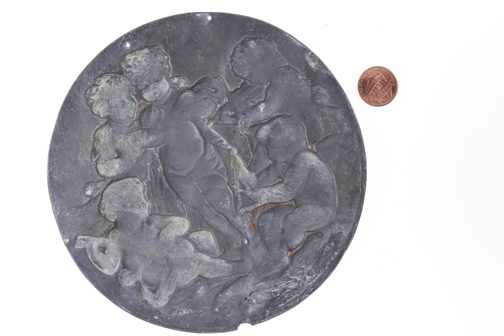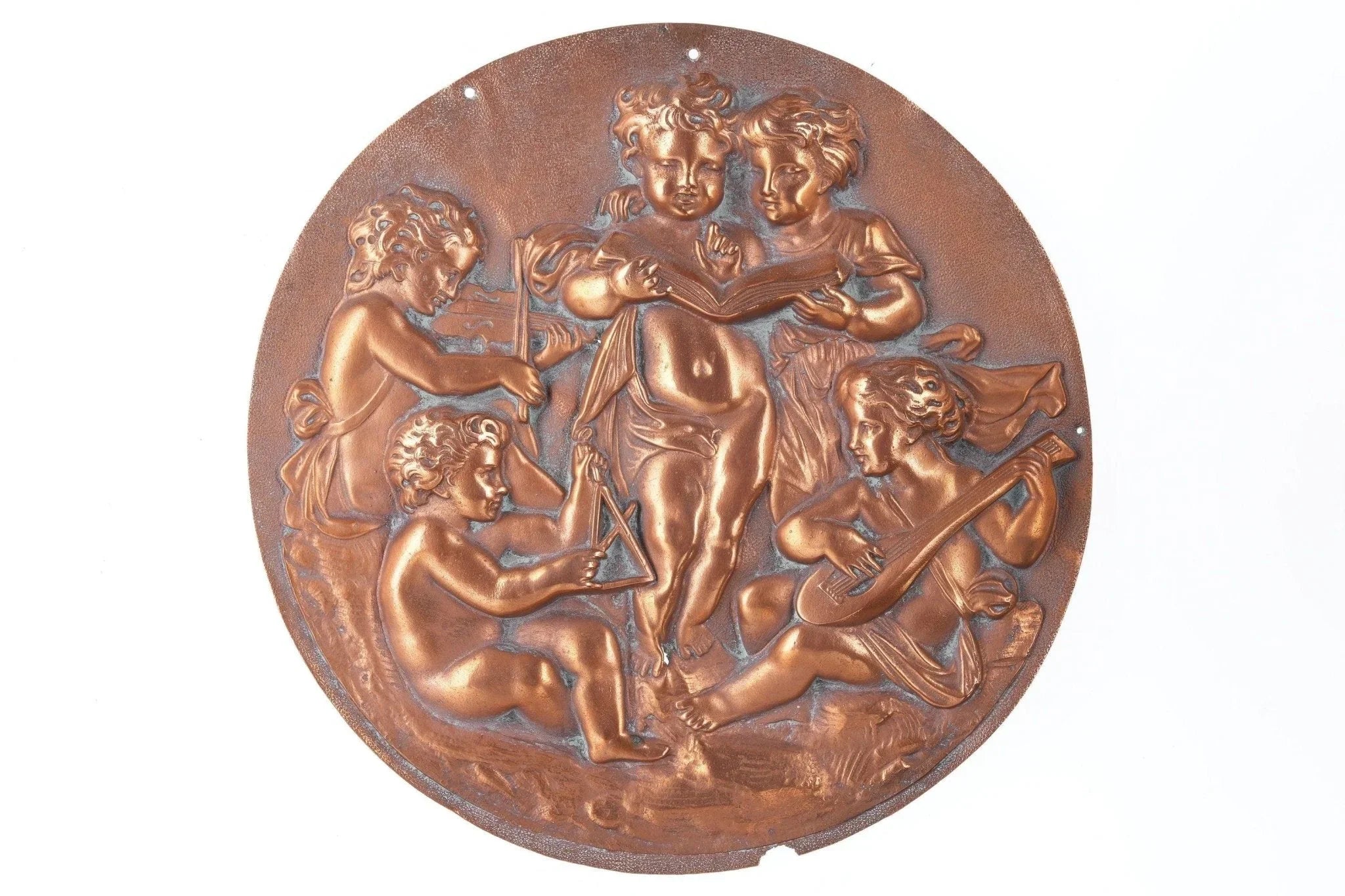Antique copper relief plaque with cherubs. 19th century, just under 6" wide, minor loss at bottom center, three holes for hanging possibly not original. isshelf