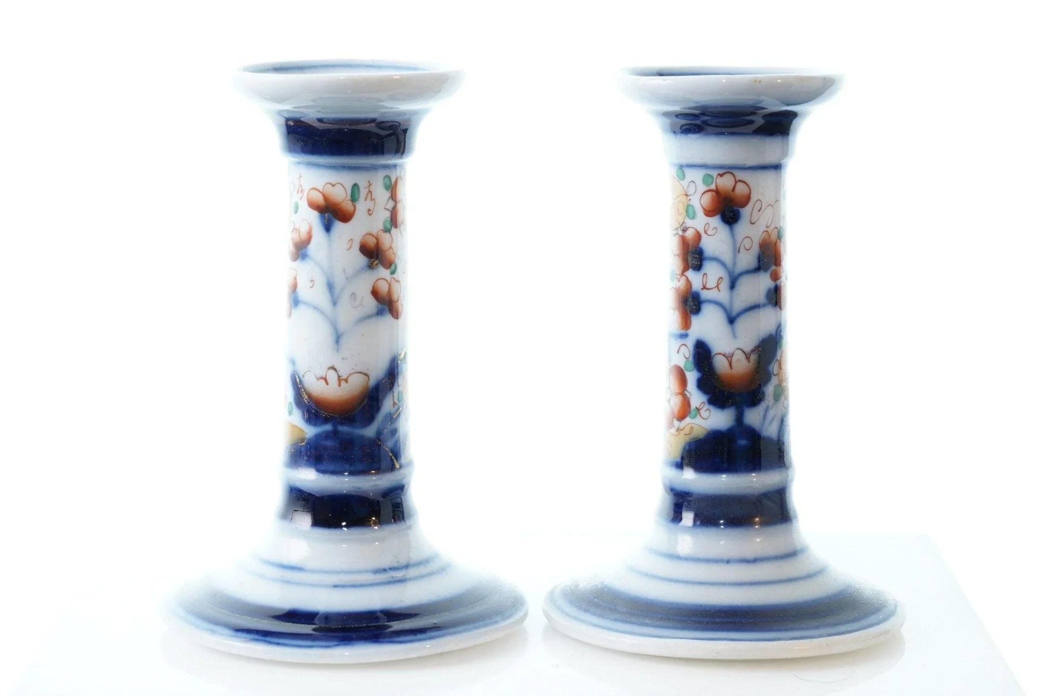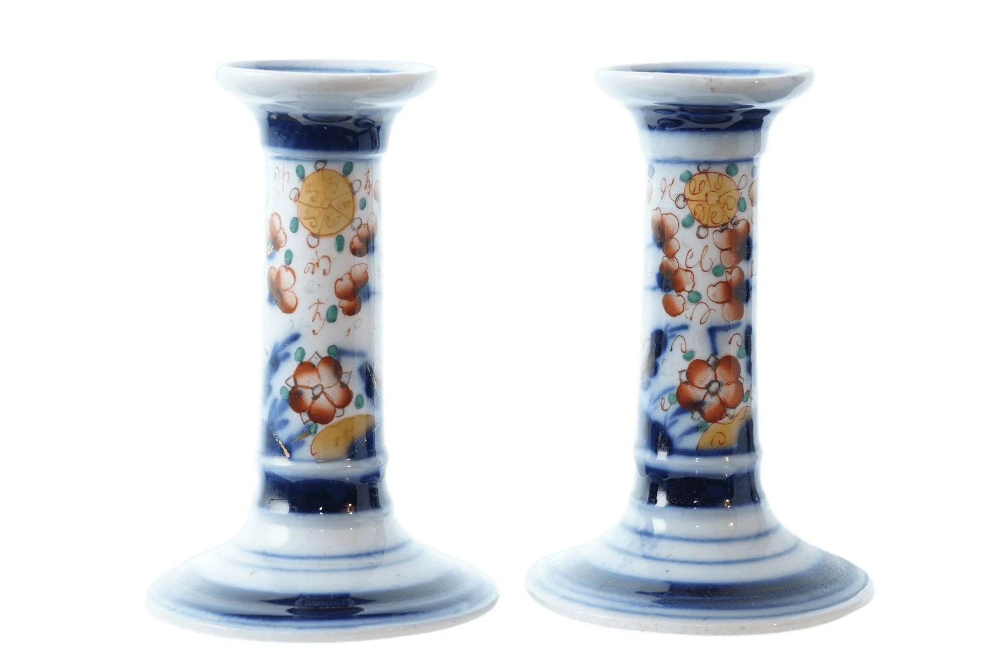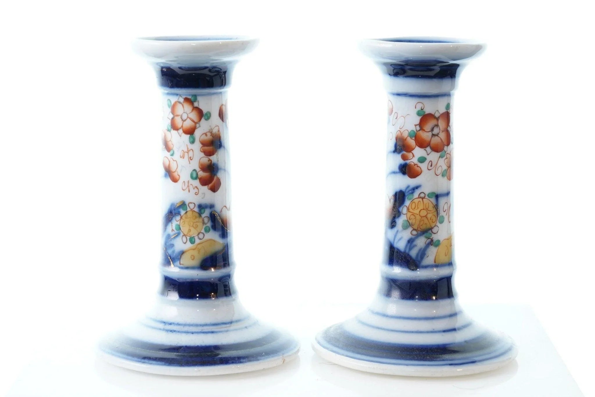 c1880 French Old Paris Imari Palette Candlesticks. No cracks, chips, or other issues. 4 5/8" tall.