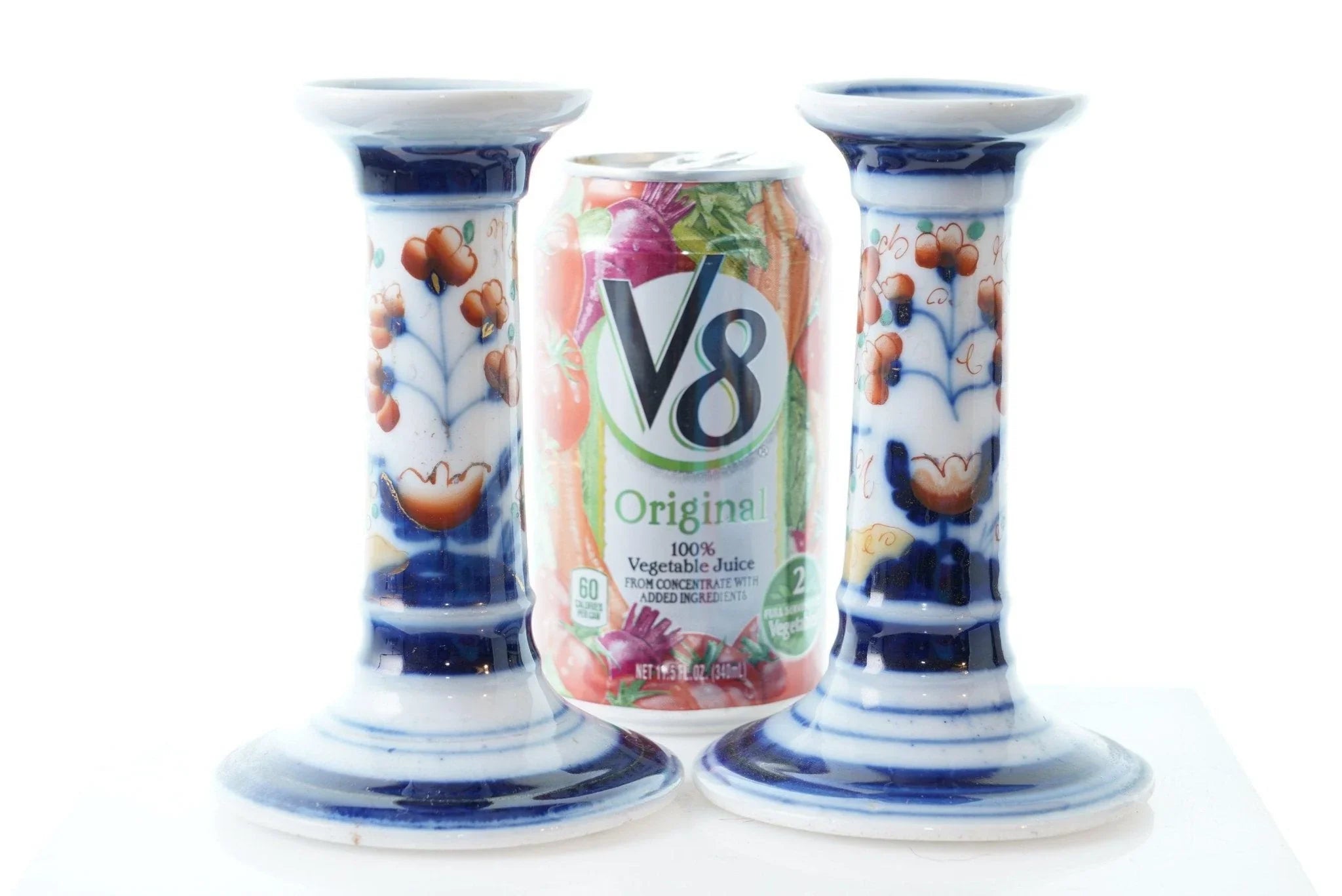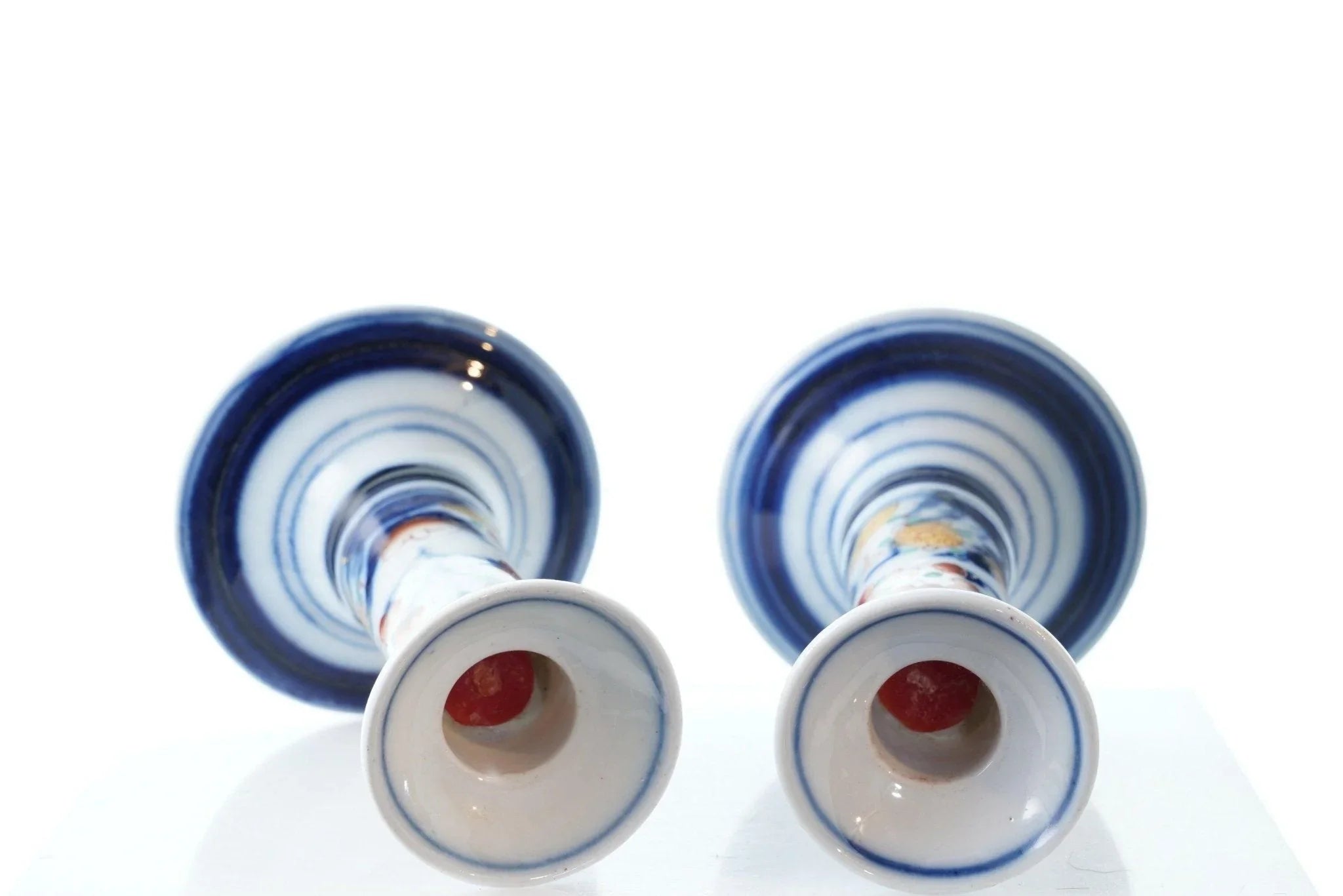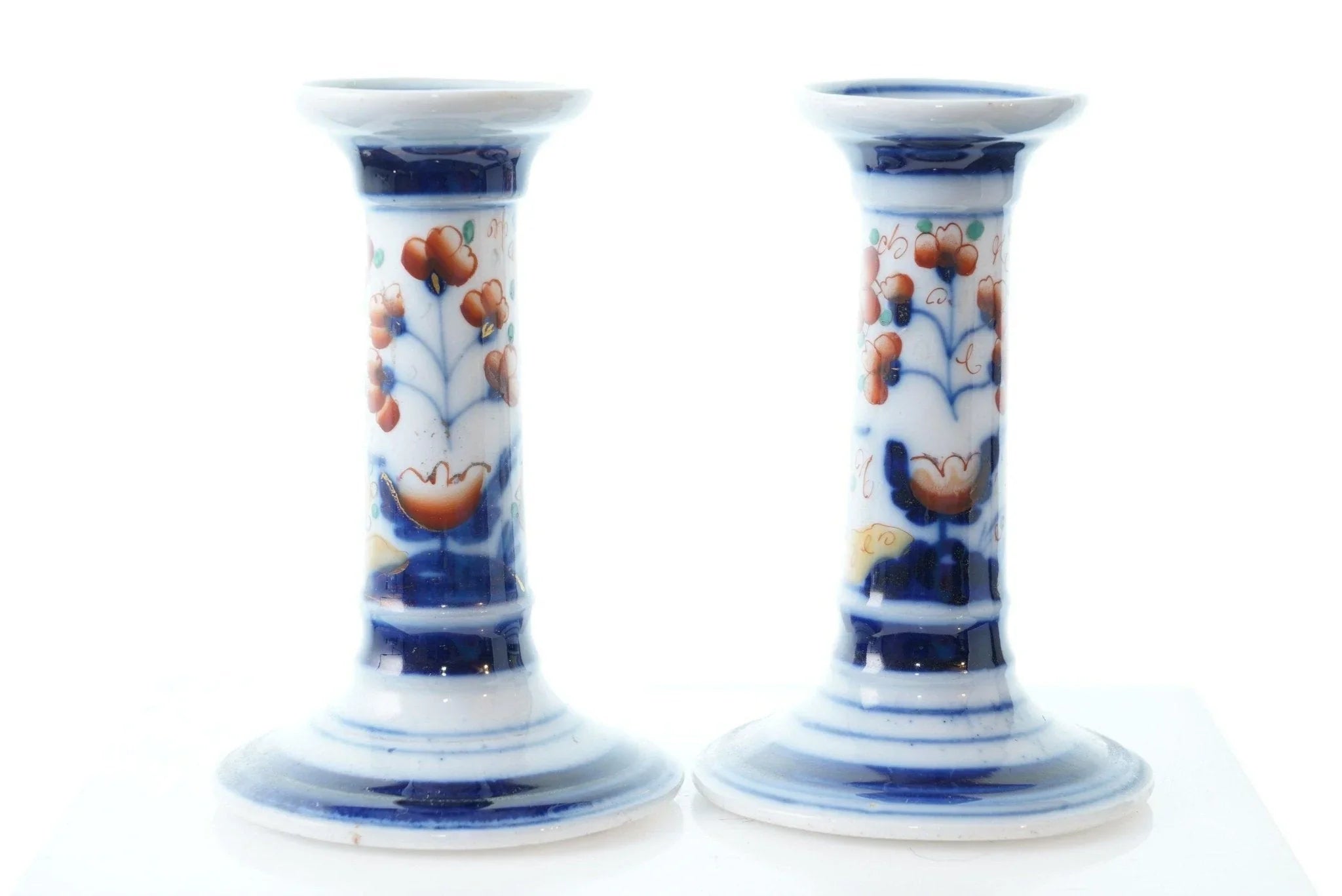 c1880 French Old Paris Imari Palette Candlesticks. No cracks, chips, or other issues. 4 5/8" tall.
