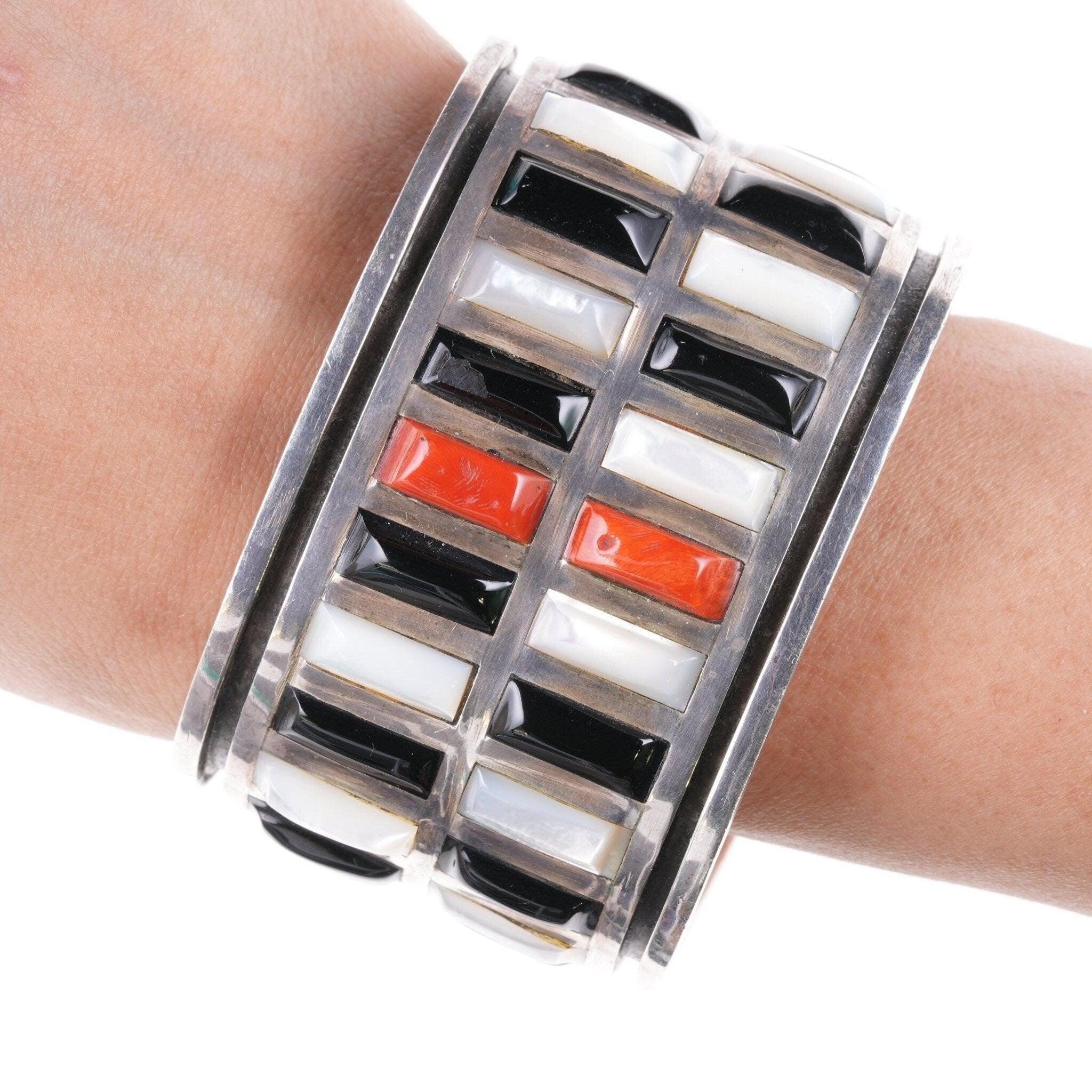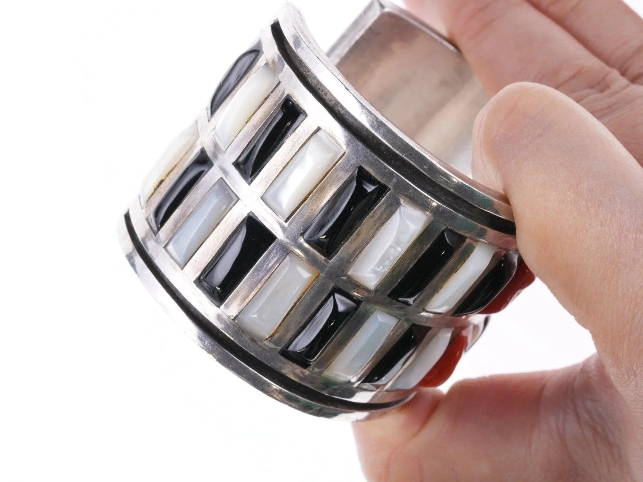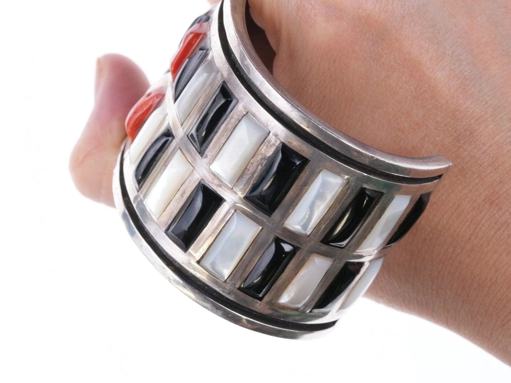 6 7/8" Jimmie King Jr Navajo silver Coral, onyx, and Shell channel inlay Cuff<br>Bracelet. 190.4 grams, fits up to a 6 7/8" wrist including the gap.<br><br><br><br><br>For over a quarter of a century, Navajo silver and goldsmith Jimmie King, Jr.<br>excited the imagination of jewelry lovers. His unique heavy metal work style and<br>delicate inlay earned him a reputation as a master jeweler.<br><br>His work is a combination of strength and delicacy. The most common reaction<br>when people first pick up a piece of his work is to comment on the weight of the<br>jewelry. It feels substantial. It is inlaid with precision and color awareness,<br>marking it as King's alone. King was particular about his work, refusing to<br>hurry a piece and willing to melt it down if unsatisfied with the result. Every<br>piece is hand-built and finished.<br><br>He lived and worked just off the northern edge of the Navajo reservation near<br>Farmington, New Mexico. His interests included reading, learning new things, and<br>listening to opera as he created his jewelry.<br><br>King created the inlay cube, the solid link bracelet with an inlaid clasp, and<br>the "Sky High" bracelet. He has won top awards at the Gallup Intertribal<br>Ceremonial and featured in several books and magazines about Native American<br>art. His jewelry is signed in cursive "JR" for his name's first and last<br>initials. Six dots in a semi-circle above the letters stand for the six sacred<br>directions: North, East, South, West, the Sky, and the Earth.<br><br>Years ago, in a ceremony, a medicine man told him that if he put these dots on<br>his jewelry, everything would go well for Jimmie - it appears he was right.<br><br><br><br><br>All precious metals are tested and guaranteed, any Native American jewelry<br>referred to as Silver or Sterling is guaranteed to be a minimum of 90% (coin)<br>silver and possibly higher content. Anything marked is guaranteed to be what<br>it's marked, most bracelets are photographed on a 6" wrist (non hairy), rings<br>photographed on the appropriate sized finger when possible. With bracelets if<br>the measurement is not given in the description then inside circumference is<br>shown where the metal meets the number on the the cloth tape measure.