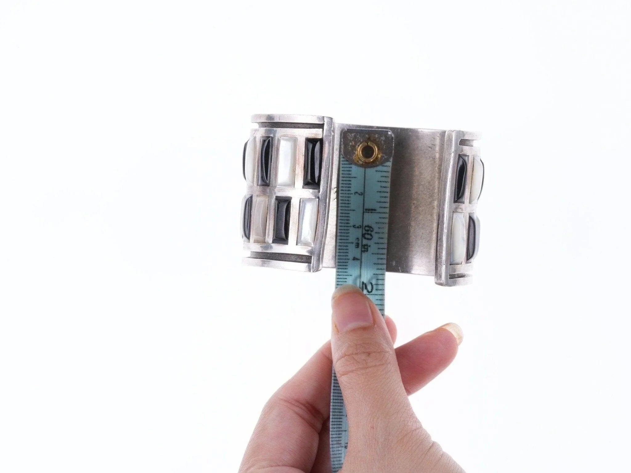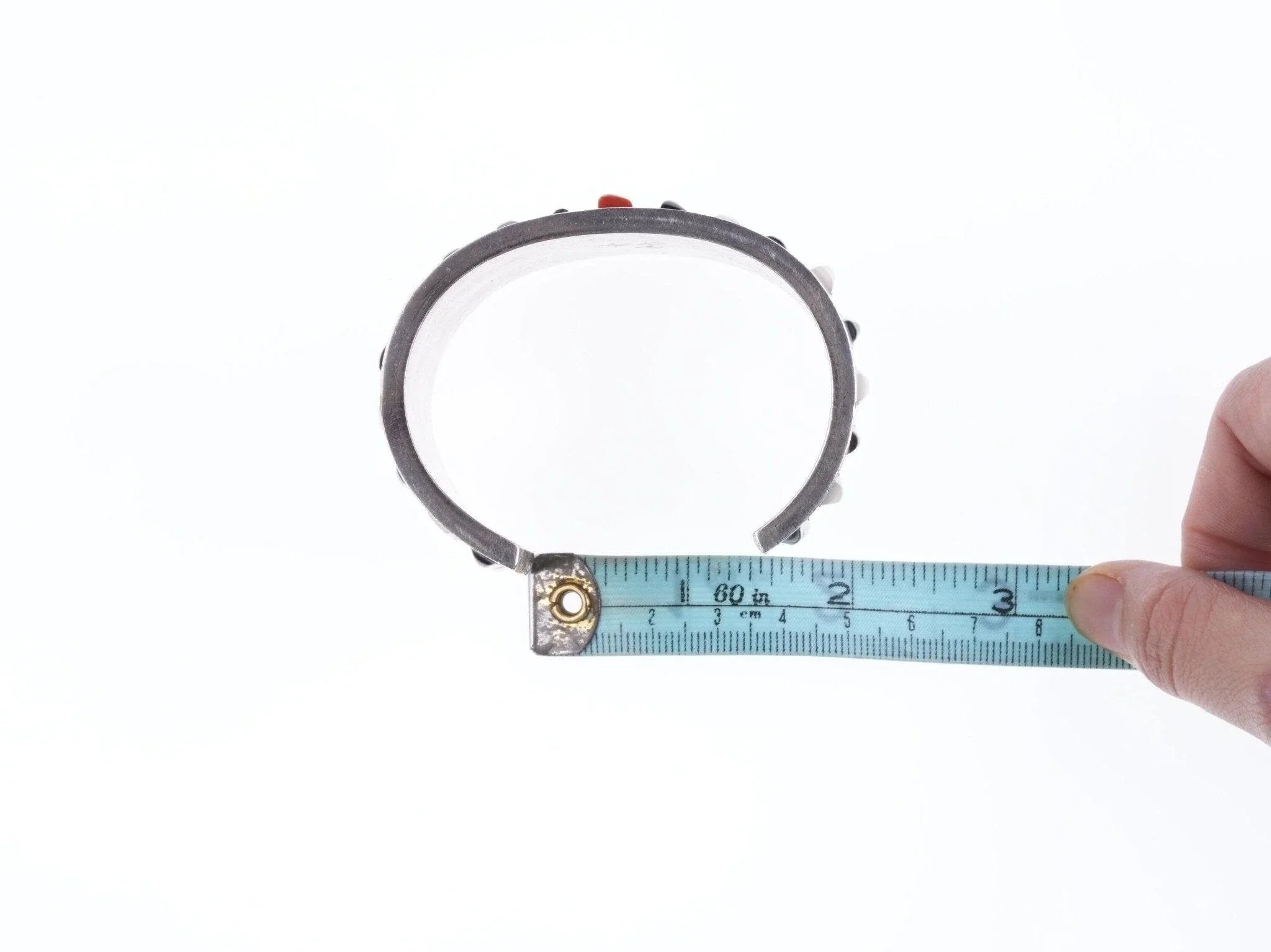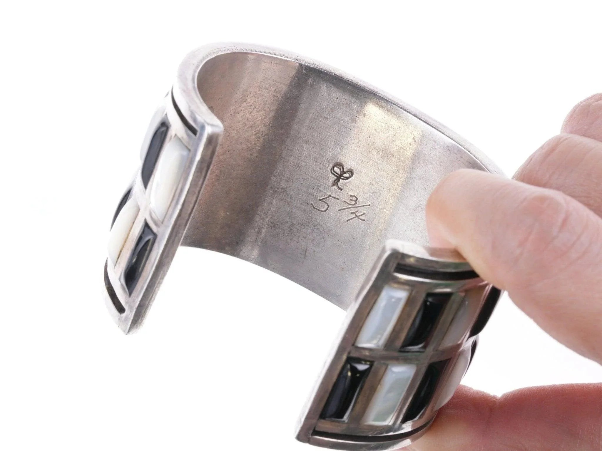 6 7/8" Jimmie King Jr Navajo silver Coral, onyx, and Shell channel inlay Cuff<br>Bracelet. 190.4 grams, fits up to a 6 7/8" wrist including the gap.<br><br><br><br><br>For over a quarter of a century, Navajo silver and goldsmith Jimmie King, Jr.<br>excited the imagination of jewelry lovers. His unique heavy metal work style and<br>delicate inlay earned him a reputation as a master jeweler.<br><br>His work is a combination of strength and delicacy. The most common reaction<br>when people first pick up a piece of his work is to comment on the weight of the<br>jewelry. It feels substantial. It is inlaid with precision and color awareness,<br>marking it as King's alone. King was particular about his work, refusing to<br>hurry a piece and willing to melt it down if unsatisfied with the result. Every<br>piece is hand-built and finished.<br><br>He lived and worked just off the northern edge of the Navajo reservation near<br>Farmington, New Mexico. His interests included reading, learning new things, and<br>listening to opera as he created his jewelry.<br><br>King created the inlay cube, the solid link bracelet with an inlaid clasp, and<br>the "Sky High" bracelet. He has won top awards at the Gallup Intertribal<br>Ceremonial and featured in several books and magazines about Native American<br>art. His jewelry is signed in cursive "JR" for his name's first and last<br>initials. Six dots in a semi-circle above the letters stand for the six sacred<br>directions: North, East, South, West, the Sky, and the Earth.<br><br>Years ago, in a ceremony, a medicine man told him that if he put these dots on<br>his jewelry, everything would go well for Jimmie - it appears he was right.<br><br><br><br><br>All precious metals are tested and guaranteed, any Native American jewelry<br>referred to as Silver or Sterling is guaranteed to be a minimum of 90% (coin)<br>silver and possibly higher content. Anything marked is guaranteed to be what<br>it's marked, most bracelets are photographed on a 6" wrist (non hairy), rings<br>photographed on the appropriate sized finger when possible. With bracelets if<br>the measurement is not given in the description then inside circumference is<br>shown where the metal meets the number on the the cloth tape measure.