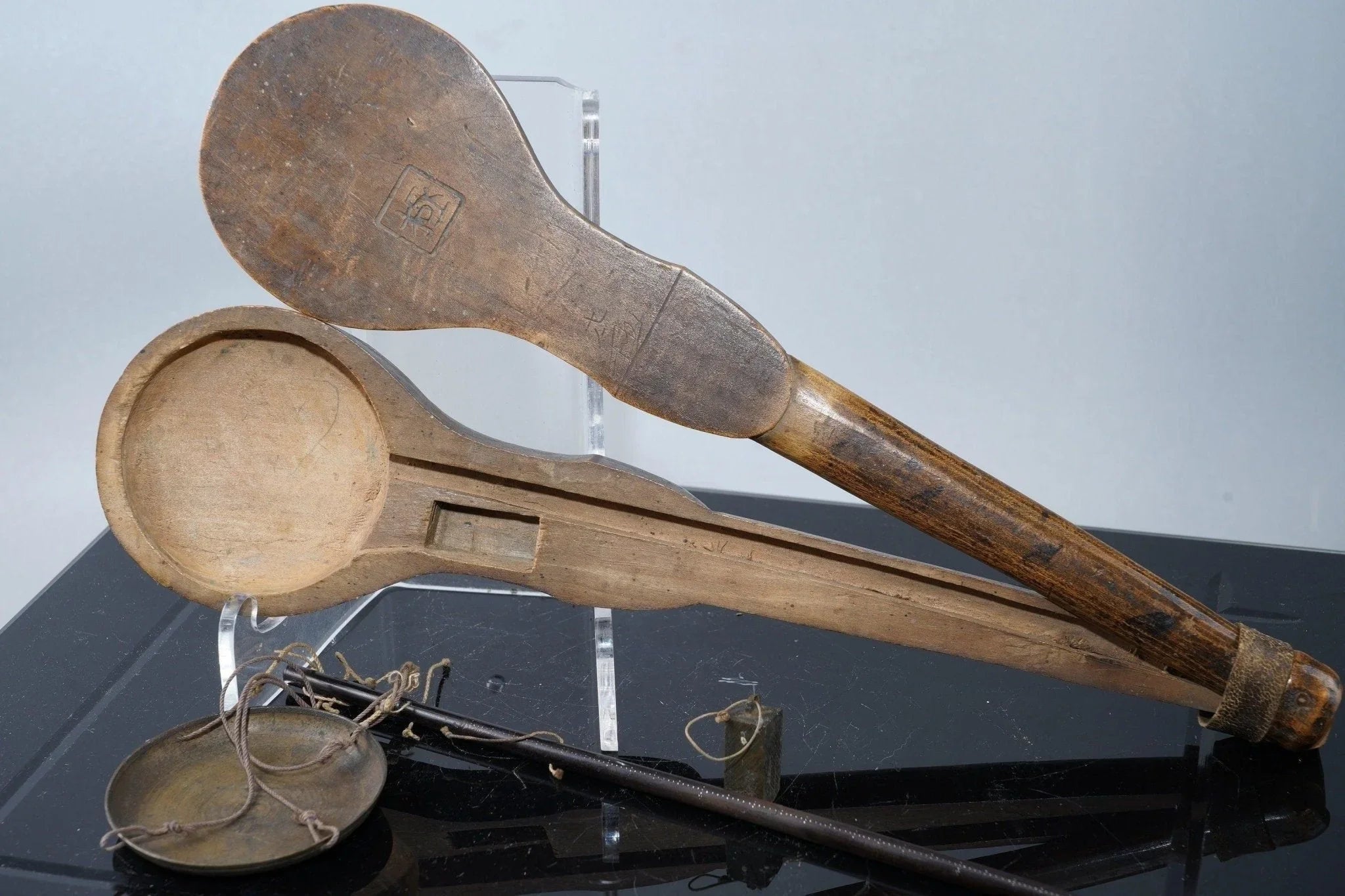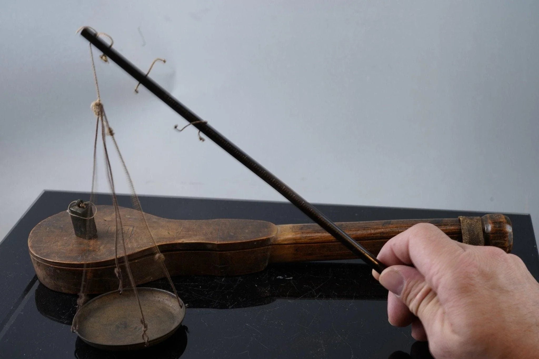 c1880 Antique Chinese Opium Scales. Very cool set with an incredible patina. Case measures 13.75" long x 3.5" wide no issues or damage. Difficult to find with the counterweight and leather that keeps it together intact. Lots of writing Front, back, and inside brass plate, nicely carved also.