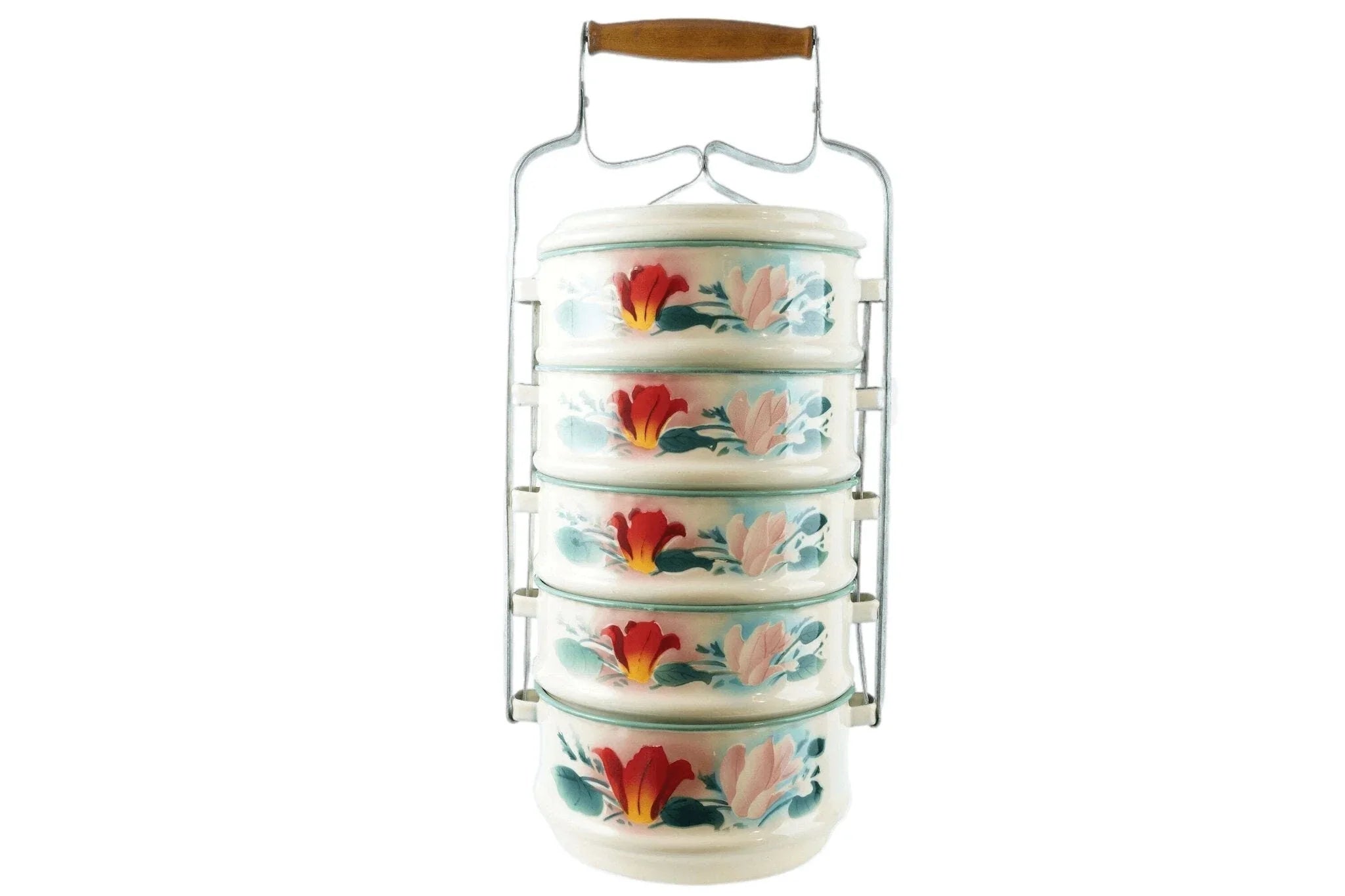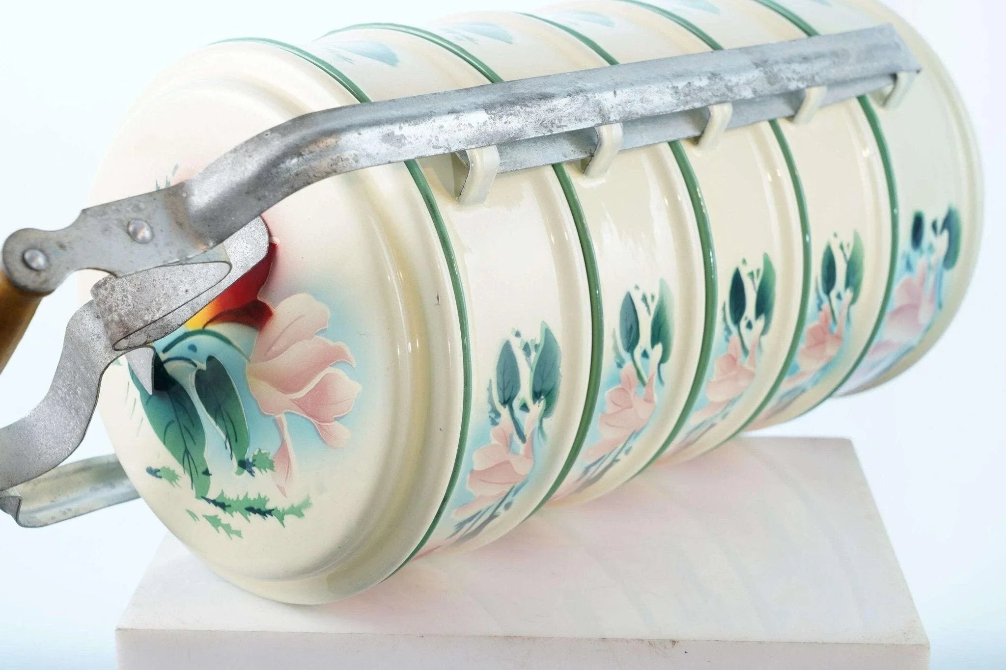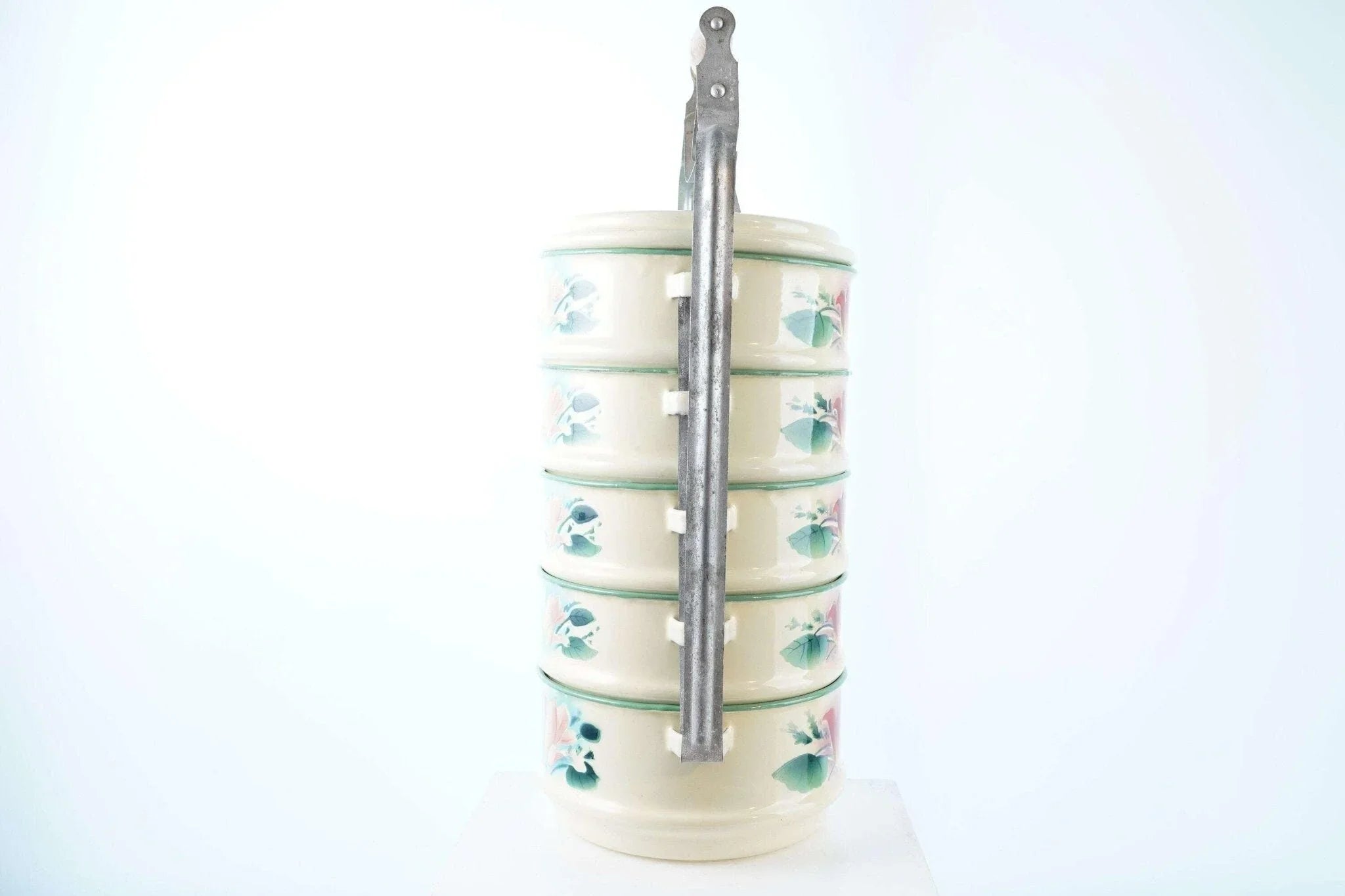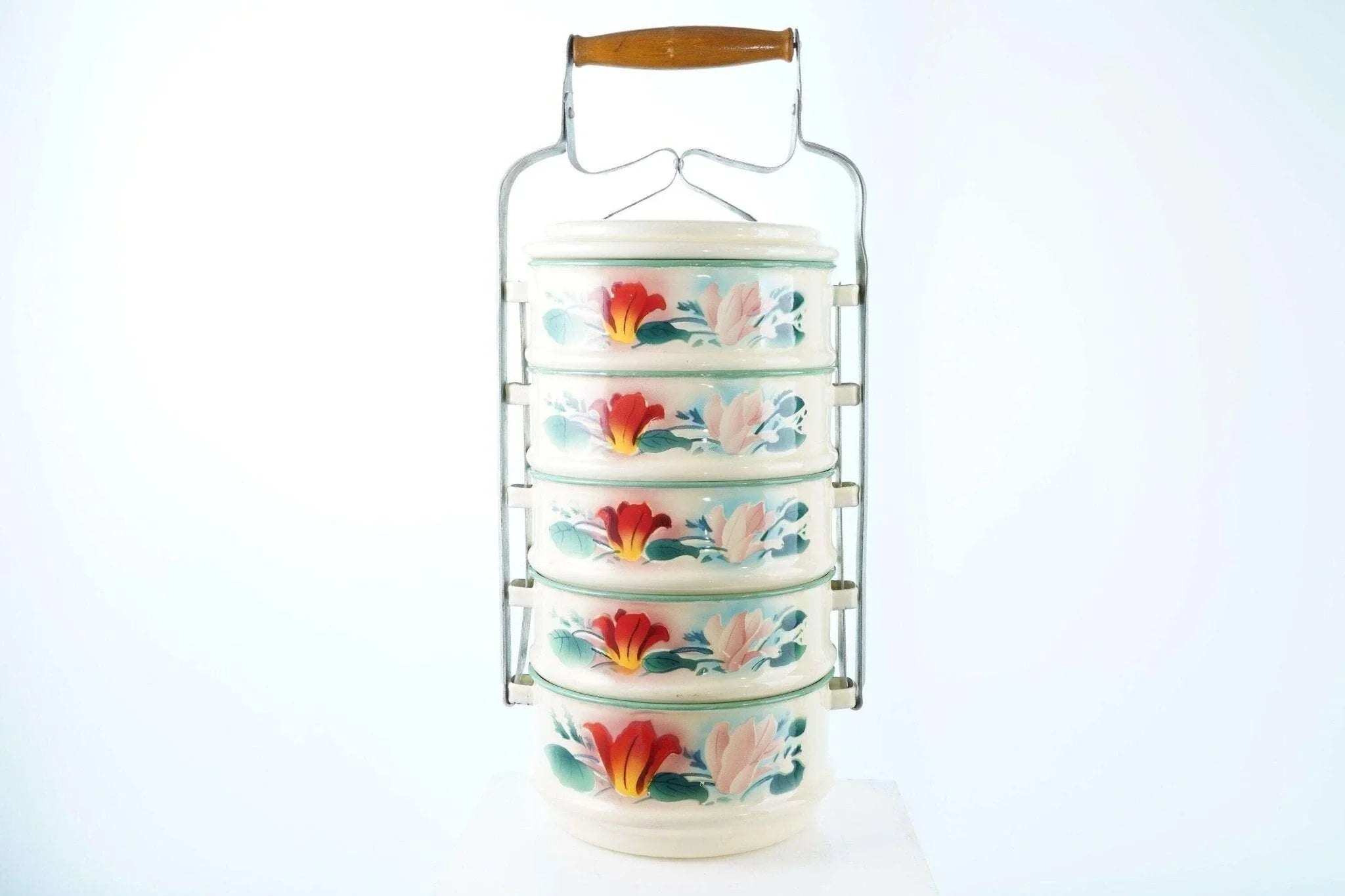 c1950's Mid Century Chinese Stacking dim sum/food server. Unusual item from the<br>mid 20th century in near mint condition. The insides of every pot are just as<br>clean as the exterior shown. Handle swivels to unlock and unload bowls. 12oz v8<br>can for scale. 7.5" wide x 16" tall with holder. Marked Balance brand made in<br>china. This was caked up with 40 years of dirt and grease when I got it, I have<br>thoroughly cleaned it inside and out. I don't typically put vintage items in the<br>dishwasher but these did fine, I didn't put the holder in of course.<br>isshelf