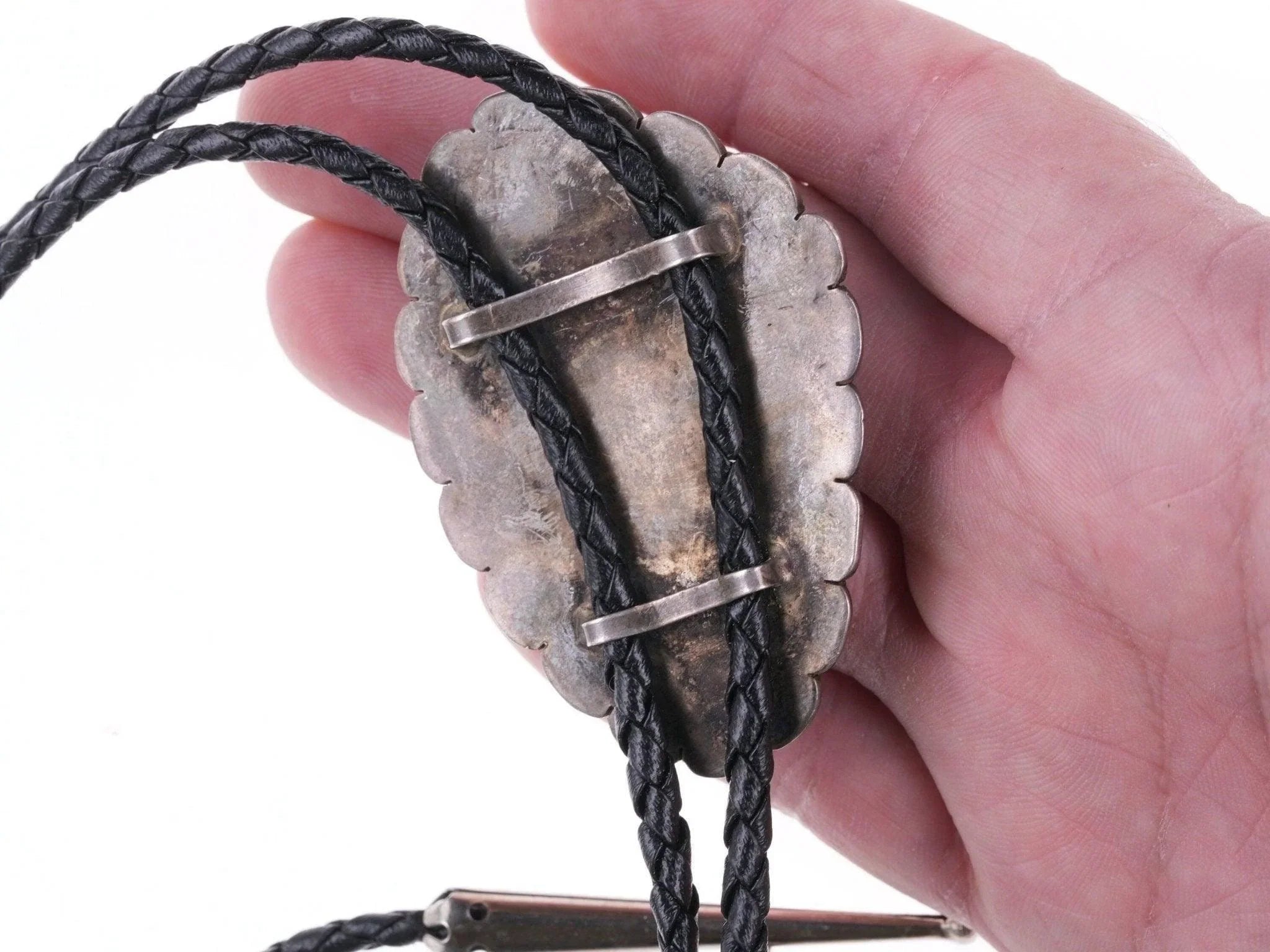 40's-50's Zuni Carved Leaf Silver bolo tie. Bolo slide 2 5/8" x 1 7/8" 36" long<br>cord, cord and tips are fairly modern. 60.4 grams total.<br><br>All precious metals are tested and guaranteed, any Native American jewelry<br>referred to as Silver or Sterling is guaranteed to be a minimum of 90% (coin)<br>silver and possibly higher content. Anything marked is guaranteed to be what<br>it's marked, most bracelets are photographed on a 6" wrist, rings photographed<br>on the appropriate sized finger when possible. With bracelets if the measurement<br>is not given in the description then inside circumference is shown where the<br>metal meets the number on the the cloth tape measure.