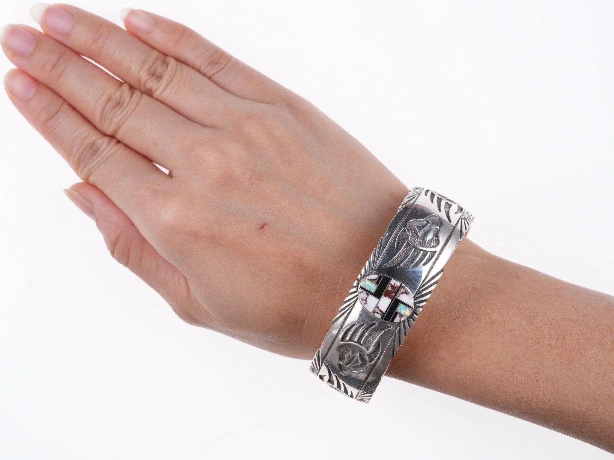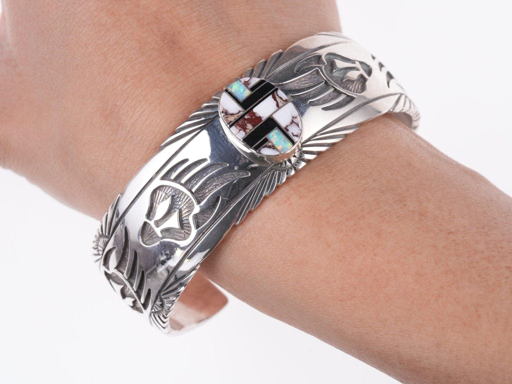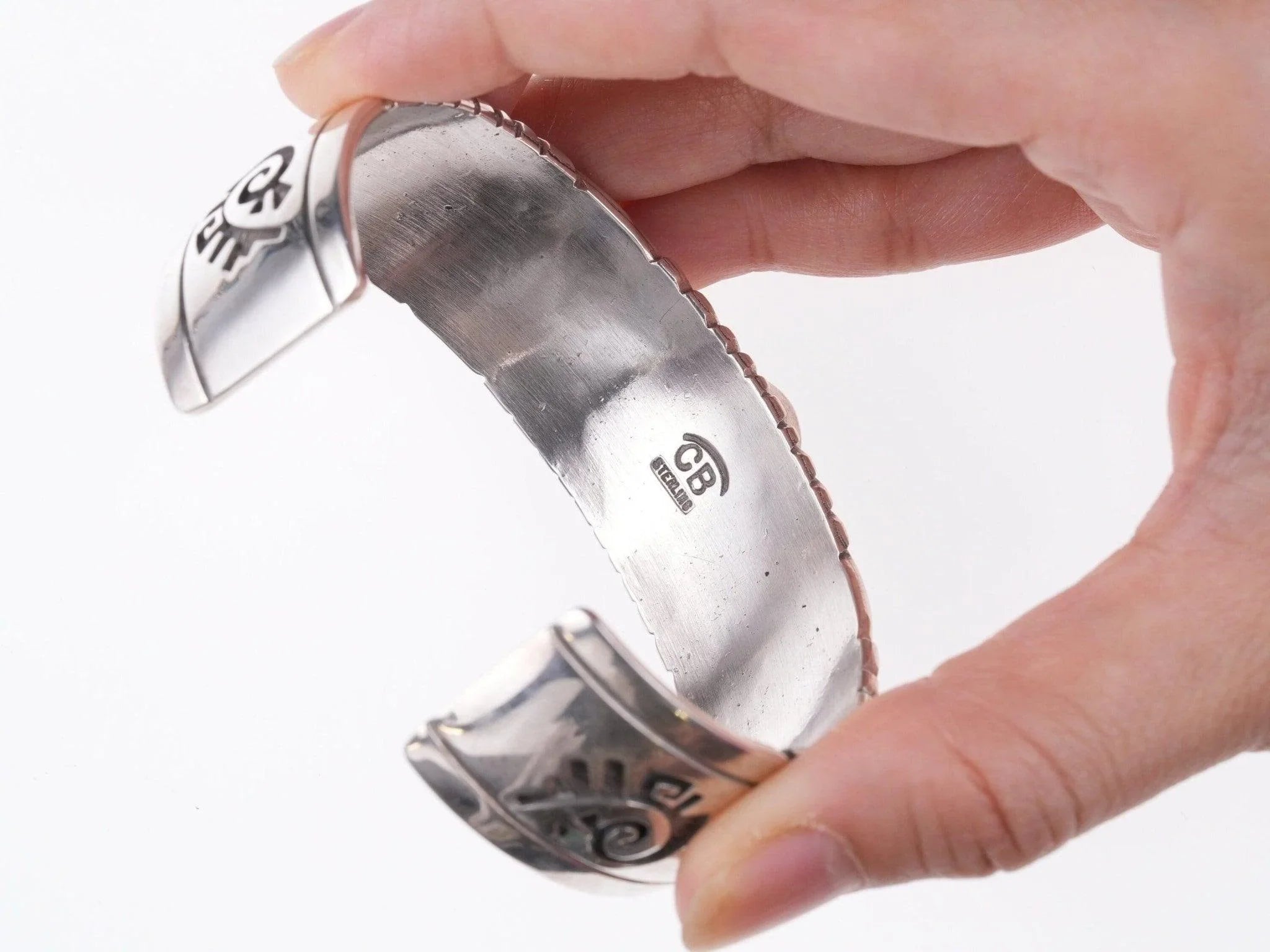 7.5" Charlie Bowie Navajo Channel inlay Sterling silver overlay style bracelet.<br>Great bracelet with no issues.<br><br>All precious metals are tested and guaranteed, any Native American jewelry<br>referred to as Silver or Sterling is guaranteed to be a minimum of 90% (coin)<br>silver and possibly higher content. Anything marked is guaranteed to be what<br>it's marked, most bracelets are photographed on a 6" wrist (non hairy), rings<br>photographed on the appropriate sized finger when possible. With bracelets if<br>the measurement is not given in the description then inside circumference is<br>shown where the metal meets the number on the the cloth tape measure.