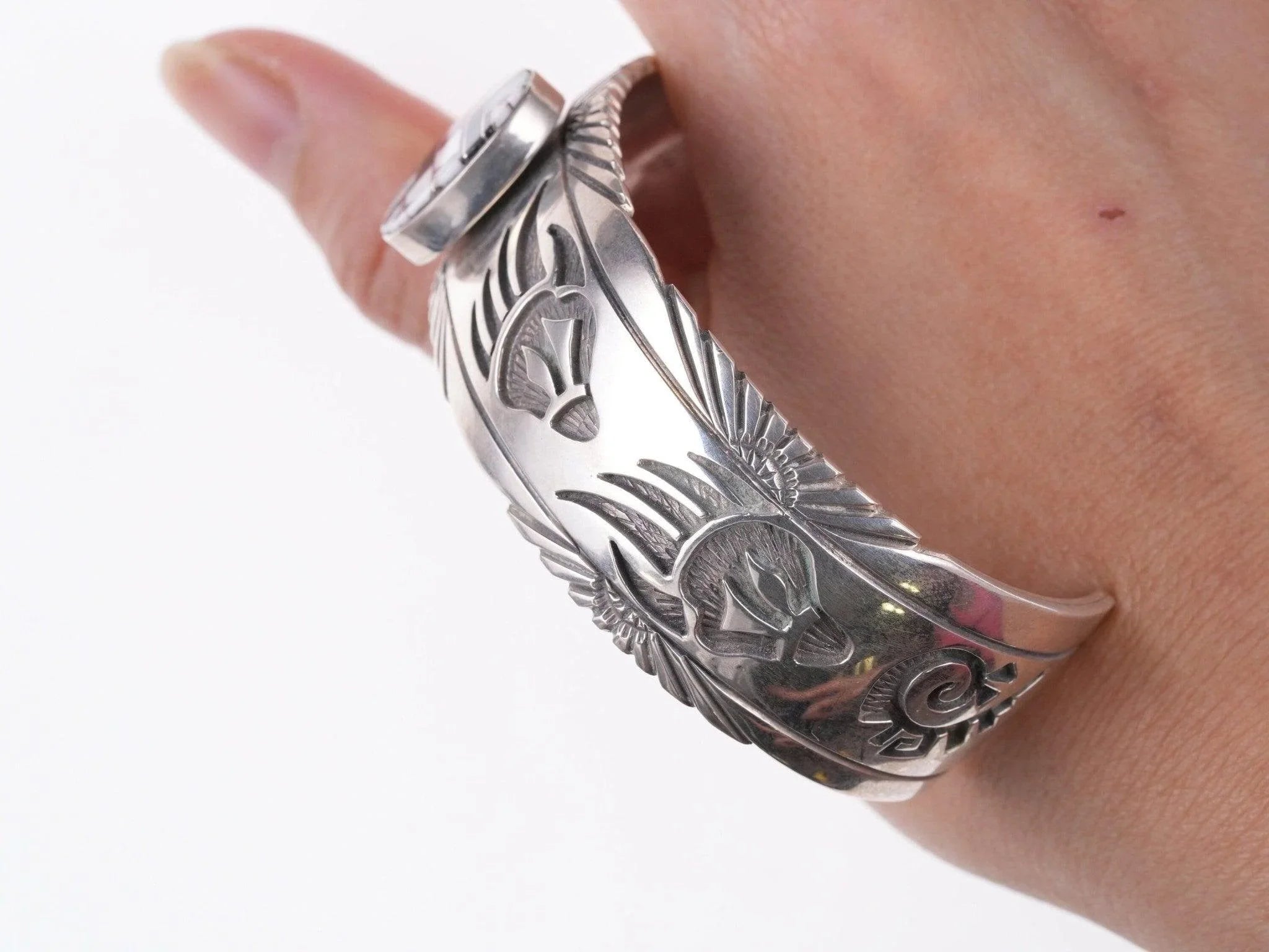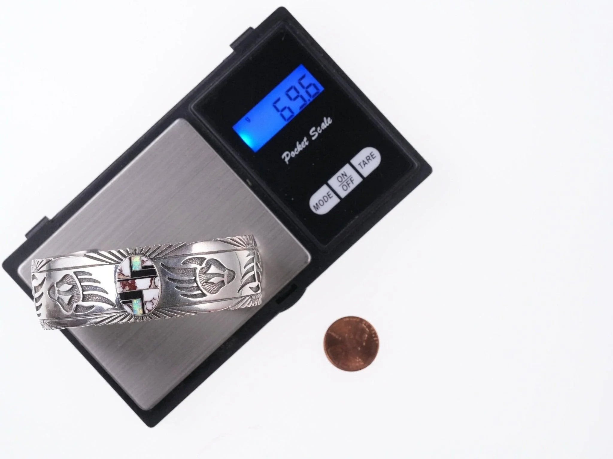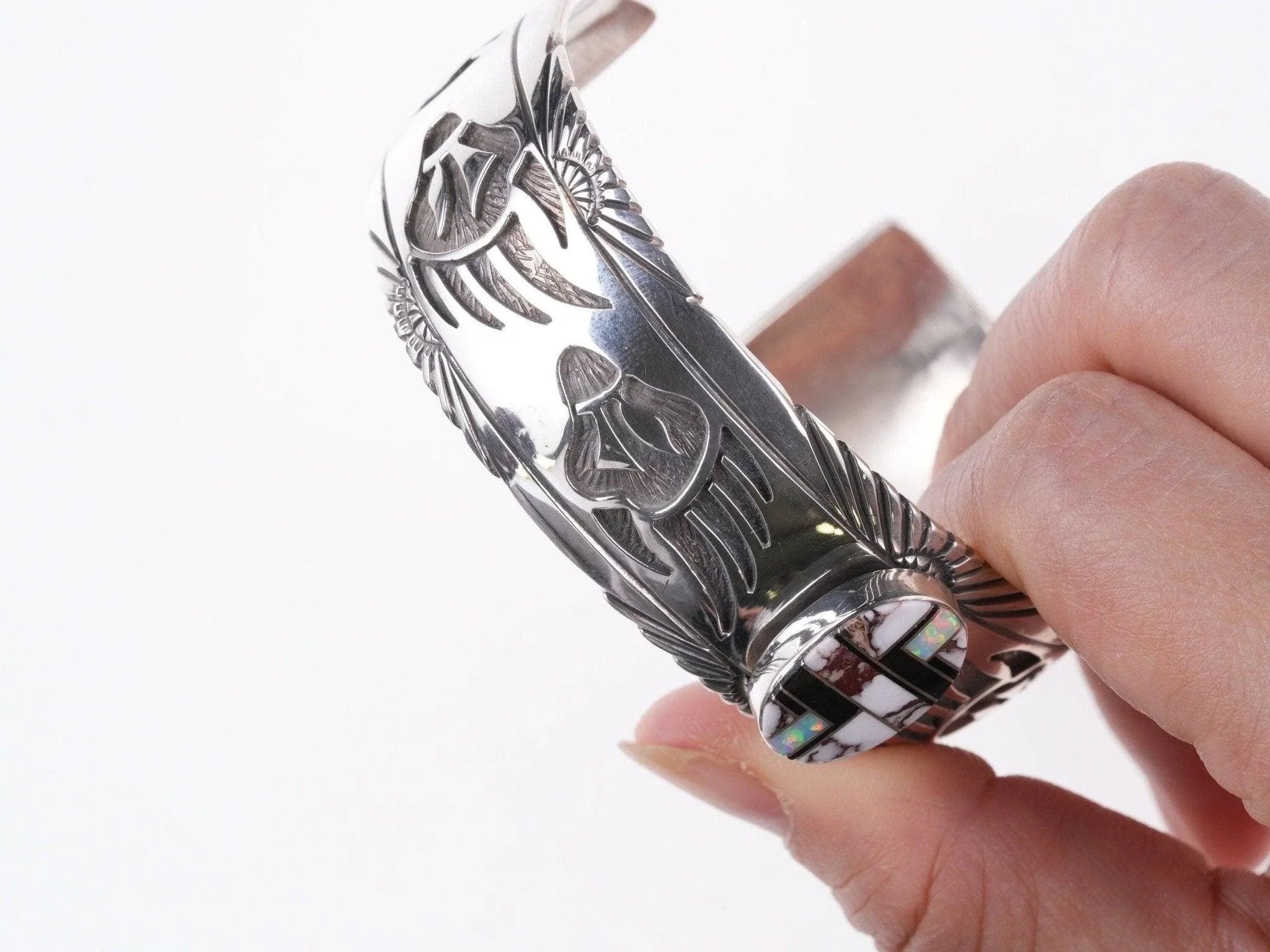 7.5" Charlie Bowie Navajo Channel inlay Sterling silver overlay style bracelet.<br>Great bracelet with no issues.<br><br>All precious metals are tested and guaranteed, any Native American jewelry<br>referred to as Silver or Sterling is guaranteed to be a minimum of 90% (coin)<br>silver and possibly higher content. Anything marked is guaranteed to be what<br>it's marked, most bracelets are photographed on a 6" wrist (non hairy), rings<br>photographed on the appropriate sized finger when possible. With bracelets if<br>the measurement is not given in the description then inside circumference is<br>shown where the metal meets the number on the the cloth tape measure.