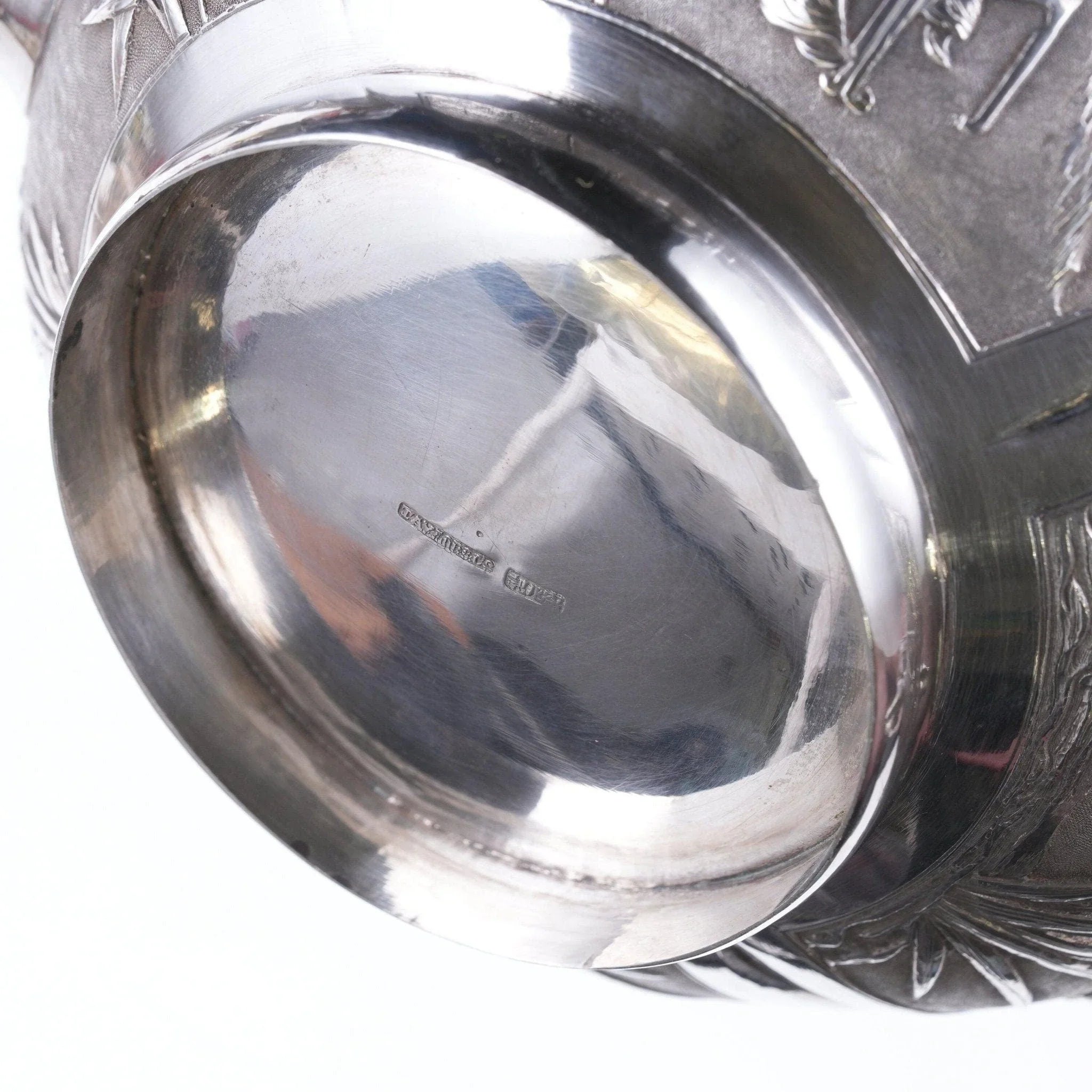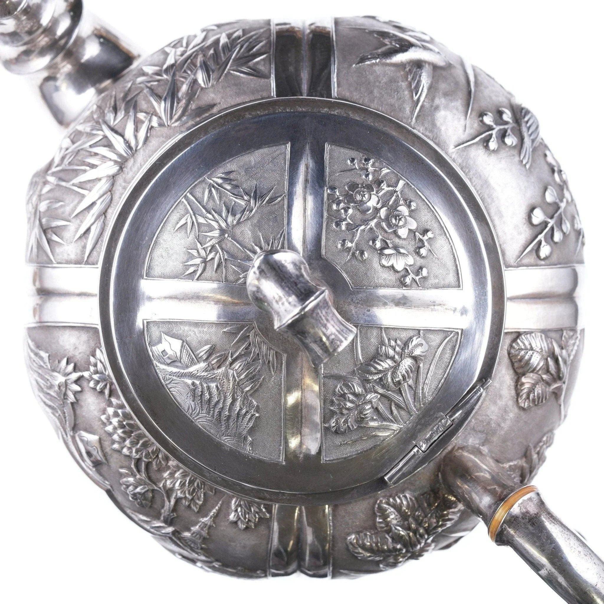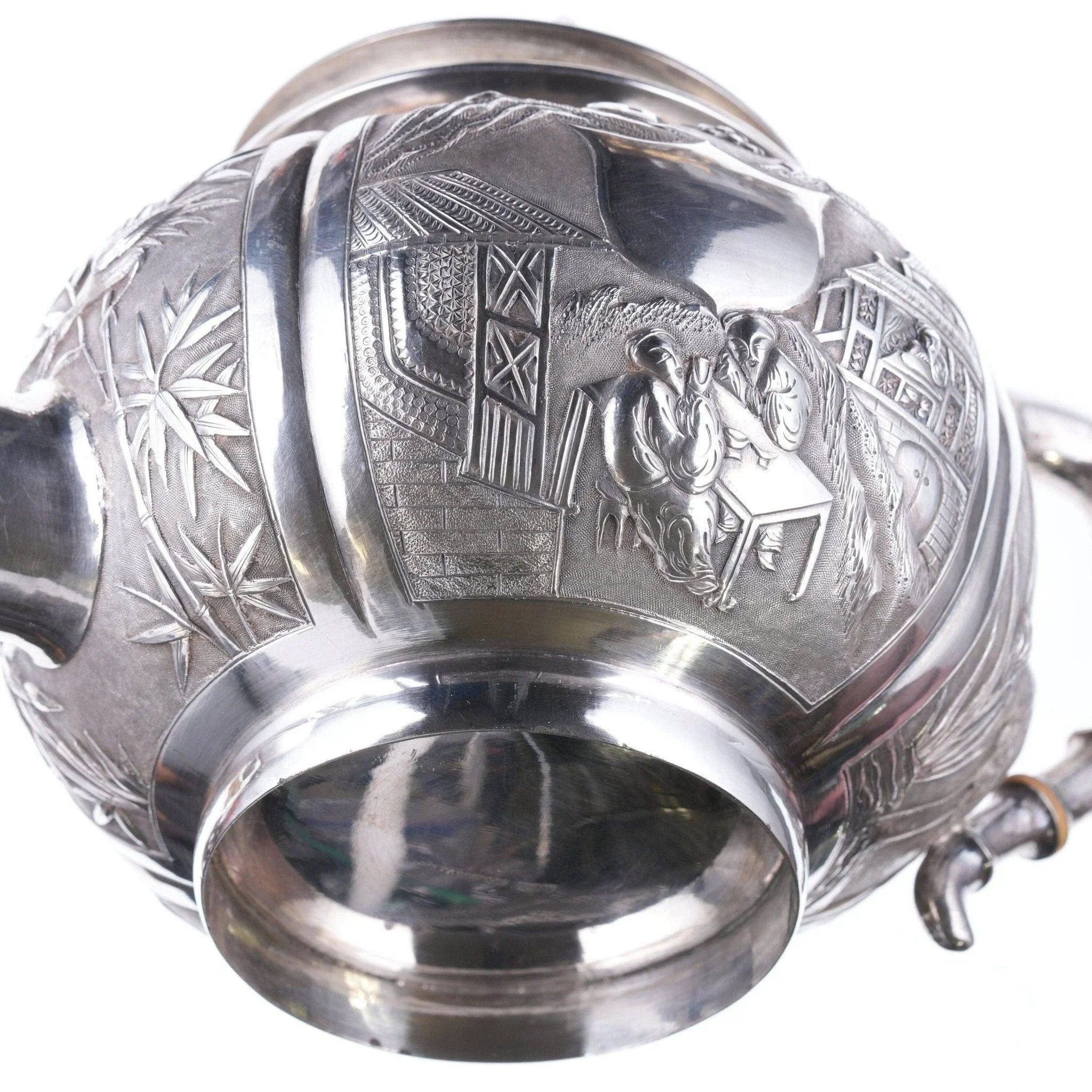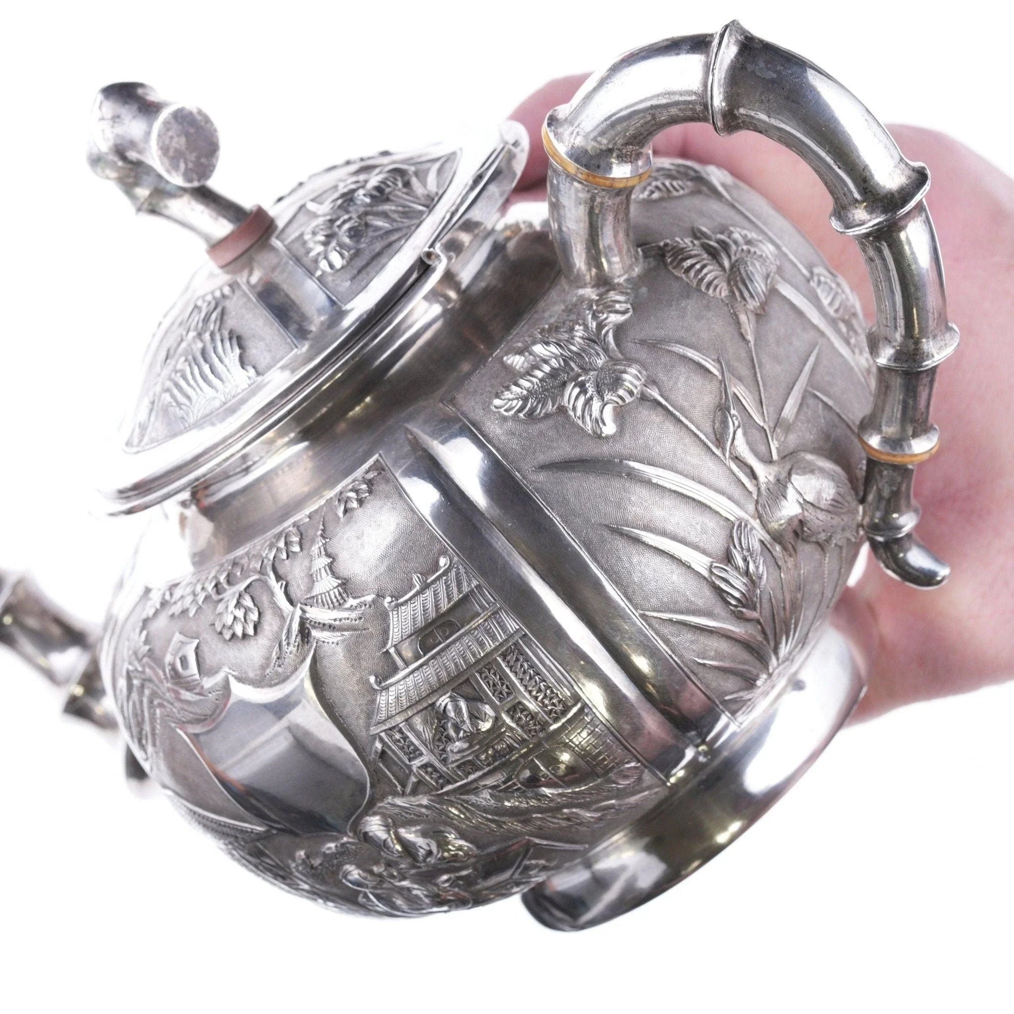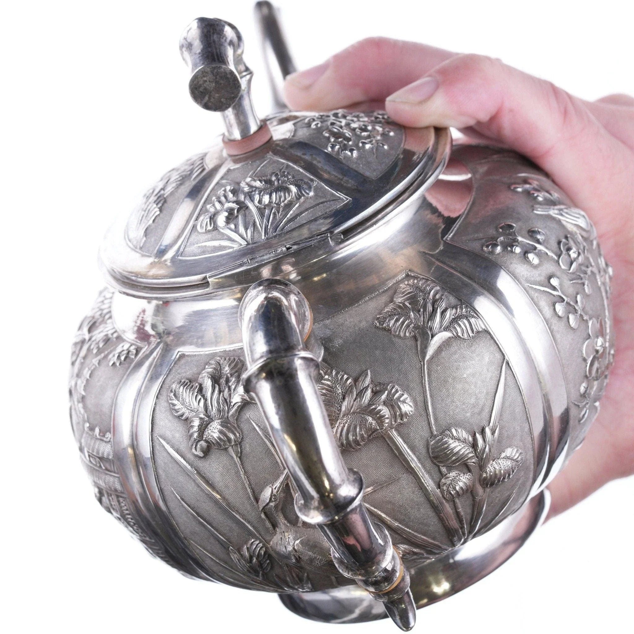 Antique Chinese Export silver Teapot with amazing repousse work. Built in<br>strainer in teapot, I was only allowed 10 pics. No dents, bends, scratches or<br>other issues. Late 19th century, Chinese, solid 90%+ silver. 10.5" handle to<br>spout x 6.5" tall with finial. 618 grams.