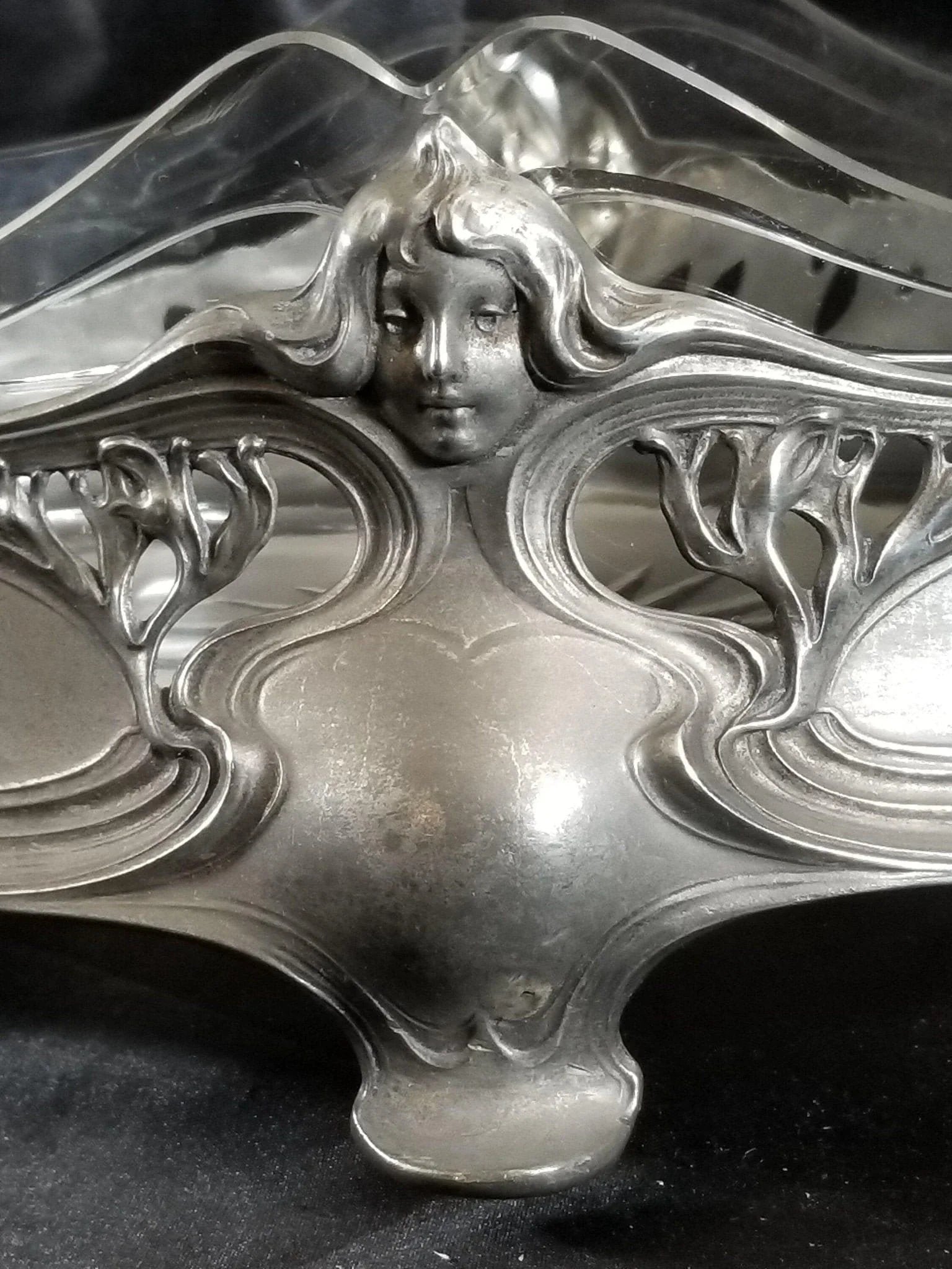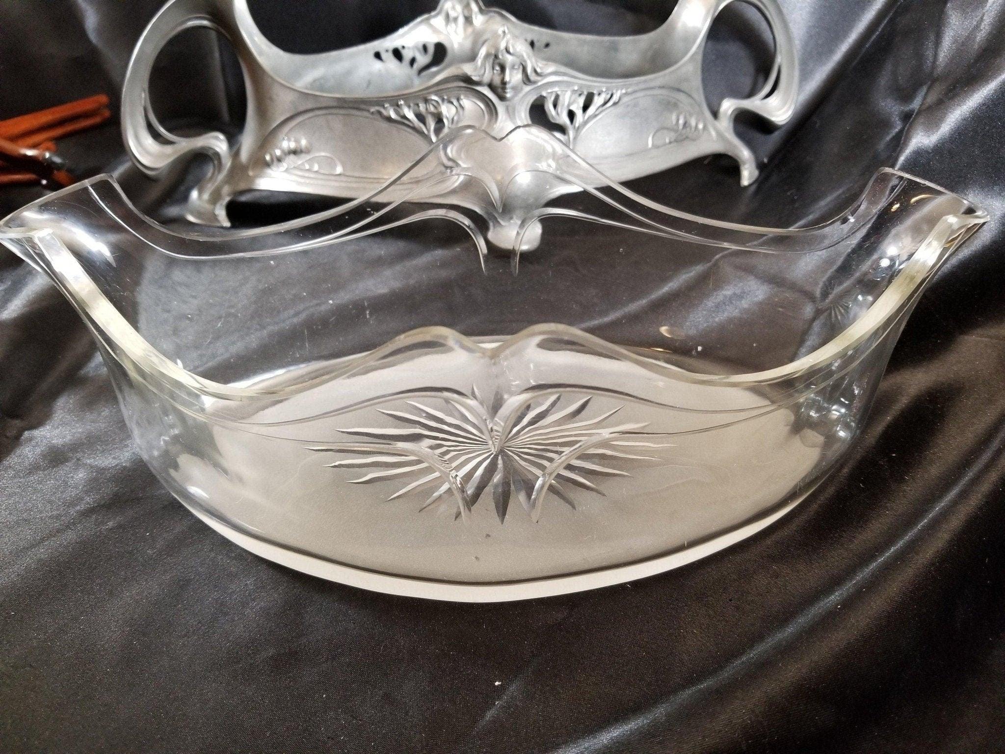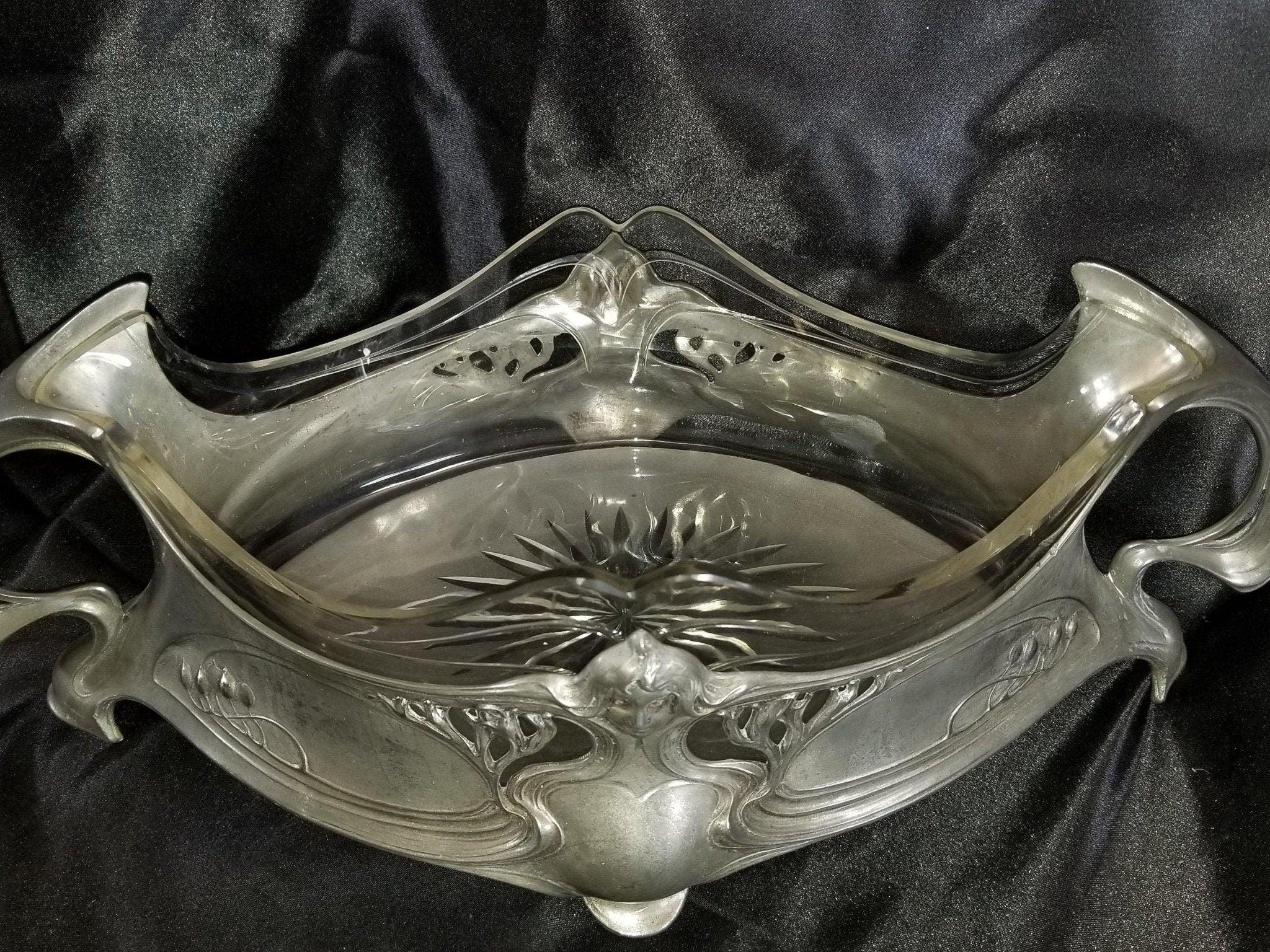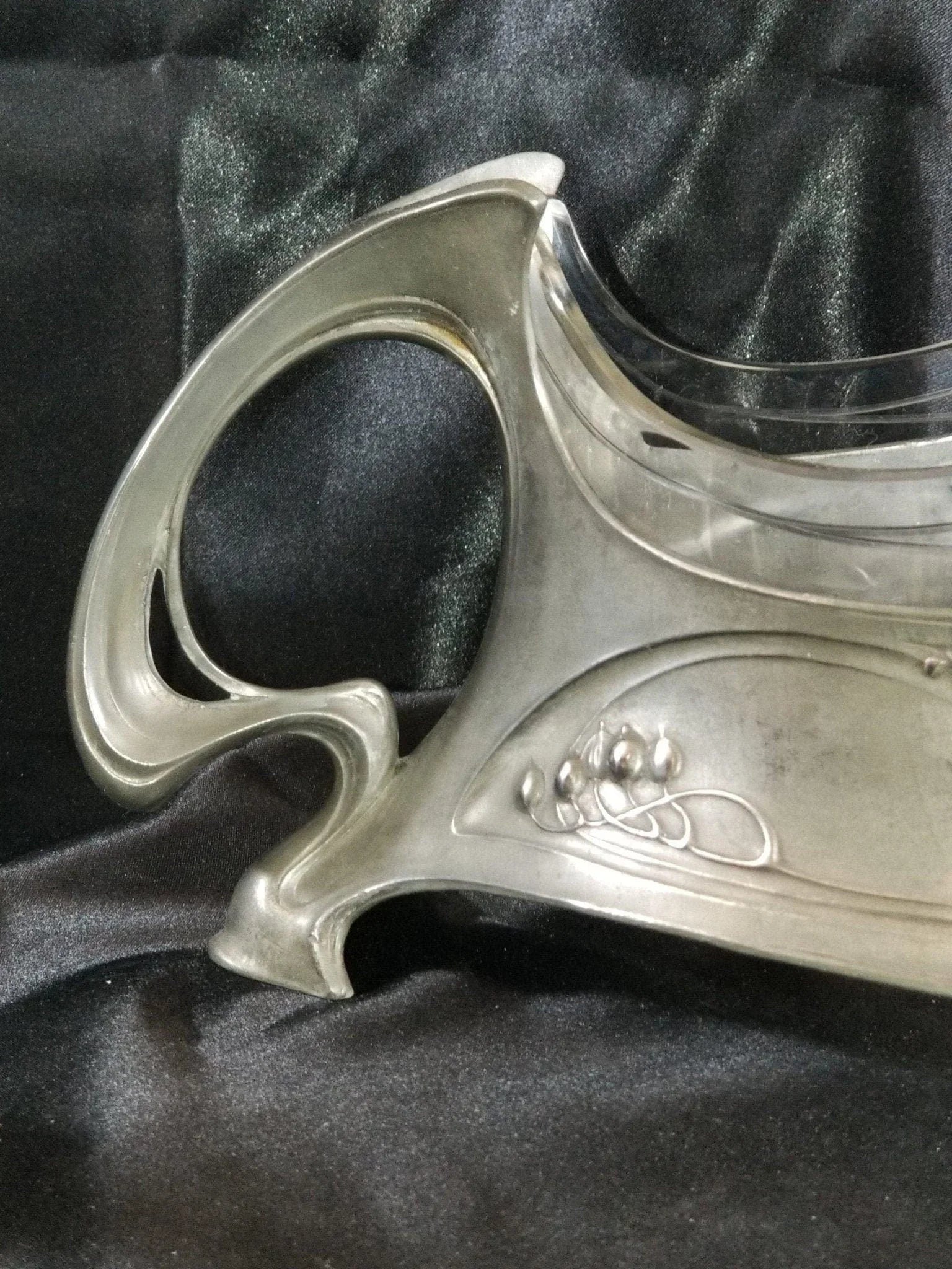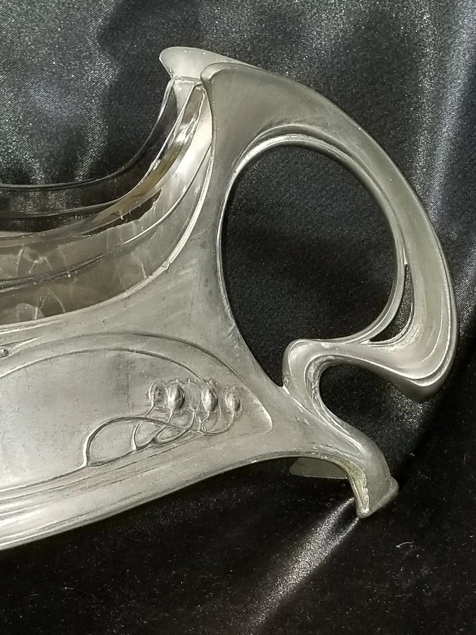 Measures 16.5" wide x 5.5" tall. Top quality Bohemian cut glass in the original<br>period Art Nouveau pewter holder. Both pieces guaranteed c.1890-1910. No major<br>issues with the pewter or the glass. One very small flake on the rim of the<br>glass that could easily be ground it for $5-$10 with no evidence it was there.<br>Nice patina to pewter holder. I found an impressed C on one foot, no other<br>markings.