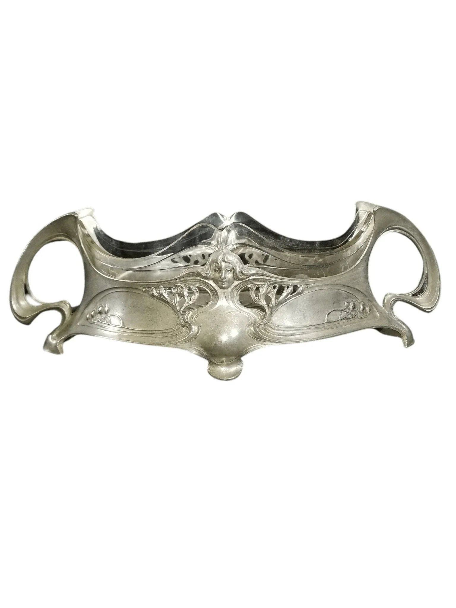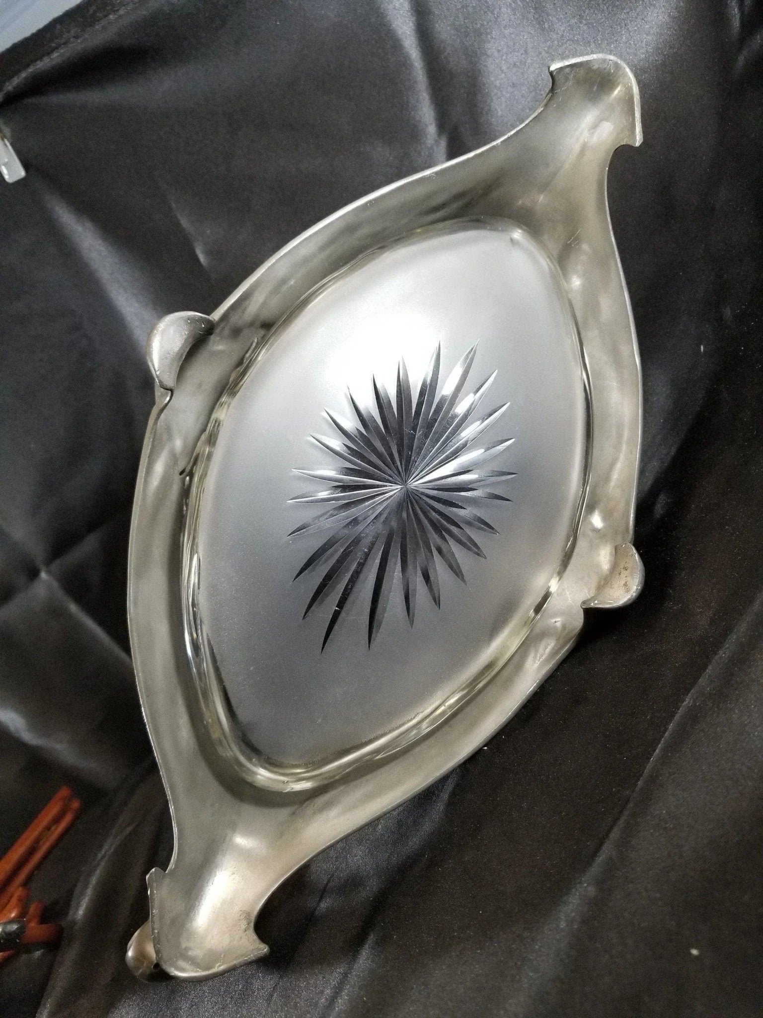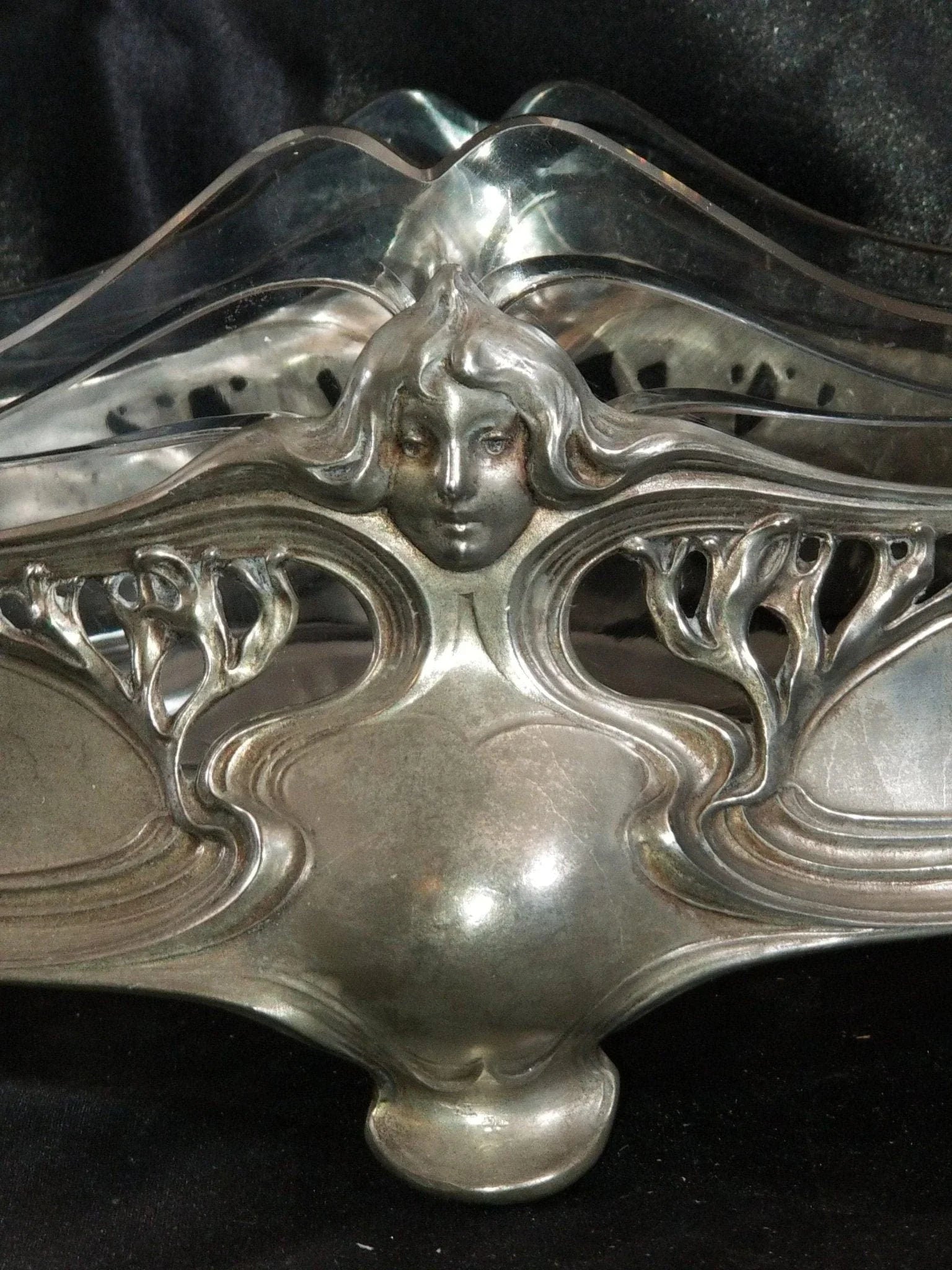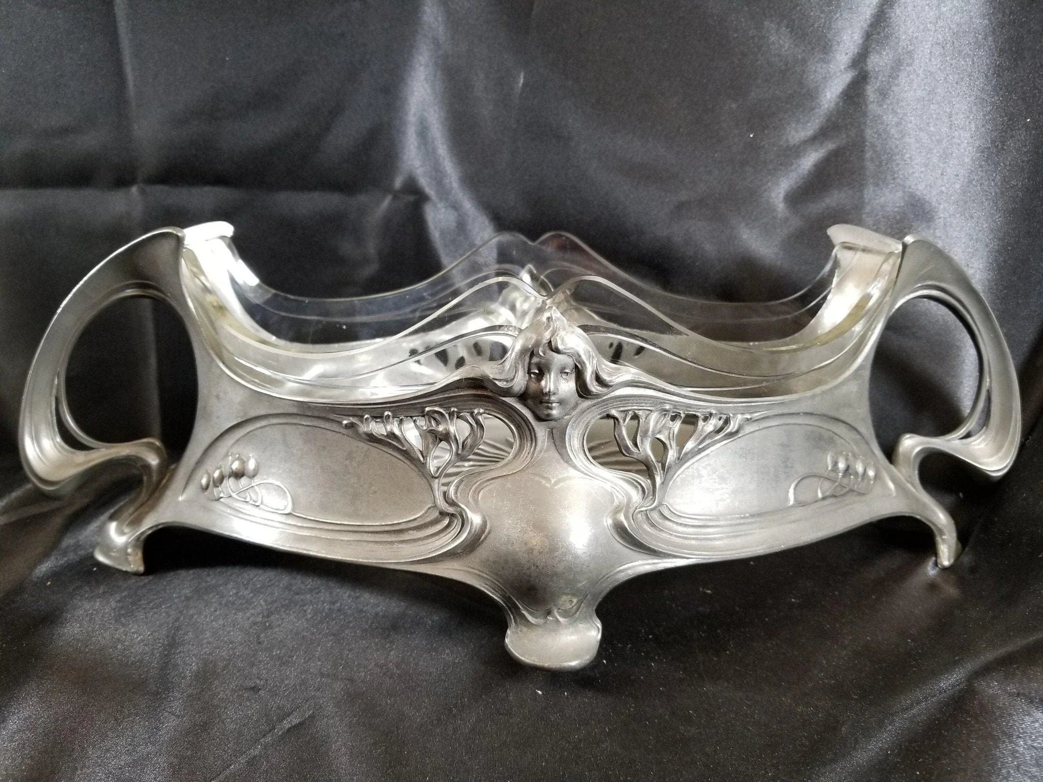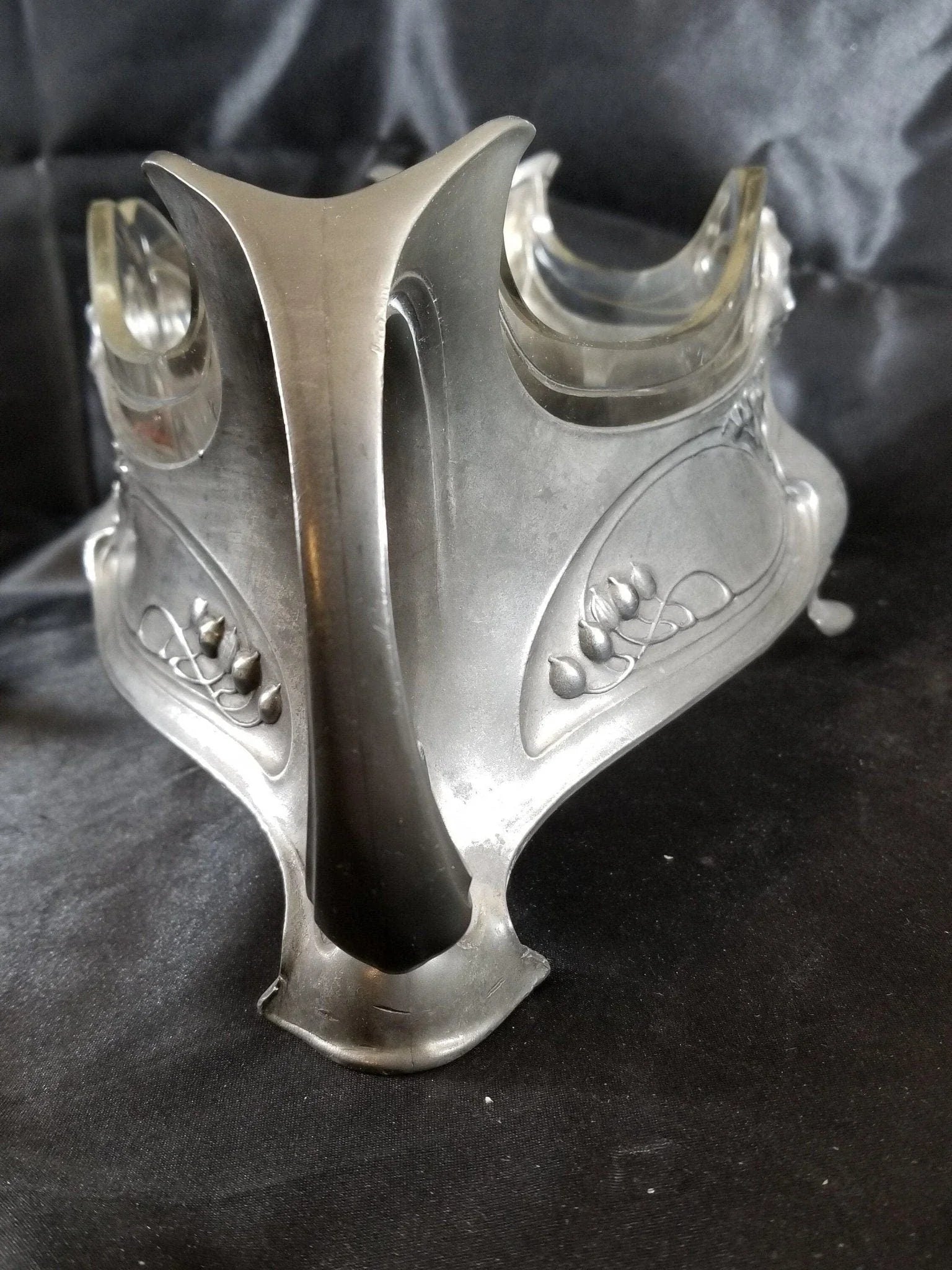 Measures 16.5" wide x 5.5" tall. Top quality Bohemian cut glass in the original<br>period Art Nouveau pewter holder. Both pieces guaranteed c.1890-1910. No major<br>issues with the pewter or the glass. One very small flake on the rim of the<br>glass that could easily be ground it for $5-$10 with no evidence it was there.<br>Nice patina to pewter holder. I found an impressed C on one foot, no other<br>markings.