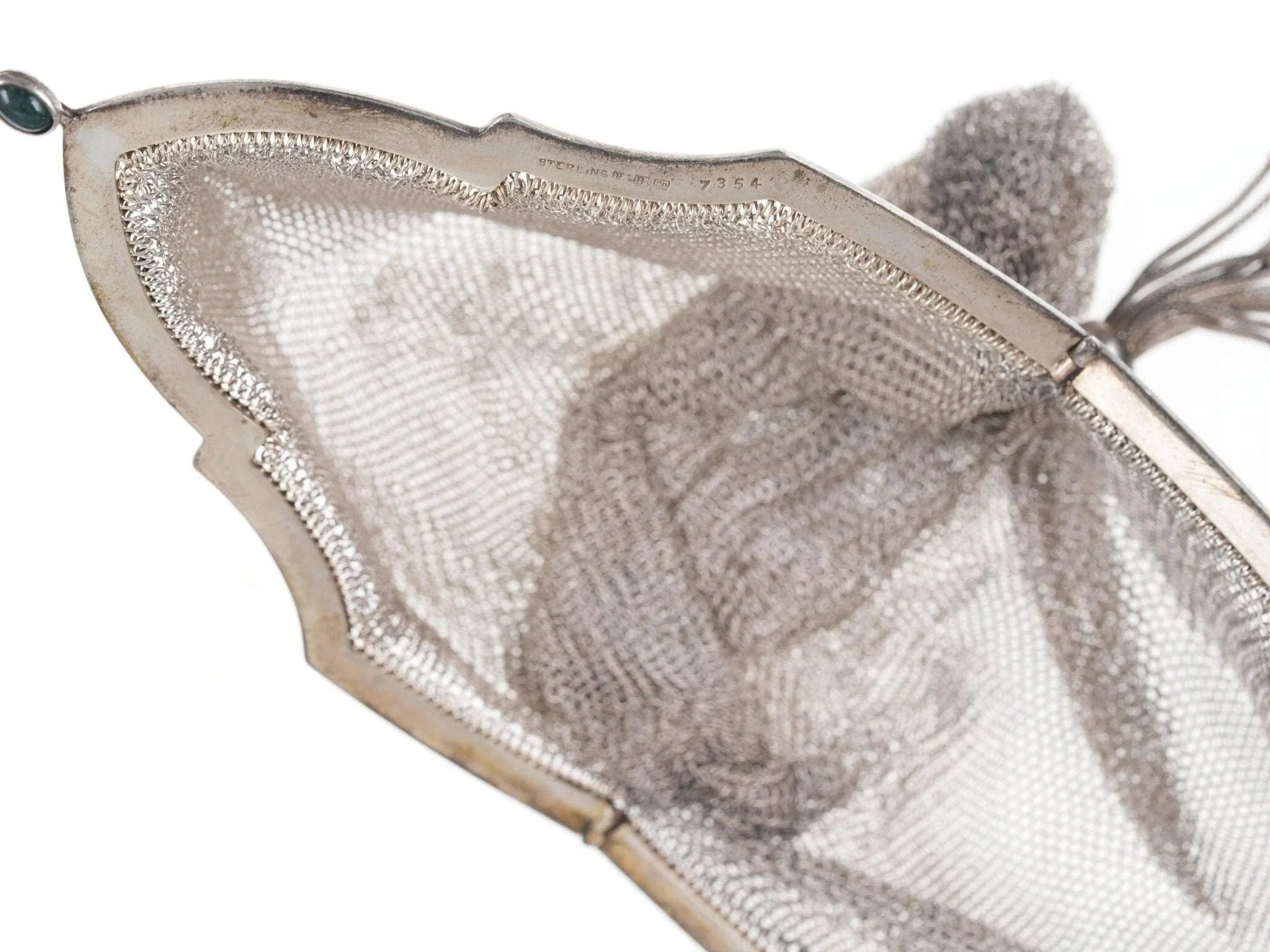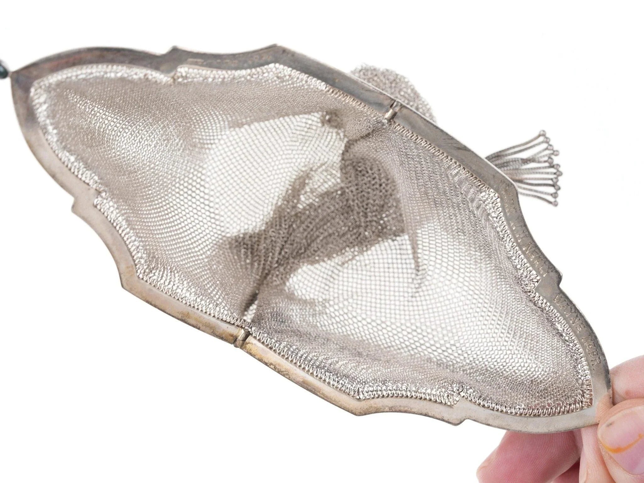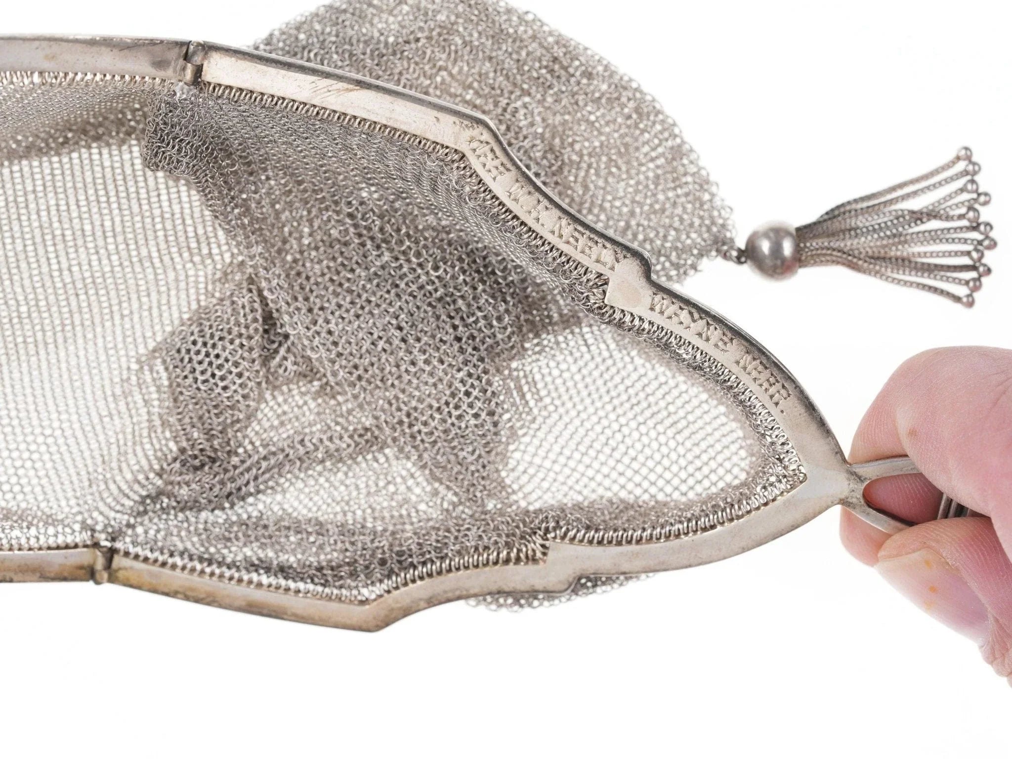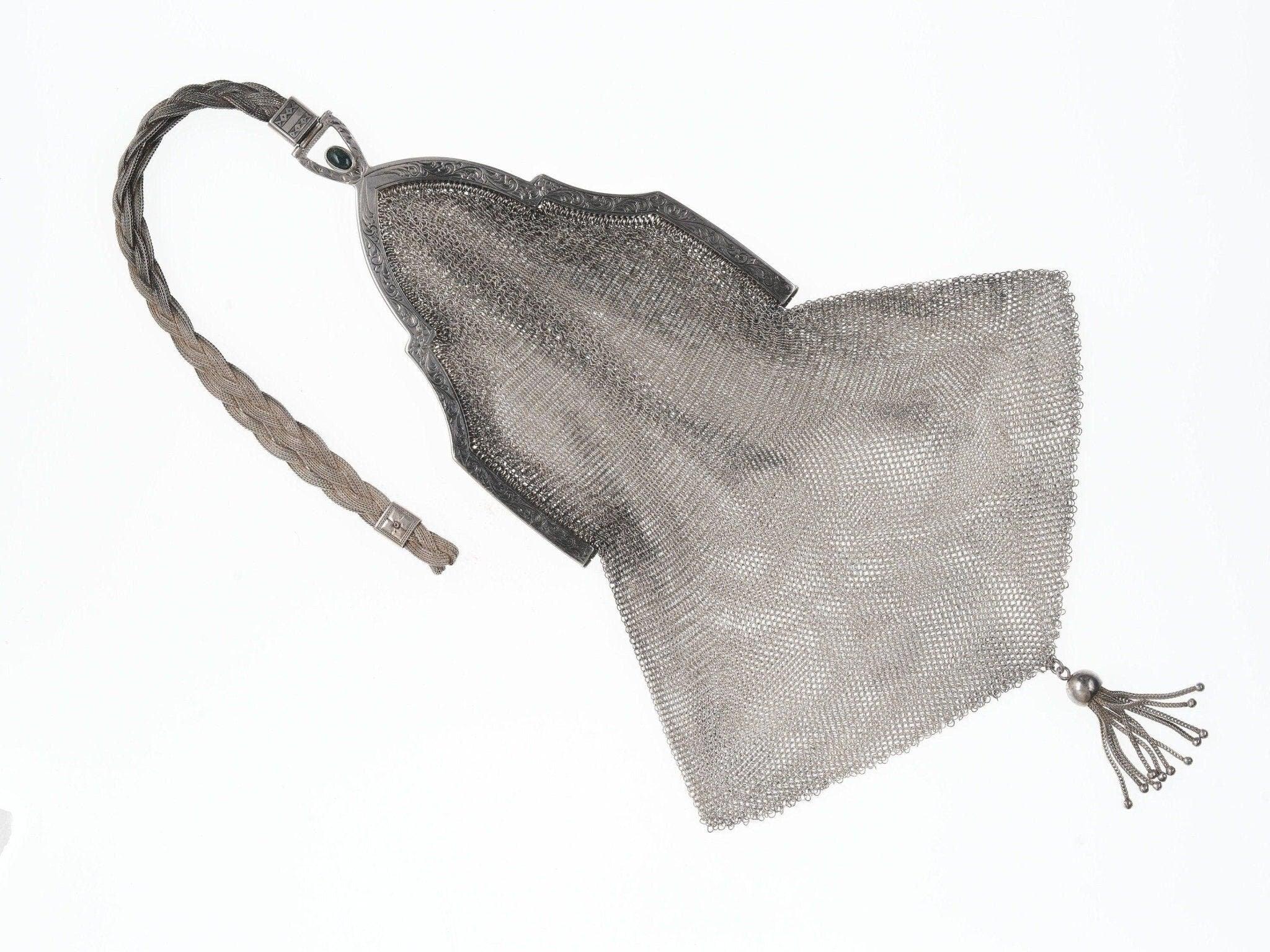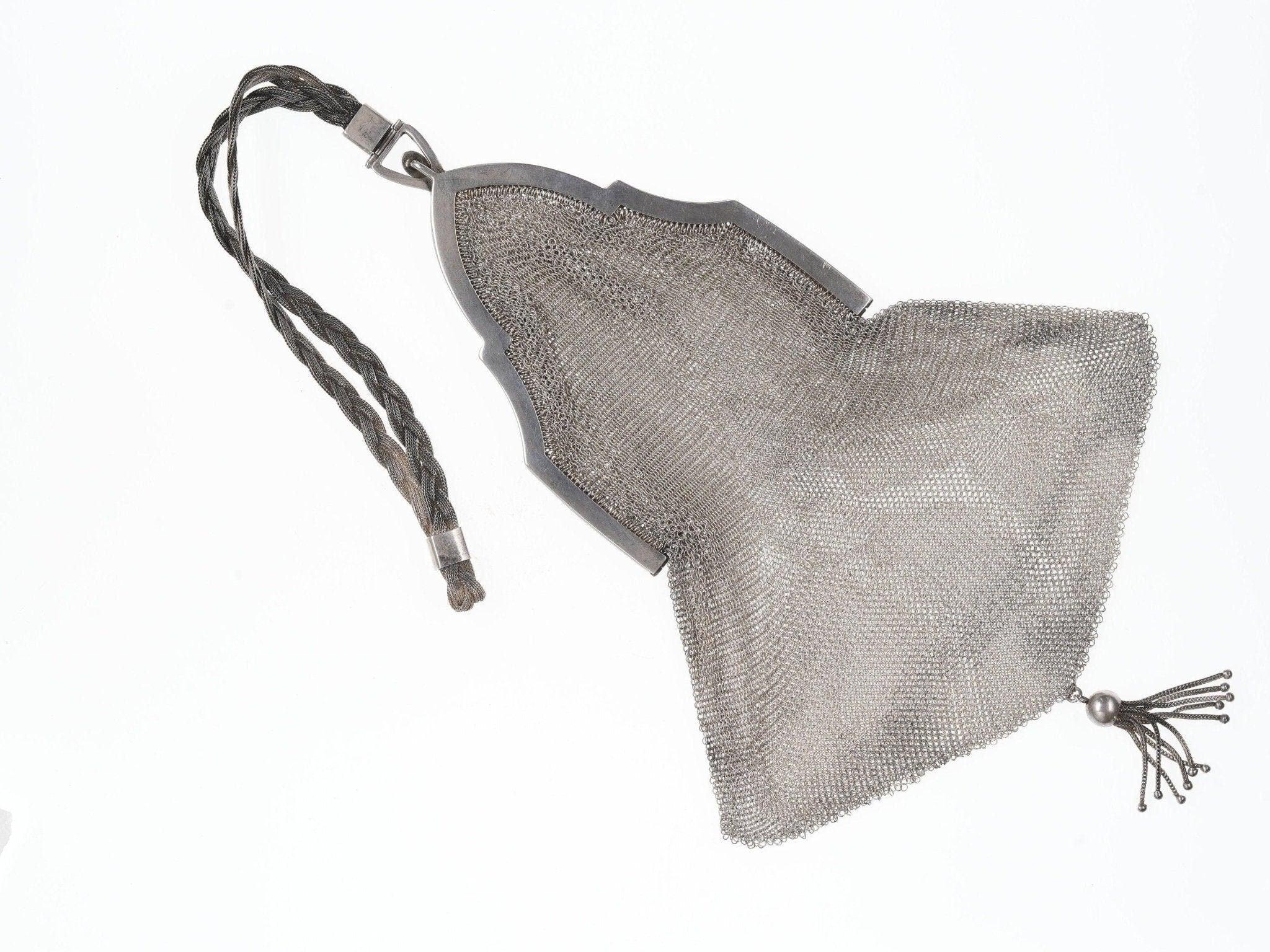 Art Deco Sterling mesh handbag. Very nice handbag in incredible condition with<br>no noted damage. Typically the top braided handle would have issues, or tears<br>where it opens, this one is near perfect. Marked sterling with original<br>dedication on inside rim. Frame is 3" wide, 16" total length with handle. 99.4<br>grams of solid sterling silver.<br>silverdrawer