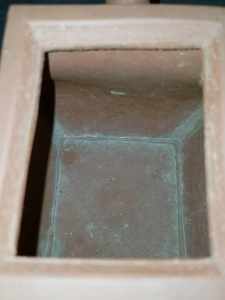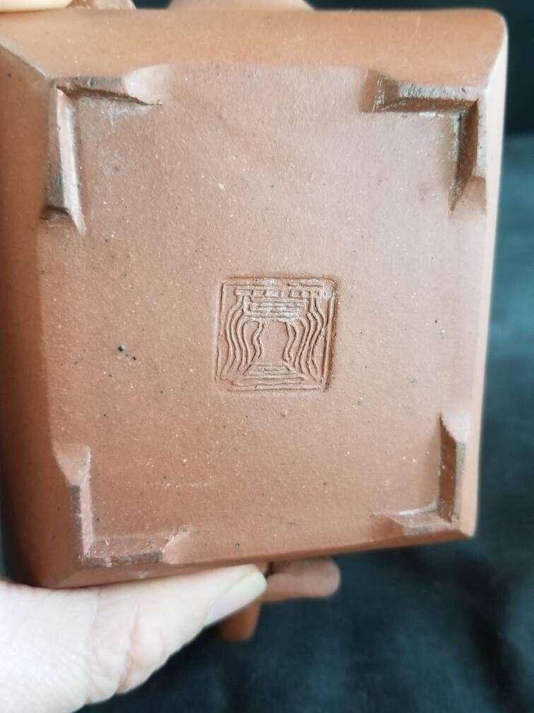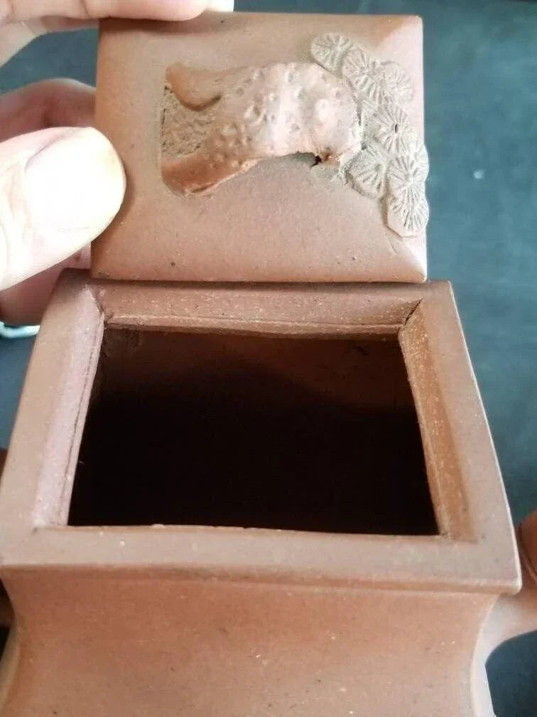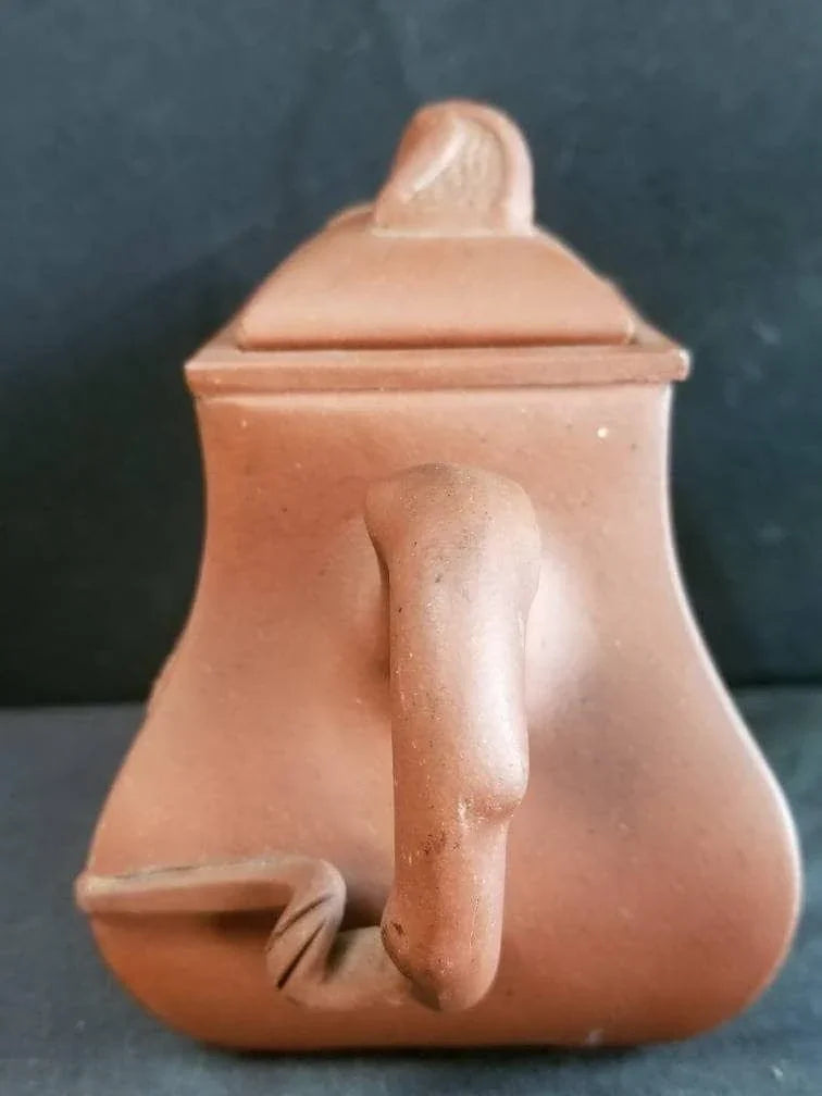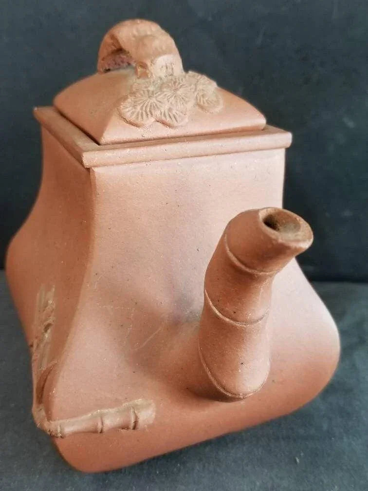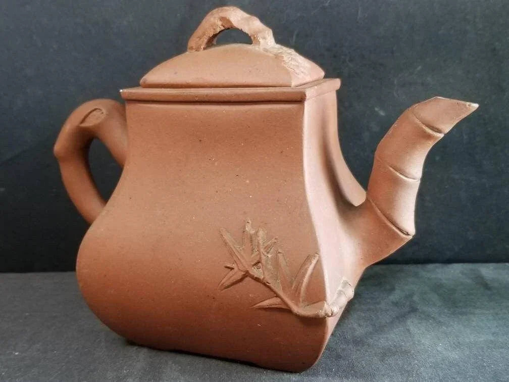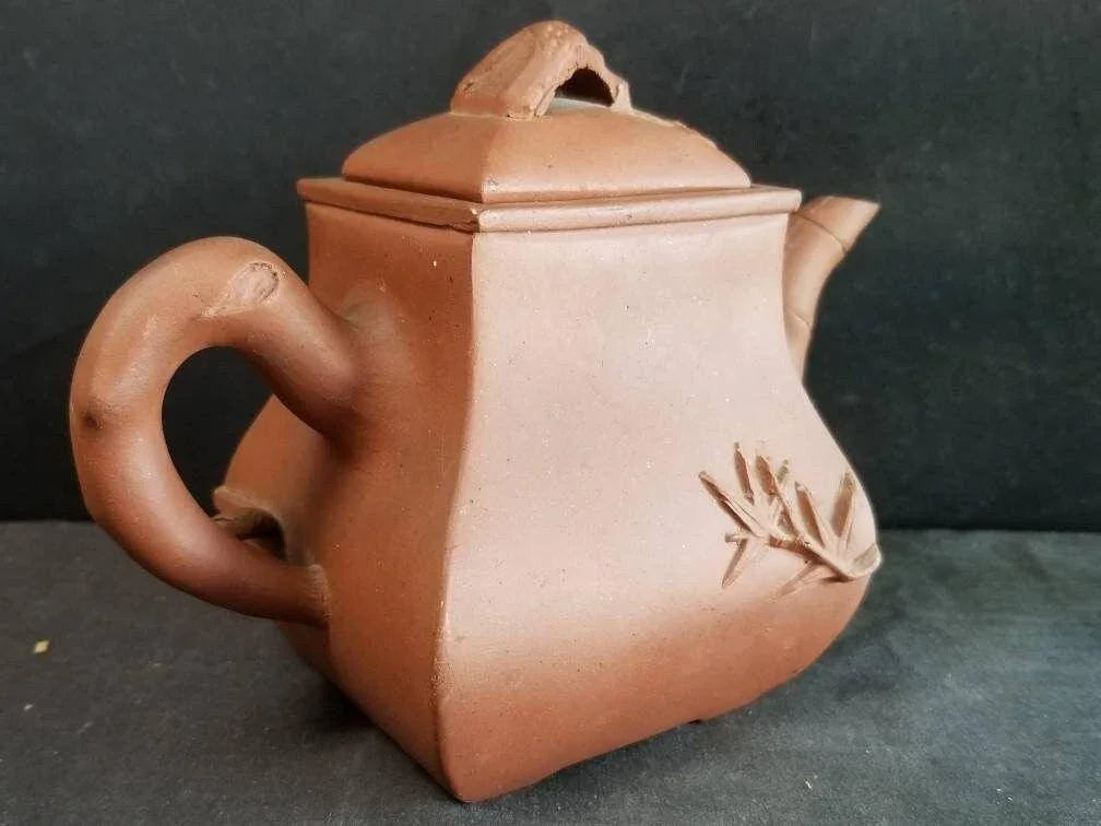 Antique Yixing Zisha Teapot Hand Built Bamboo spout Decoration. 7 3/8" handle to spout x 5.75" tall. Looks to have small amount of applied decoration missing on