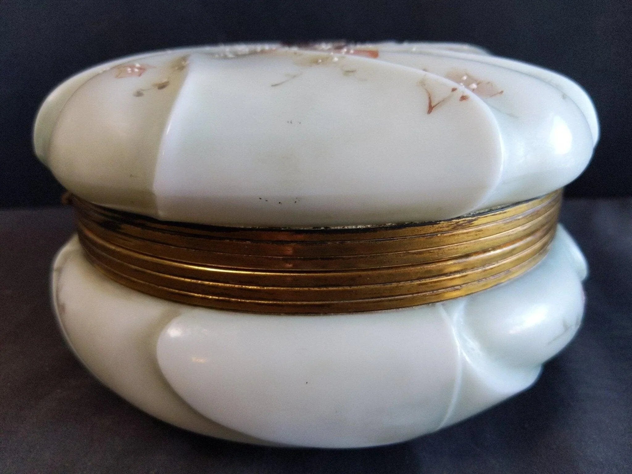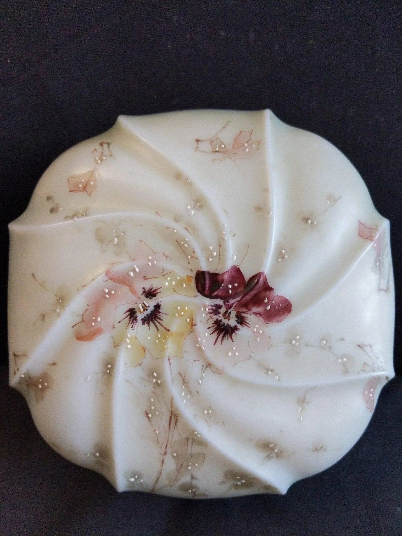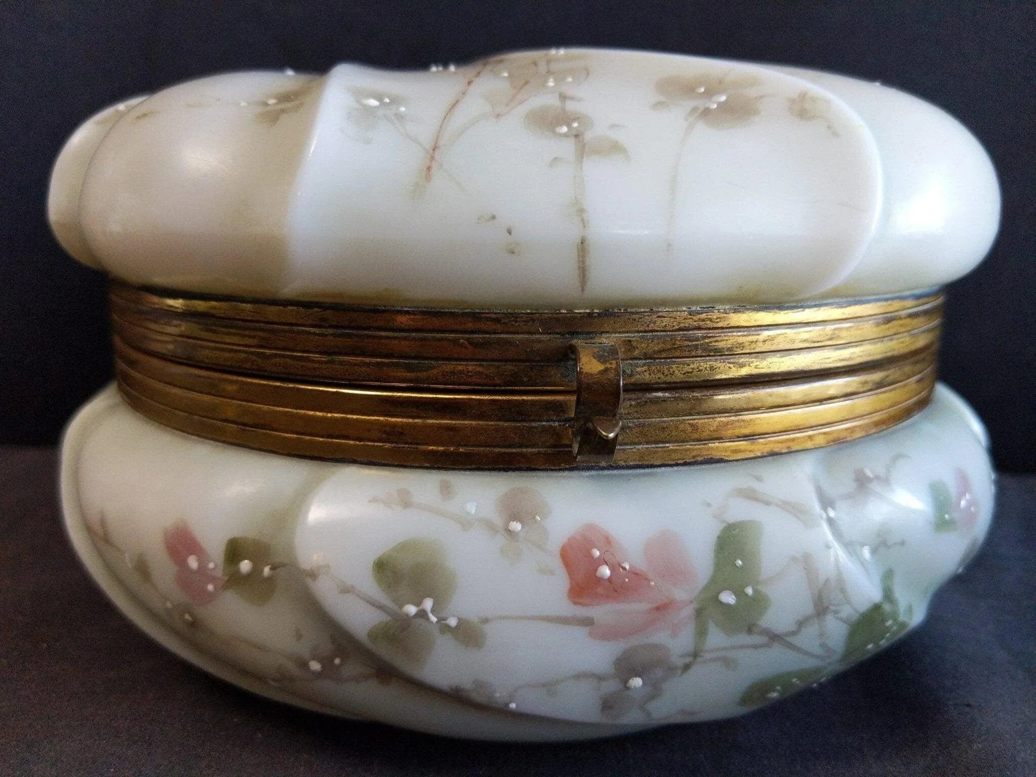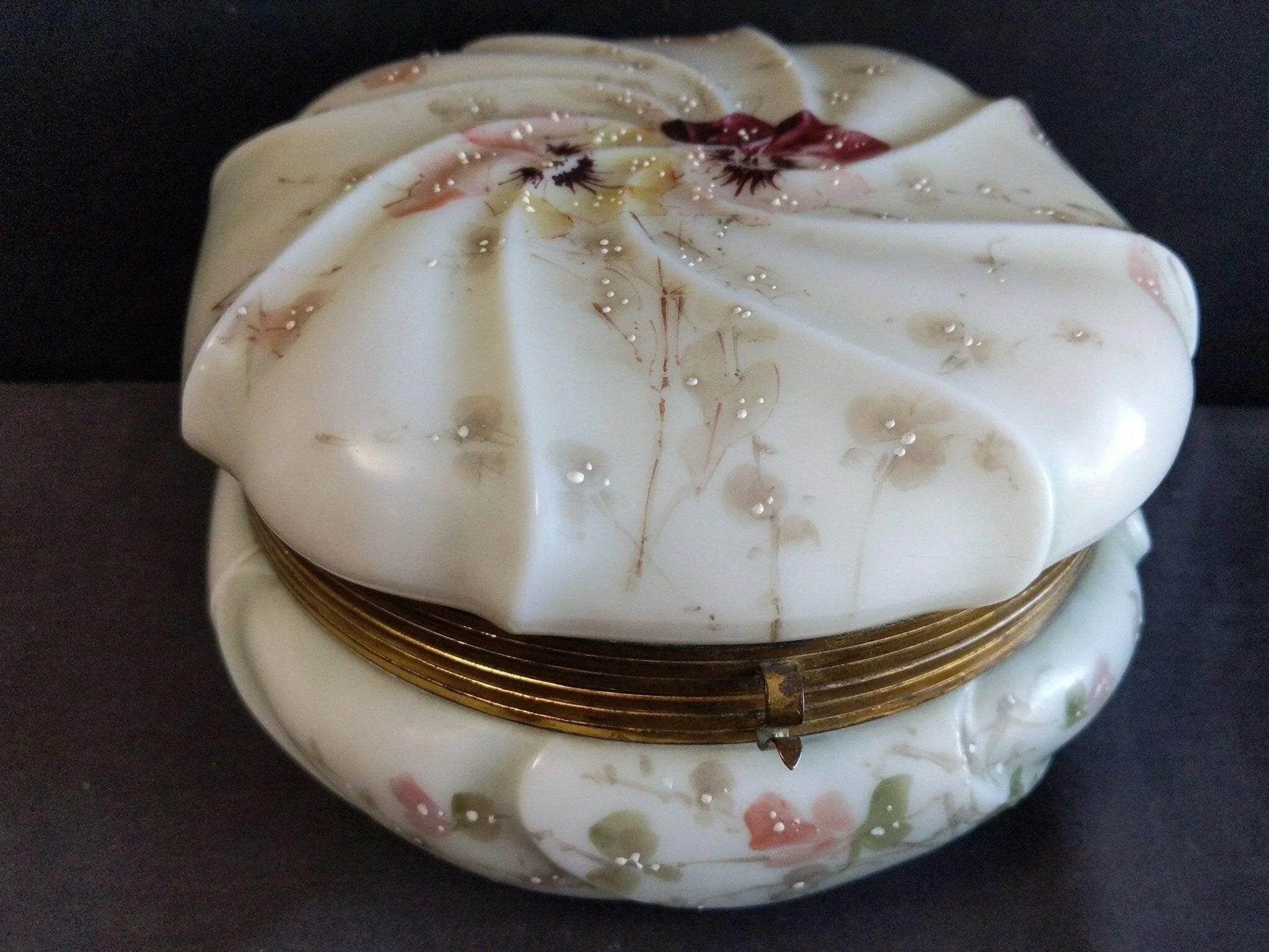 It's unmarked, 7.5" c.1890 Wavecrest Dresser Box Hand Painted Flowers 4" tall.<br>No cracks, chips, or scratches on glass. There's some green accent paint some of<br>which is missing. This is a really big box, tight hinge, no significant issues.<br>Liner on base missing.<br>B7