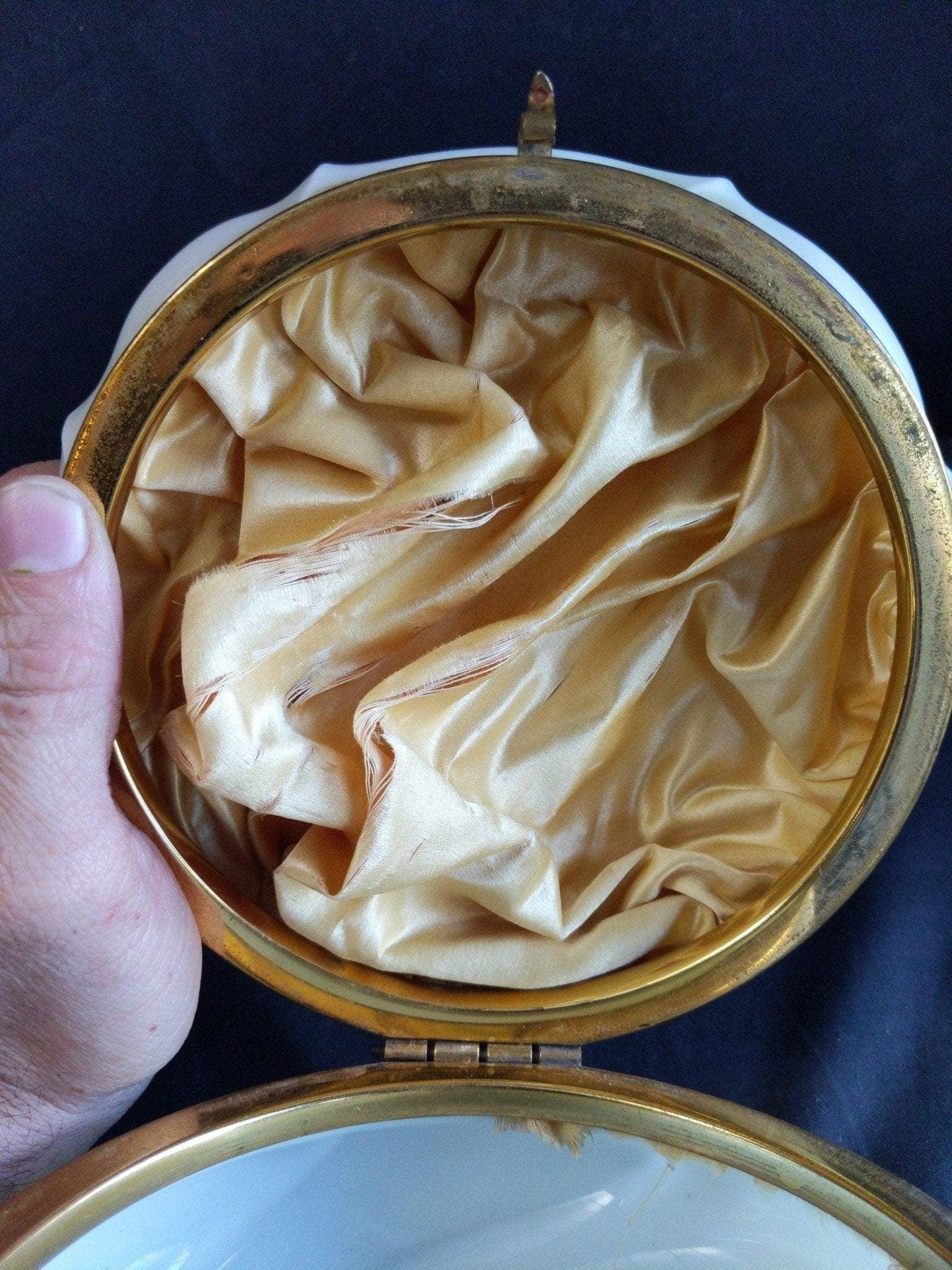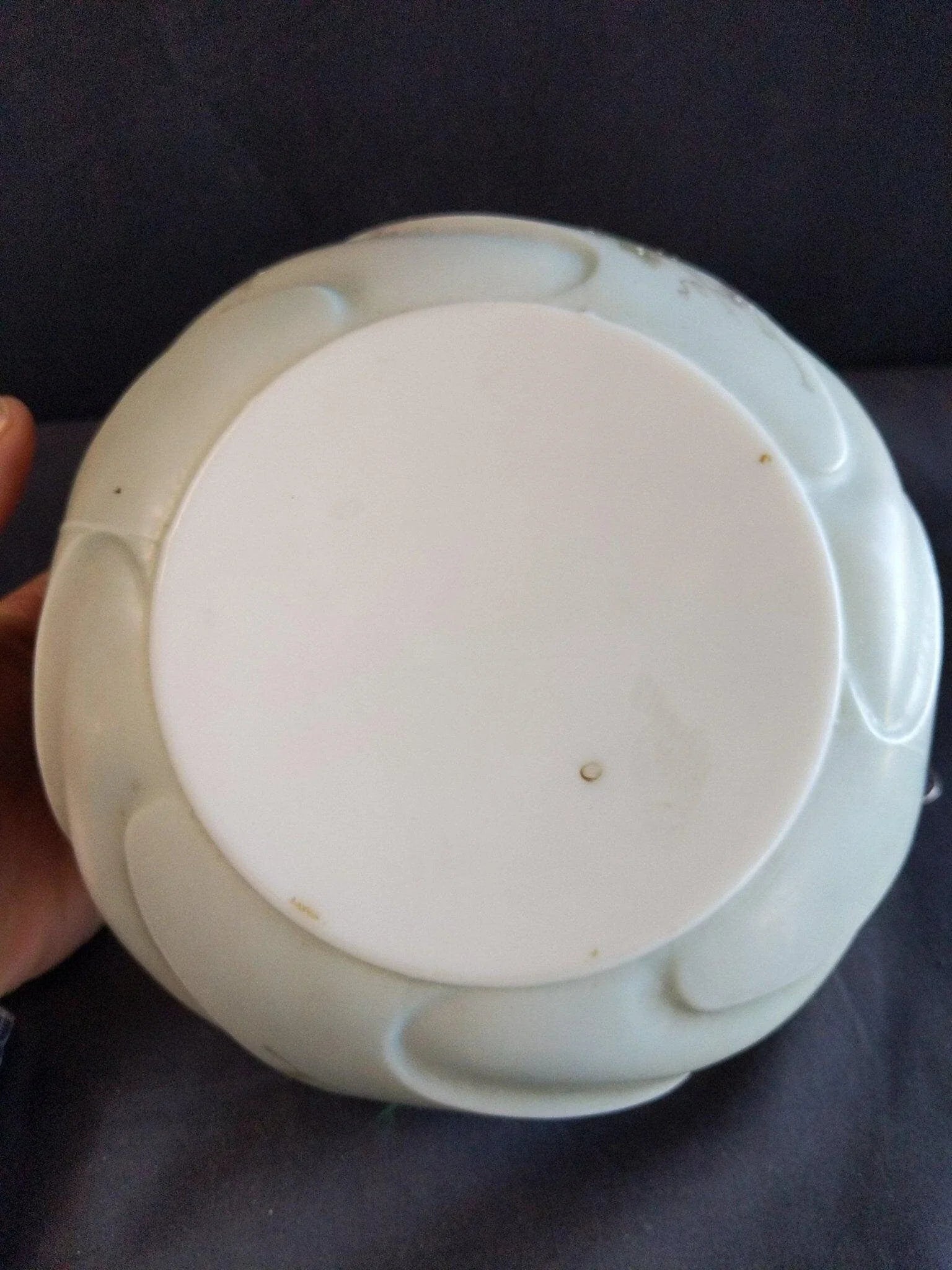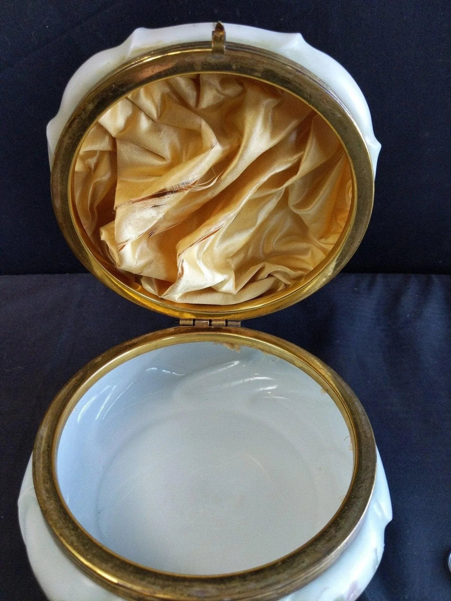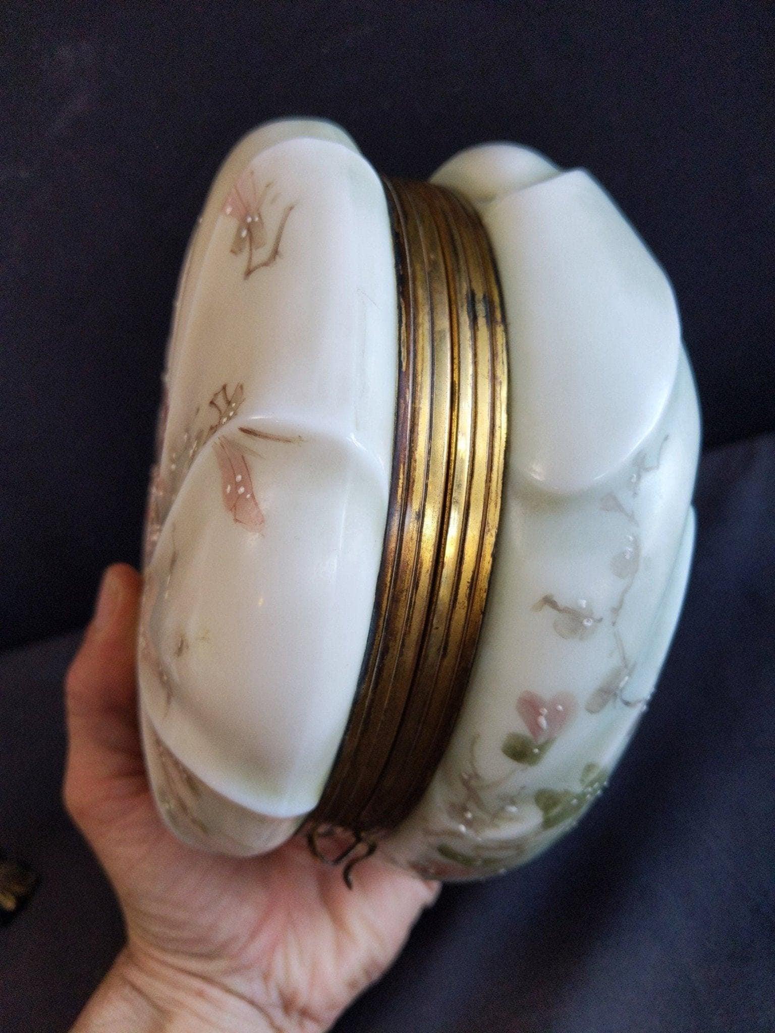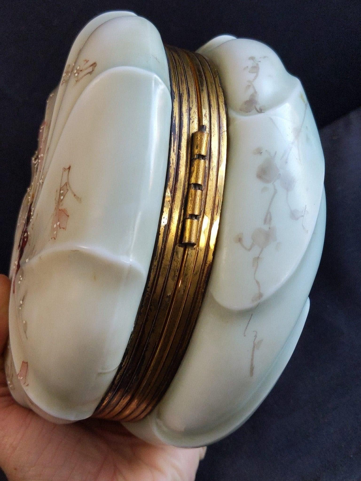 It's unmarked, 7.5" c.1890 Wavecrest Dresser Box Hand Painted Flowers 4" tall.<br>No cracks, chips, or scratches on glass. There's some green accent paint some of<br>which is missing. This is a really big box, tight hinge, no significant issues.<br>Liner on base missing.<br>B7