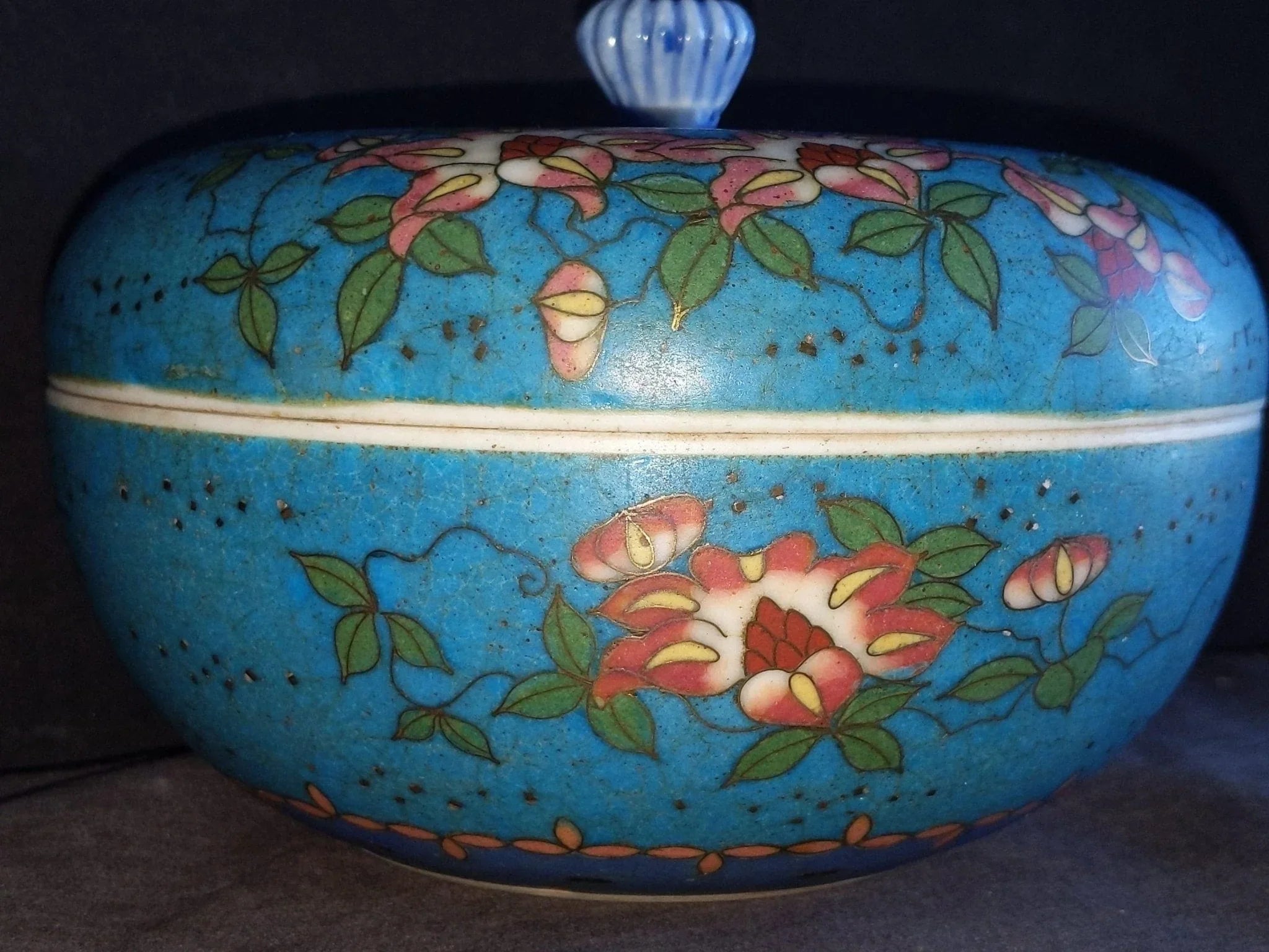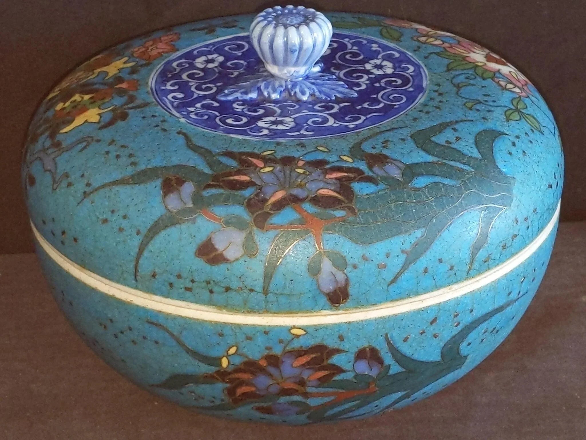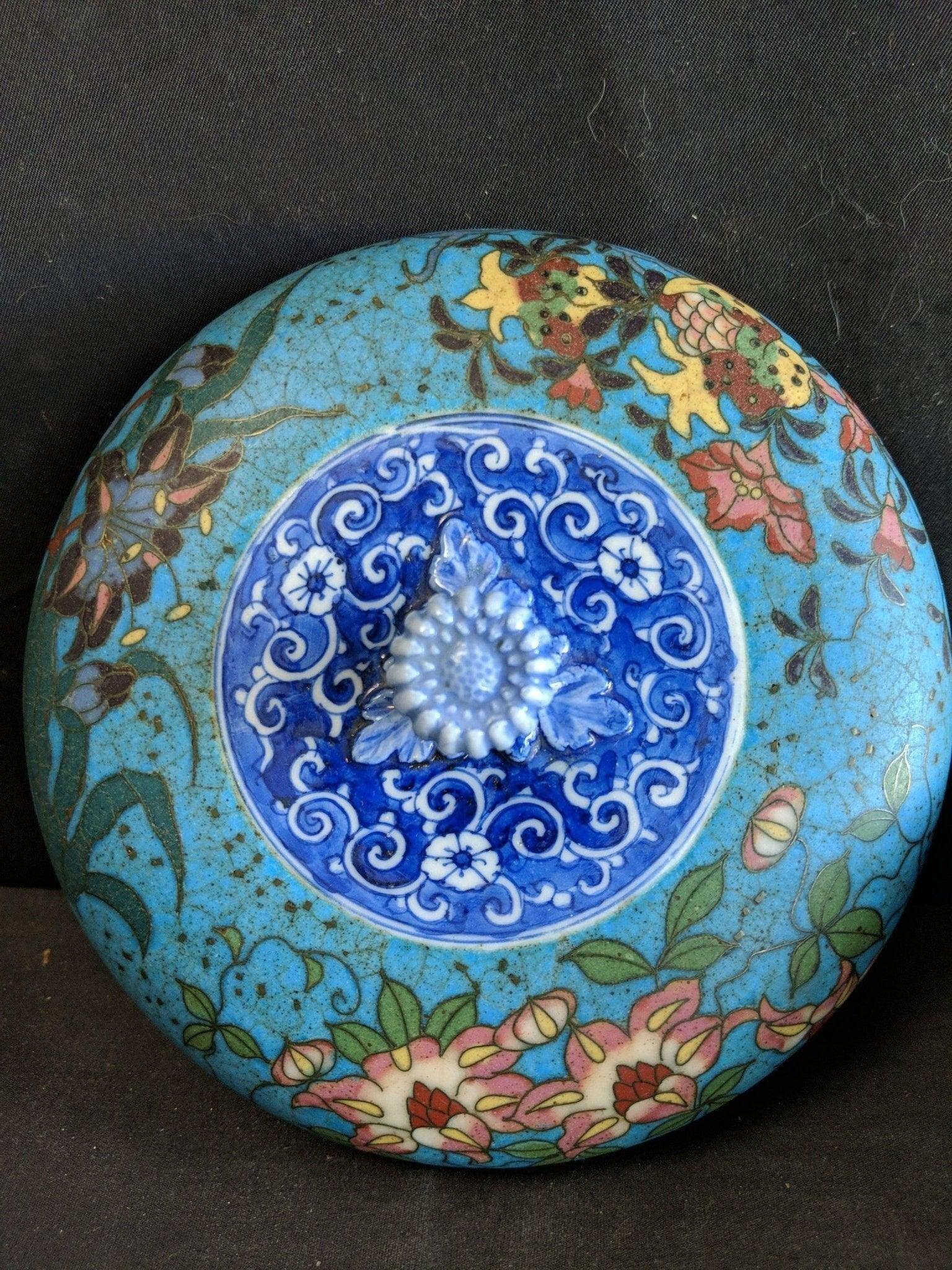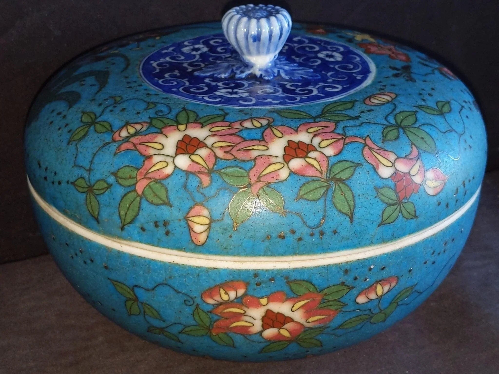c1870 Japanese Cloisonne Over Blue/White Porcelain Covered Box 6.25" wide x 4.5"