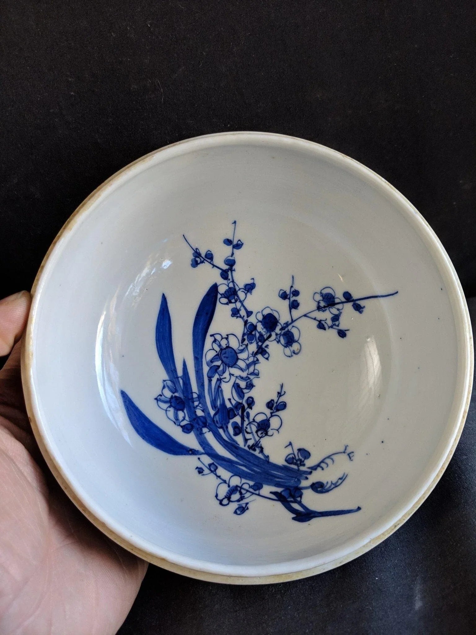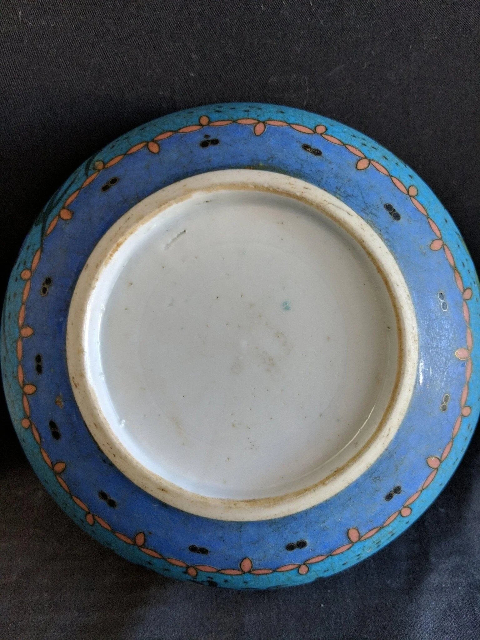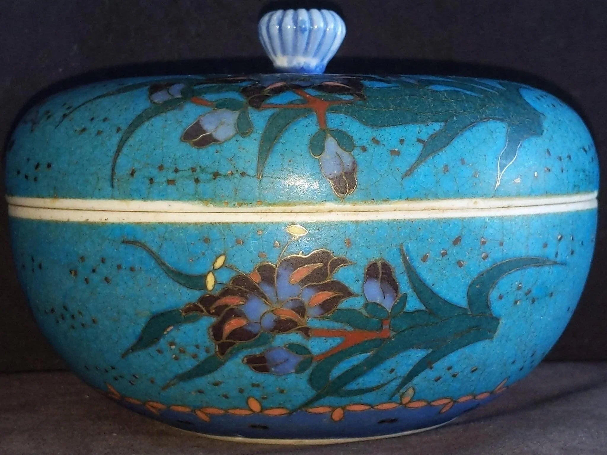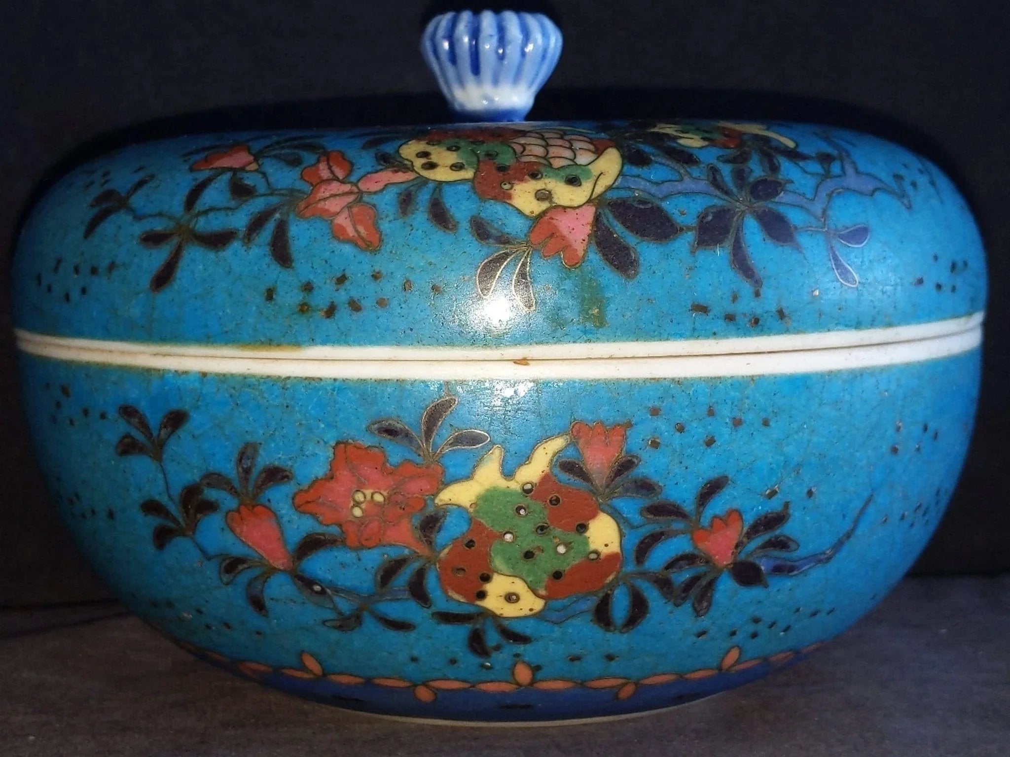 c1870 Japanese Cloisonne Over Blue/White Porcelain Covered Box 6.25" wide x 4.5"