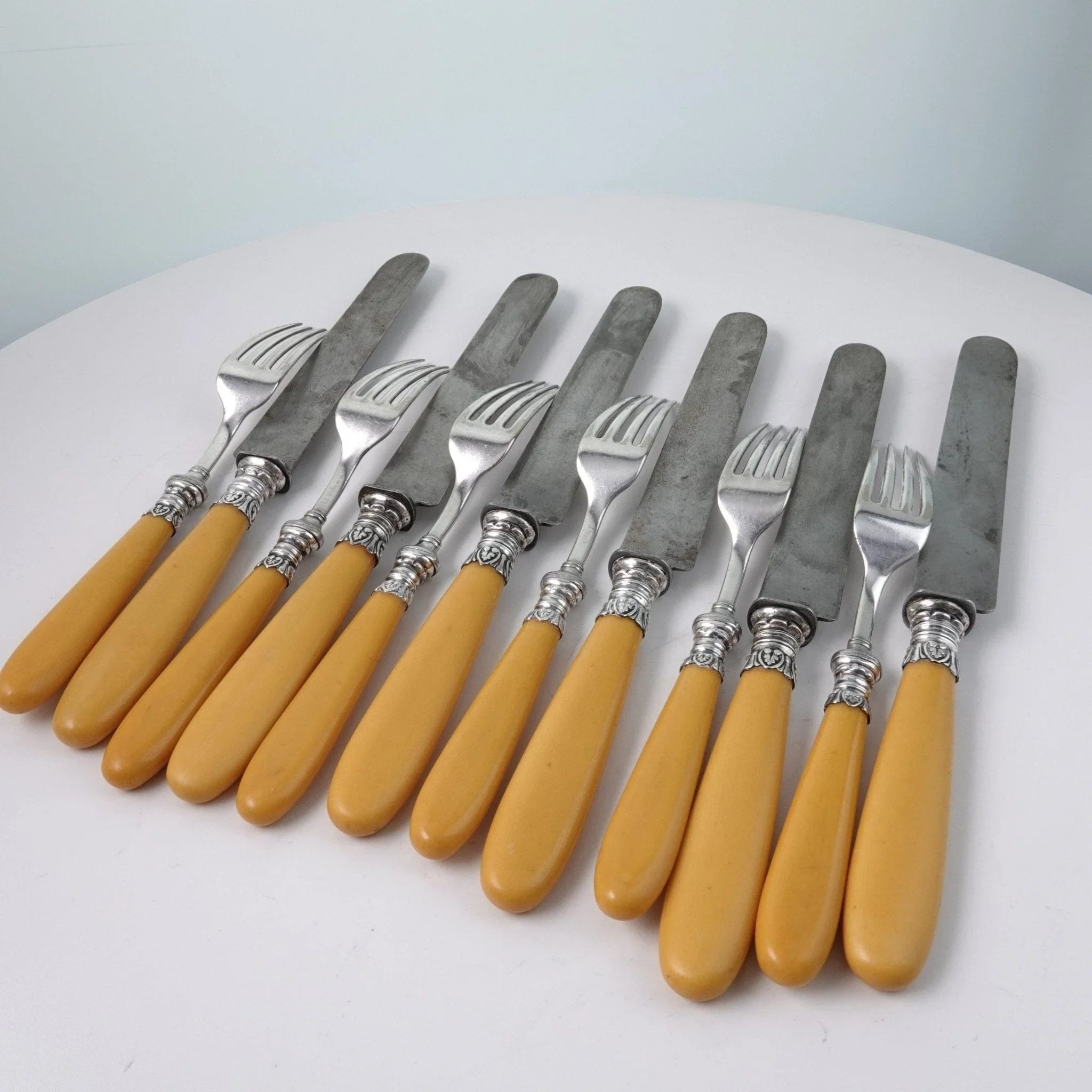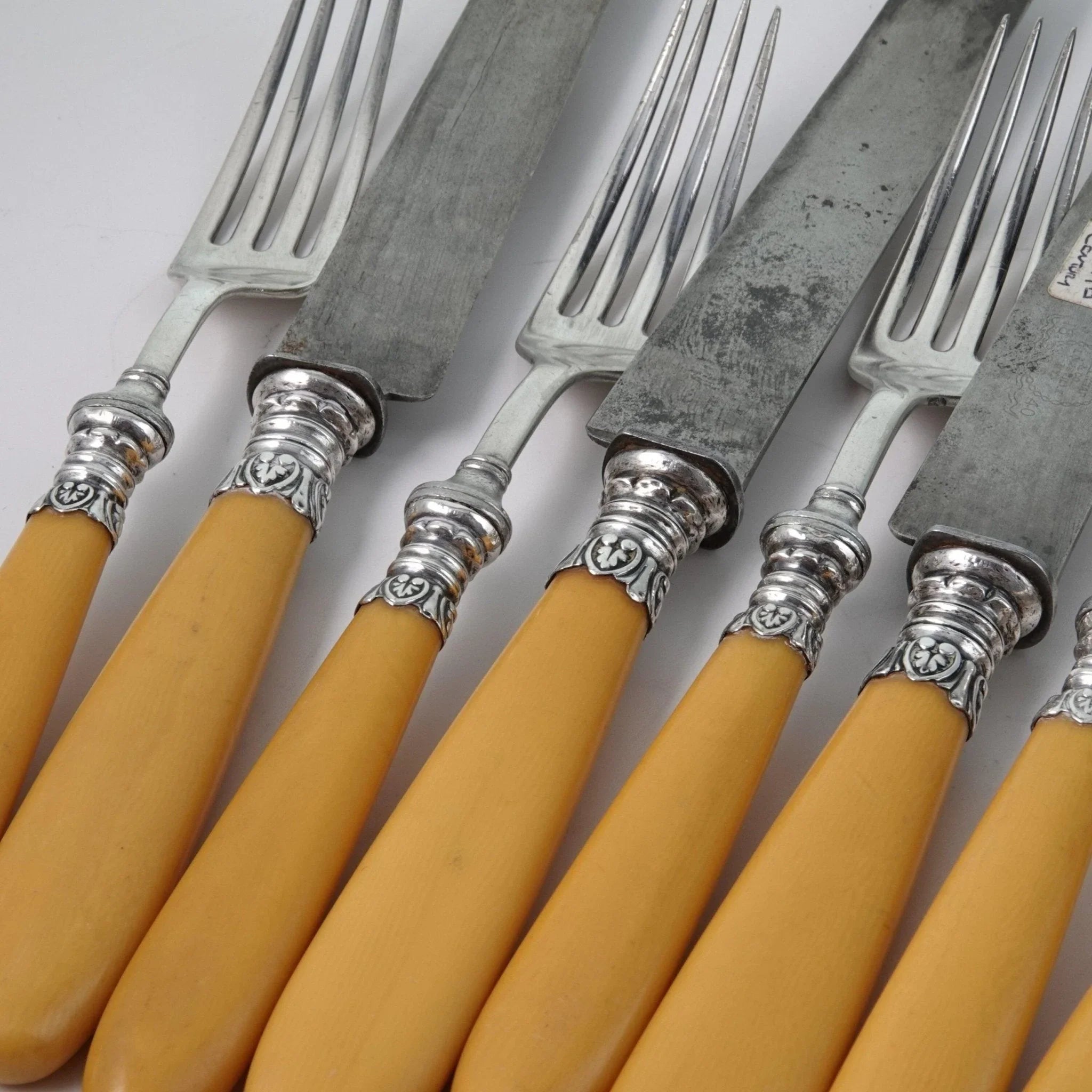 C1870 Louisville KY Belknap Sterling silver/Steel with Celluloid Handles Cutlery Set Fish Serving Set. Rare and unusual set by American Hardware store/tool/knife Maker Belknap. Most of the stuff they made was more utilitarian rather than fancy like this set. Also a strange combination of Sterling silver and The earliest form of Plastic. All are in good condition, tight in handles. The bands are marked sterling. The forks don't stick to a magnet, tested sterling, and show no wear to any possible plating so I believe they are solid silver other than the handles. The Knives are obviously Steel. Some of the marks are difficult to read on the knives. Knives are 9.75" long, forks are 7.75" long. TW94