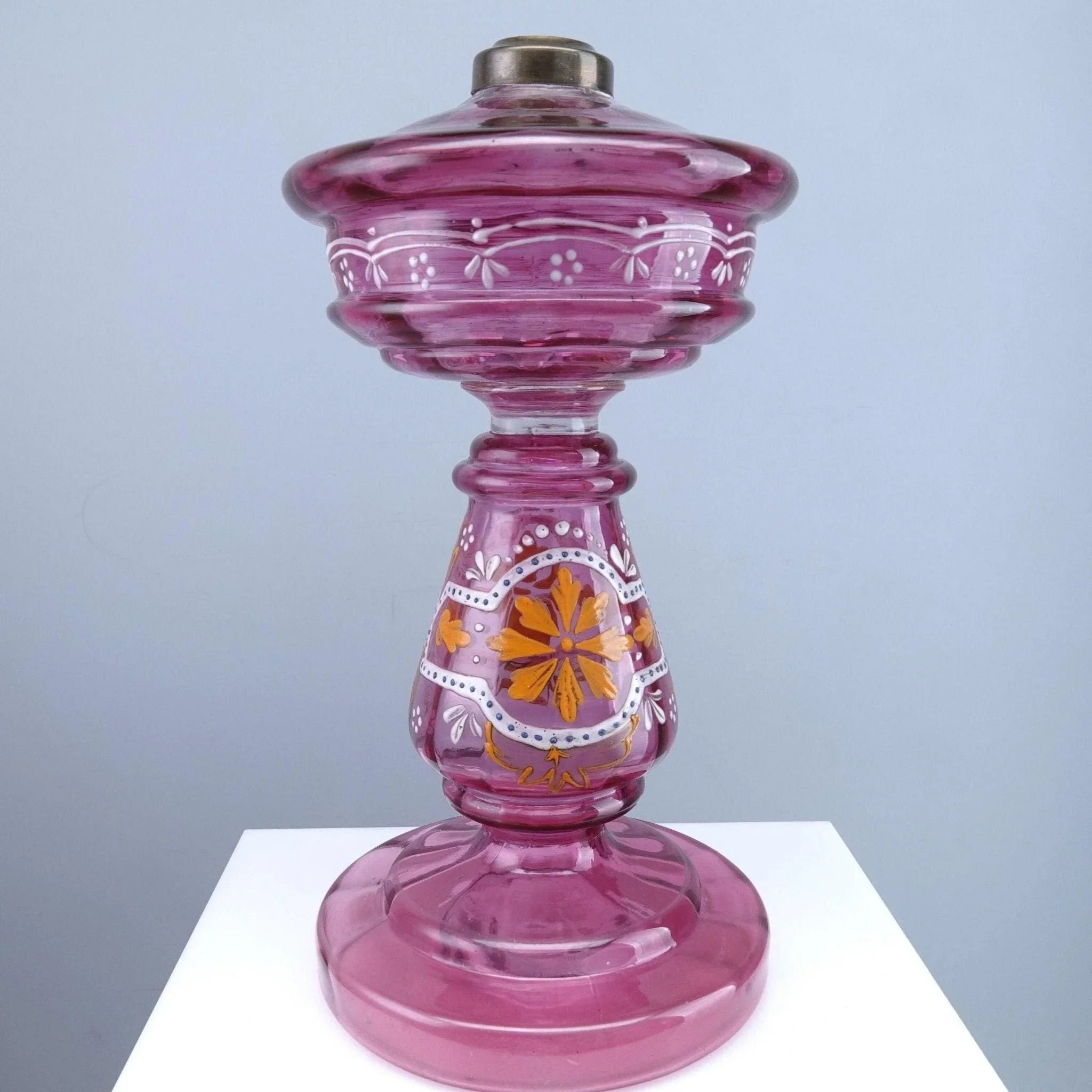c1880 Cranberry Enameled Oil Lamp Base. 11" tall x 5.5" wide with no cracks,<br>chips, or restorations. The hole in the base is an open pontil from<br>manufacturing it hasn't been drilled. The top part was blown separately and has<br>no hole, it will hold oil if you wish to put a burner on it and use it as an oil<br>lamp. I probably have a burner if that's an issue to help make the sale so feel<br>free to ask. When I got it the old burner was disentigrated and broken so I<br>discarded it.<br>TW124