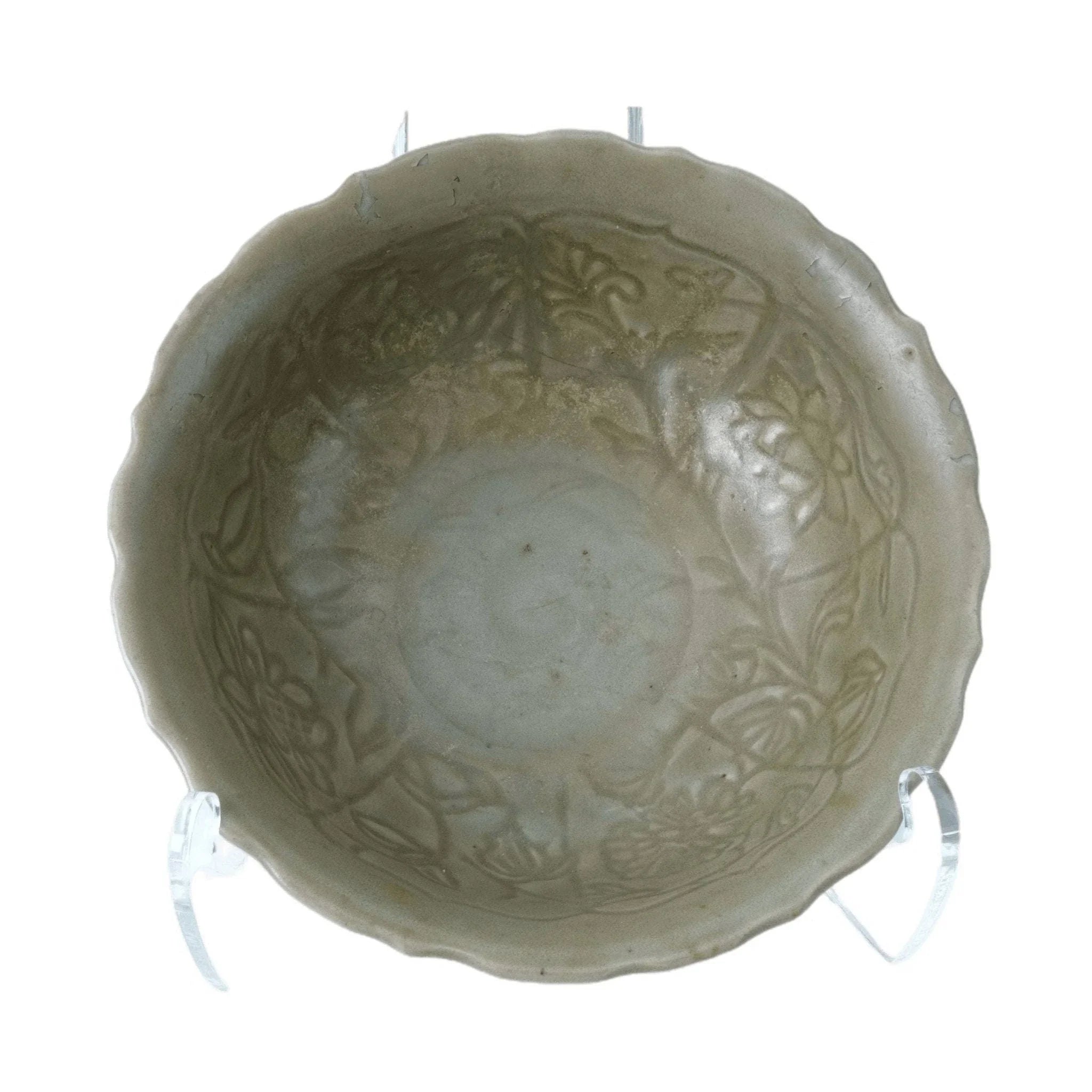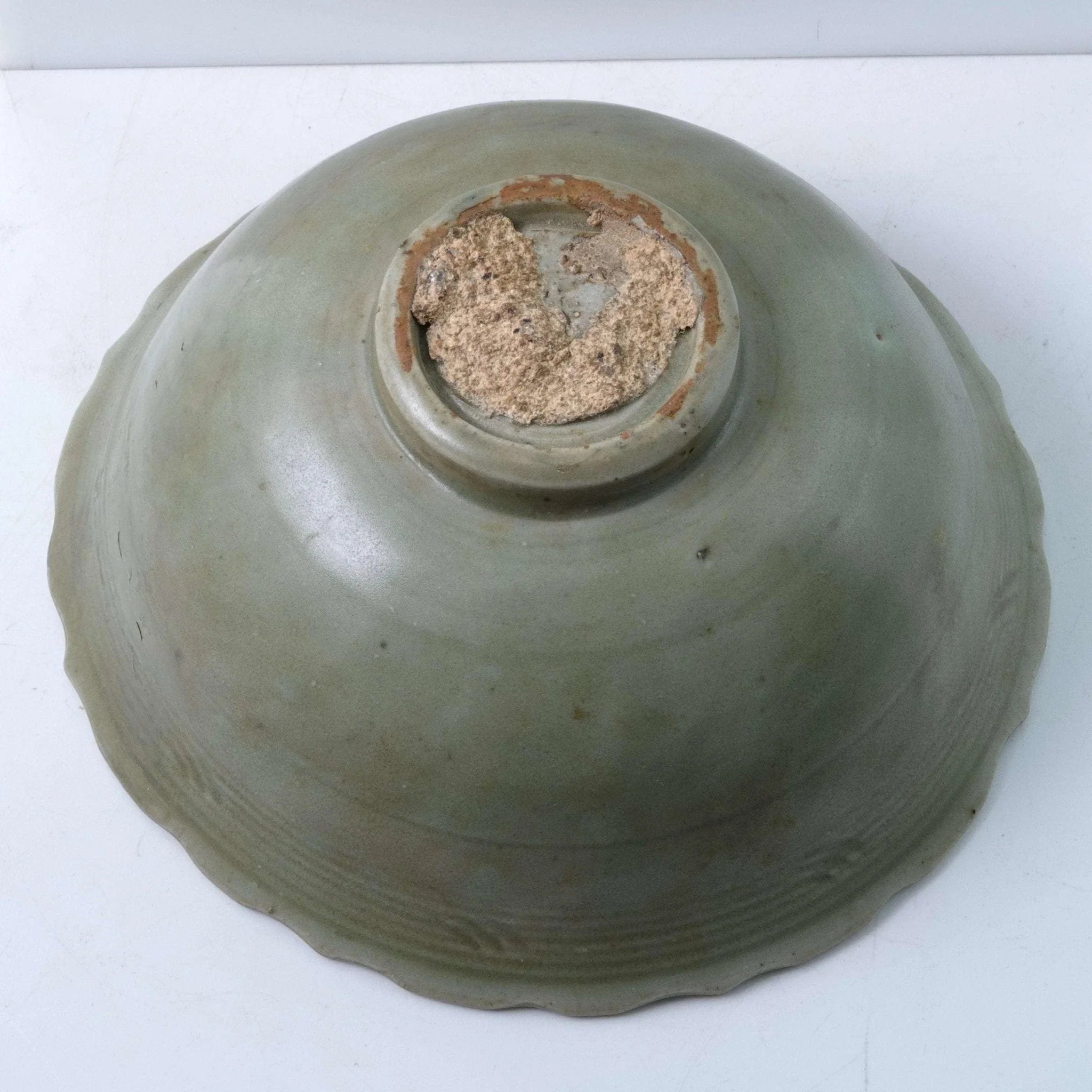 Ming Dynasty Chinese Barbed Edge Celadon Bowl with incised Lotus Decoration 7.5"<br>wide x 3" deep. There is a section about 6.5" wide that was broken and later<br>restored long ago. It is still very attractive and genuine, I believe a<br>competent restorer could do a better job with modern technology. No other<br>cracks, no chips, no restorations. From a collection I'm helping disperse that<br>was put together in the 1950's and 60's by a woman who is now 96.<br>TW130