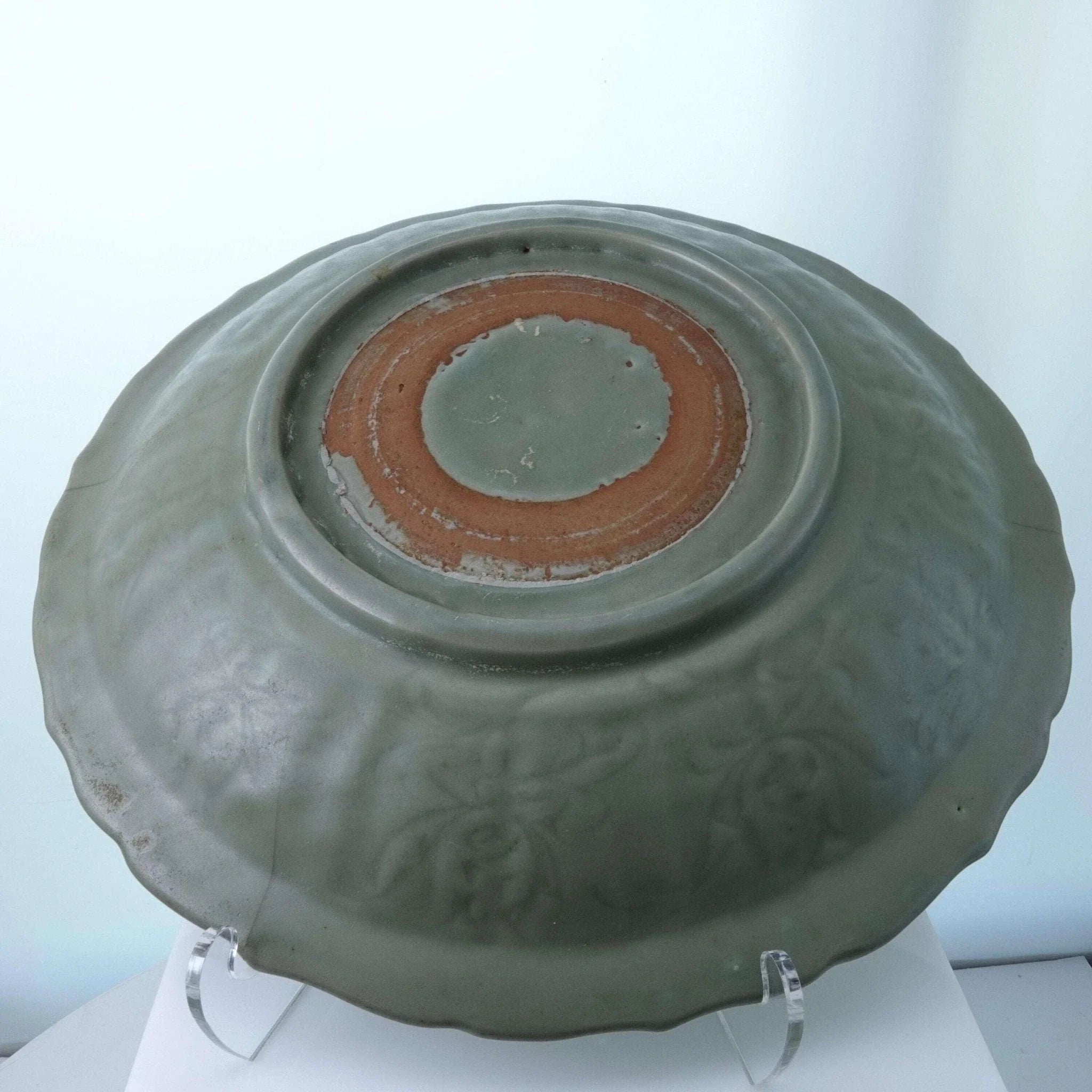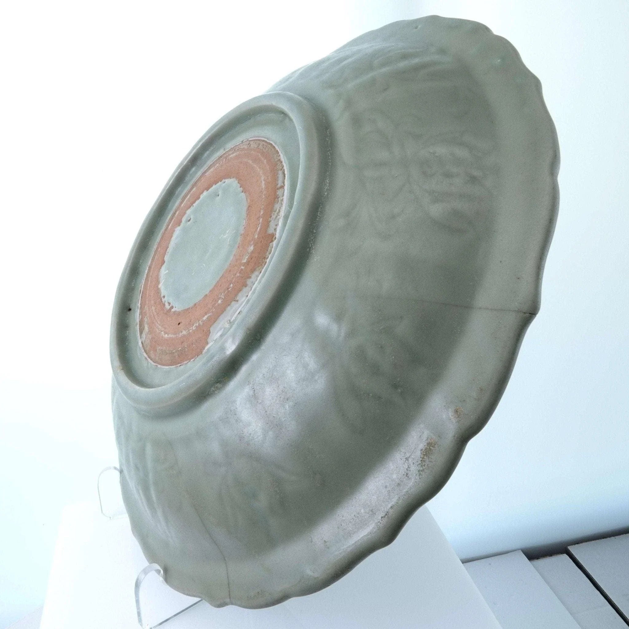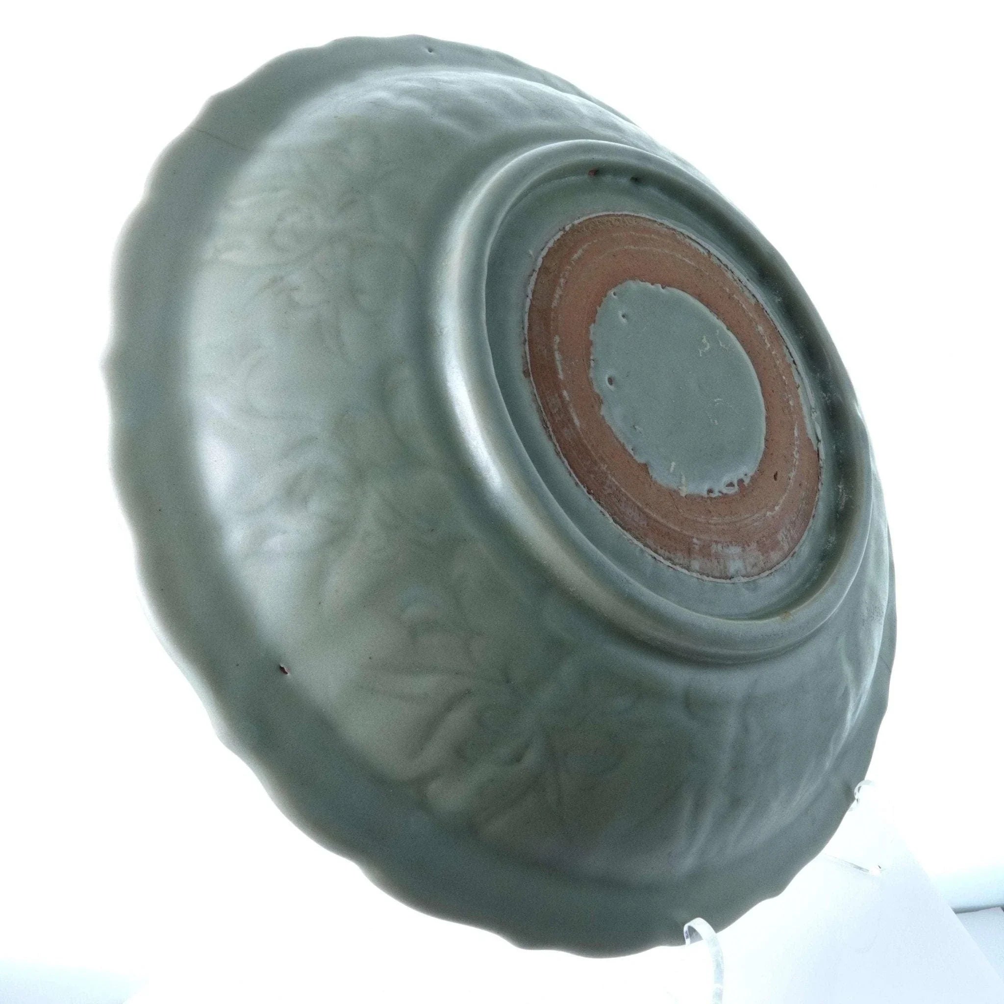 Large Ming Dynasty Chinese Celadon Bowl with Double sided incised Lotus<br>Decoration 13.75" wide x 2.5" deep. 3 very old tight stable hairlines shown in<br>pics. No other cracks, no chips, no restorations. From a collection I'm helping<br>disperse that was put together in the 1950's and 60's by a woman who is now 96.<br>TW130