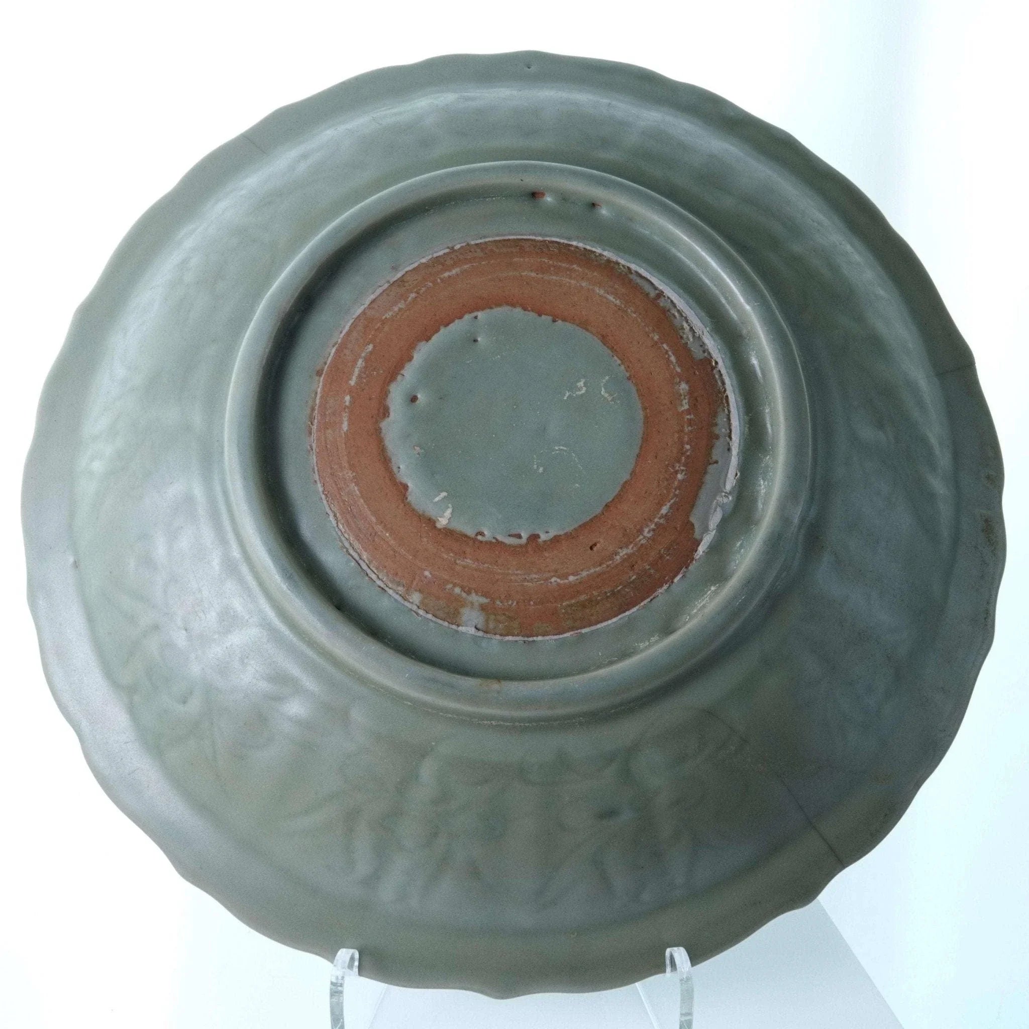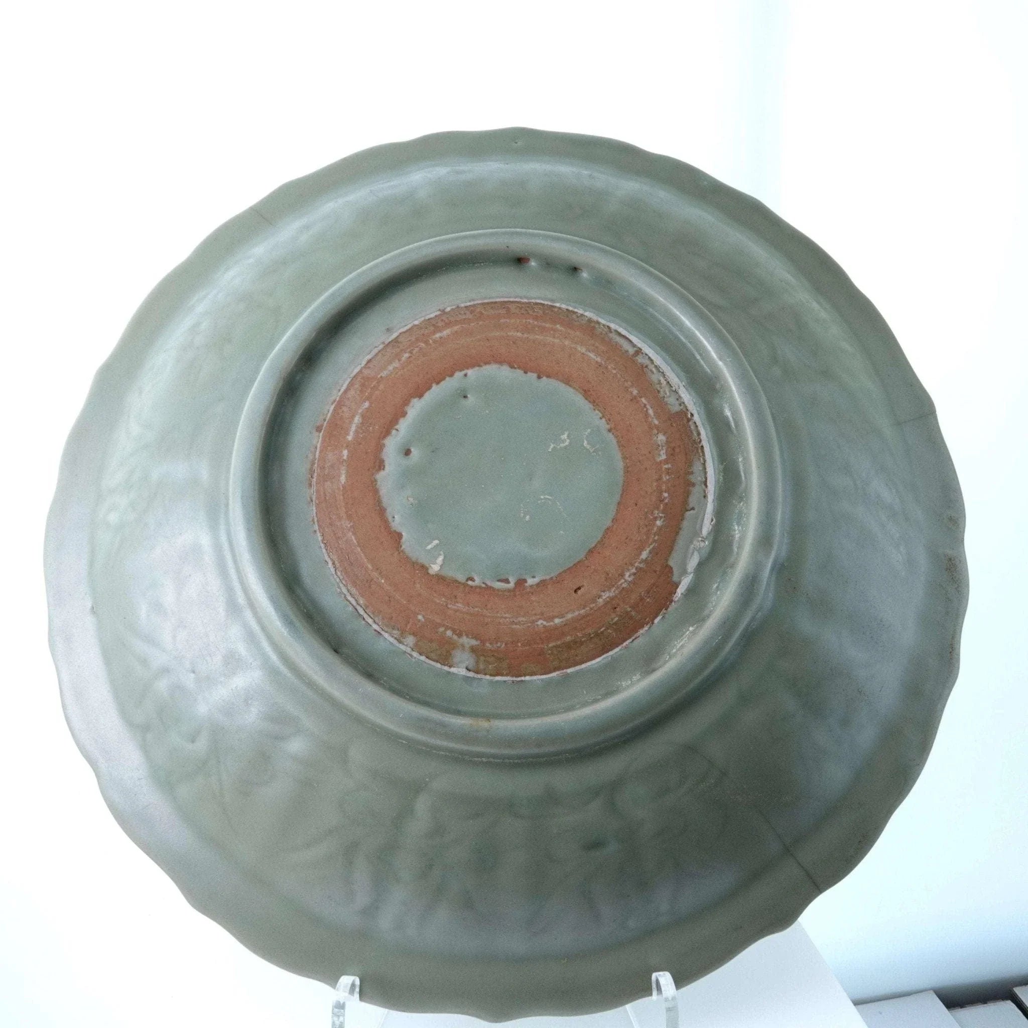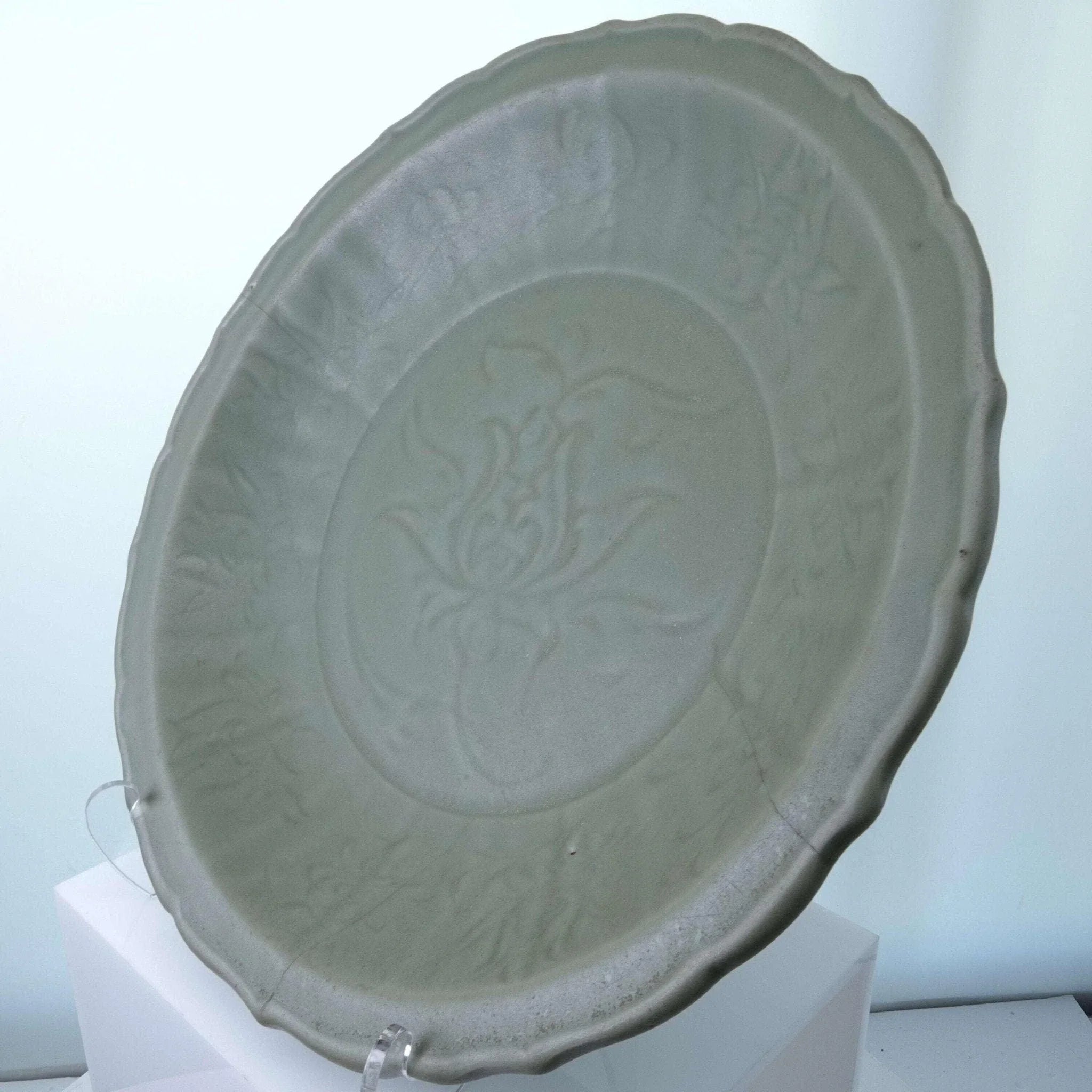 Large Ming Dynasty Chinese Celadon Bowl with Double sided incised Lotus<br>Decoration 13.75" wide x 2.5" deep. 3 very old tight stable hairlines shown in<br>pics. No other cracks, no chips, no restorations. From a collection I'm helping<br>disperse that was put together in the 1950's and 60's by a woman who is now 96.<br>TW130