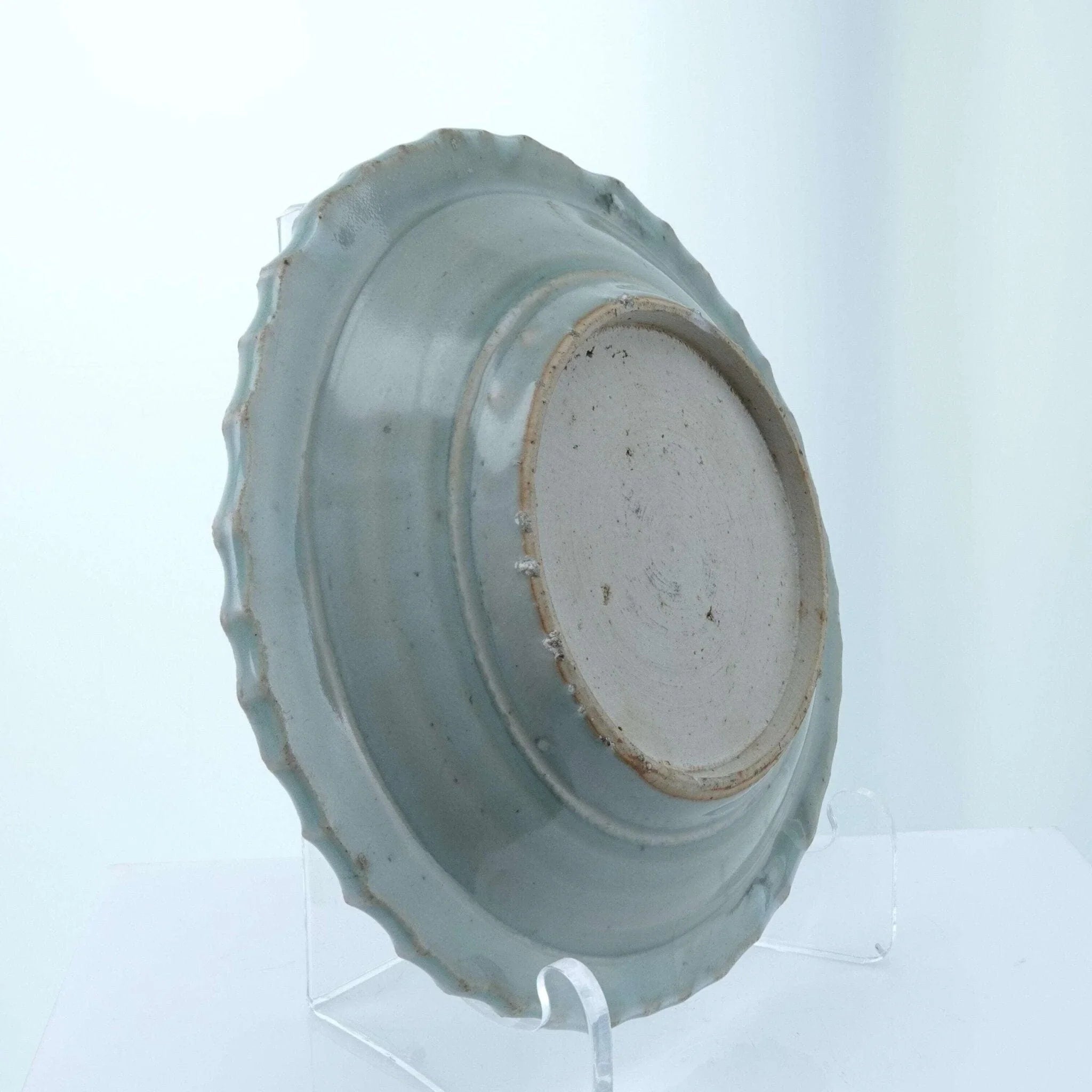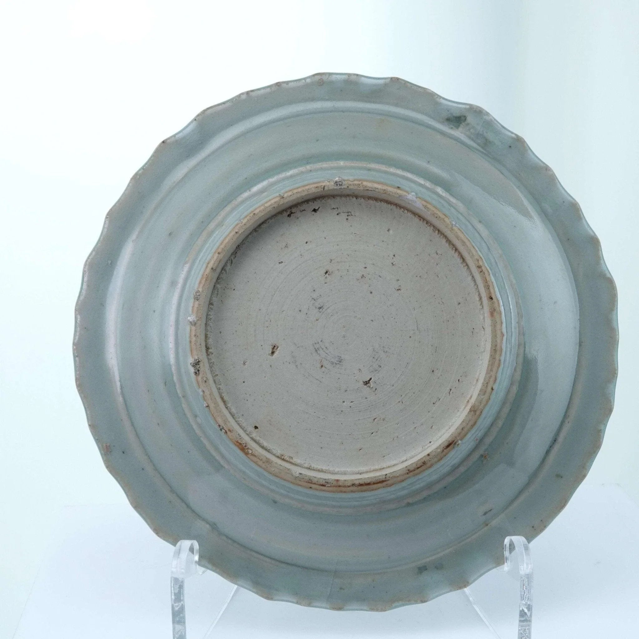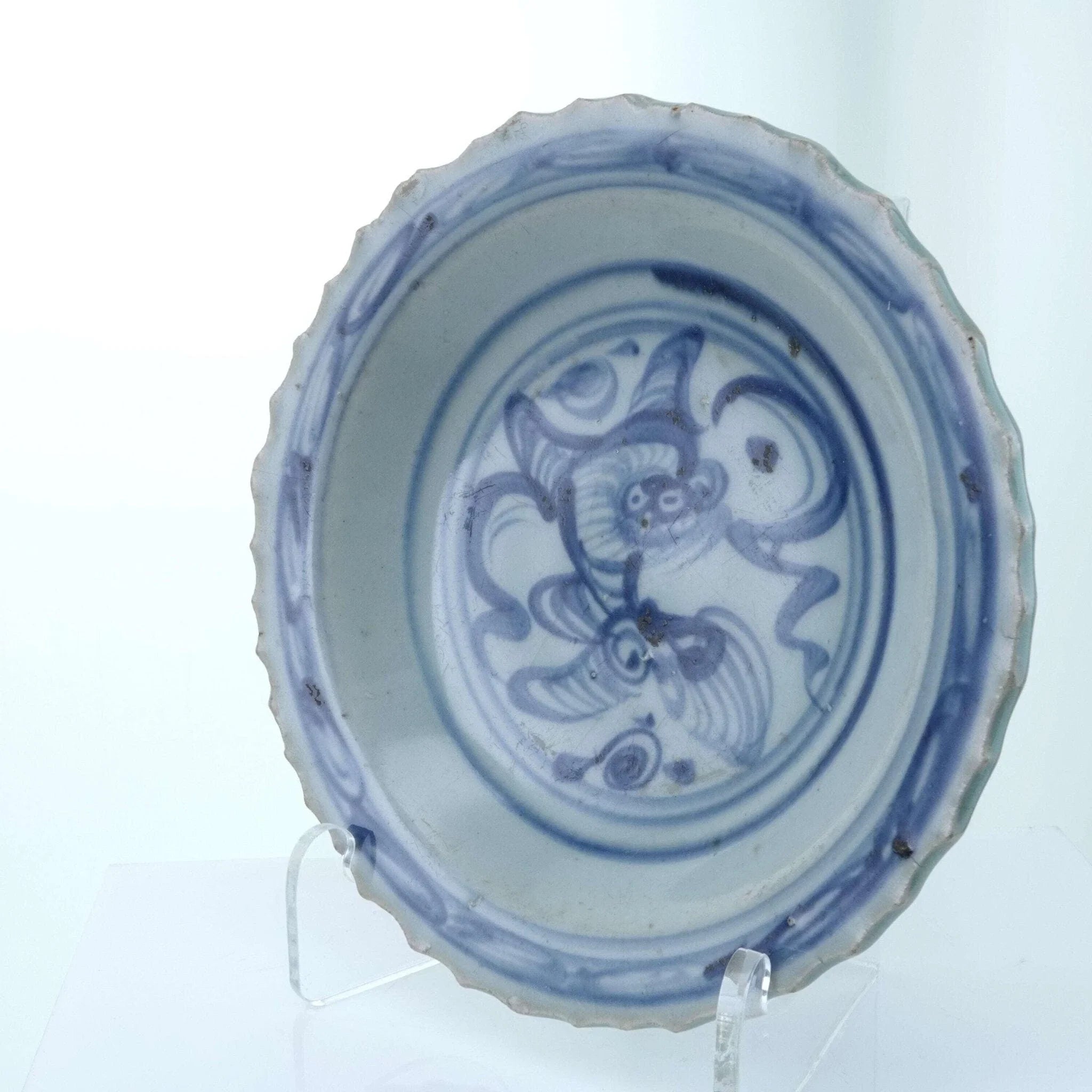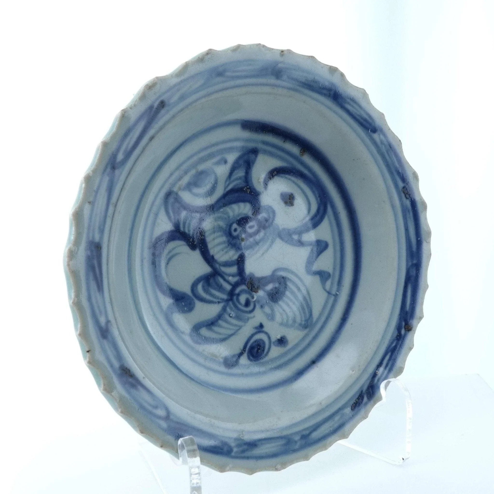 Chinese Ming Dynasty Plate Blue Underglaze 7" One tight hairline less than 1", a<br>few flakes on the barbs and one small chip on footrim. No other chips, cracks,<br>or restorations.<br>TW132