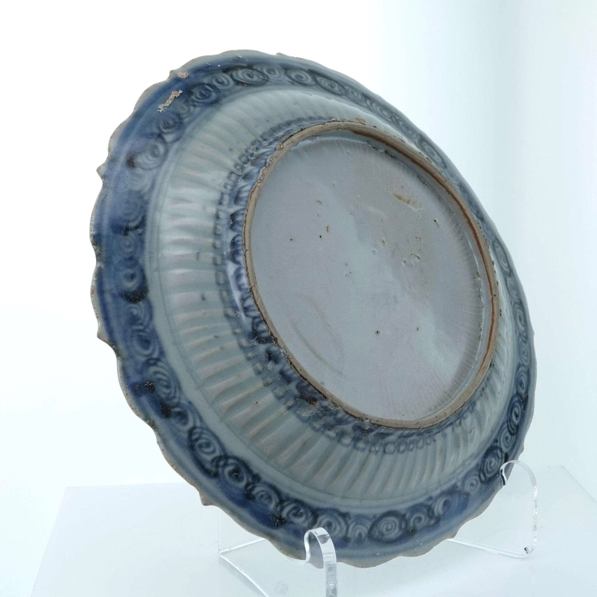 Chinese Ming Dynasty Plate Blue Underglaze 8.25" a few very tiny glaze frits on<br>the sharp points and one tight hairline that extends halfway to the footrim.<br>TW132