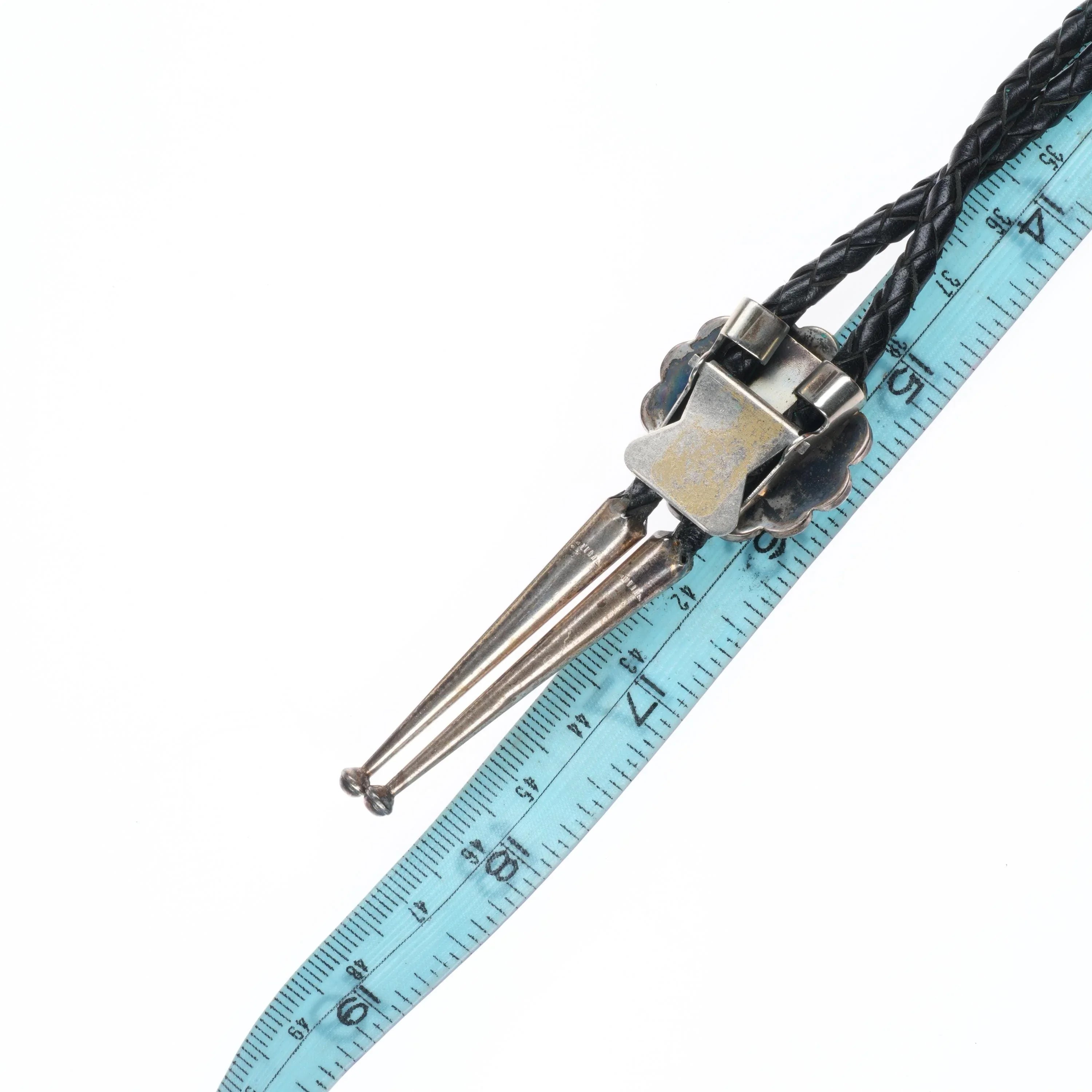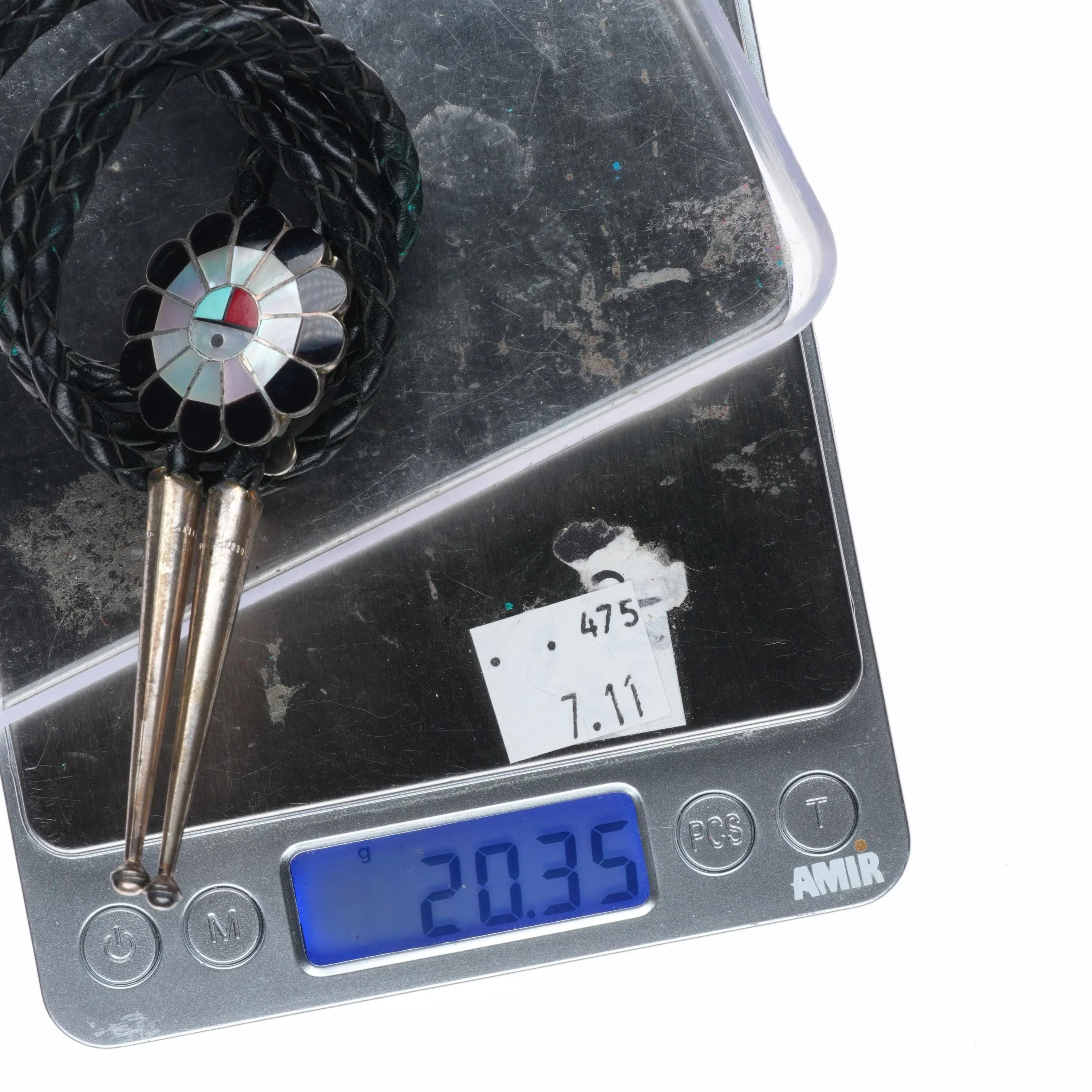 Frederick-Denise Suitza Zuni sterling silver sunface shell/stone inlay bolo tie. Tested and guaranteed solid sterling silver slide and tips. Weight and measurements in pictures. Great bolo, 37" long with no issues. Tray is tared out, so weight shown is just the bolo of course.