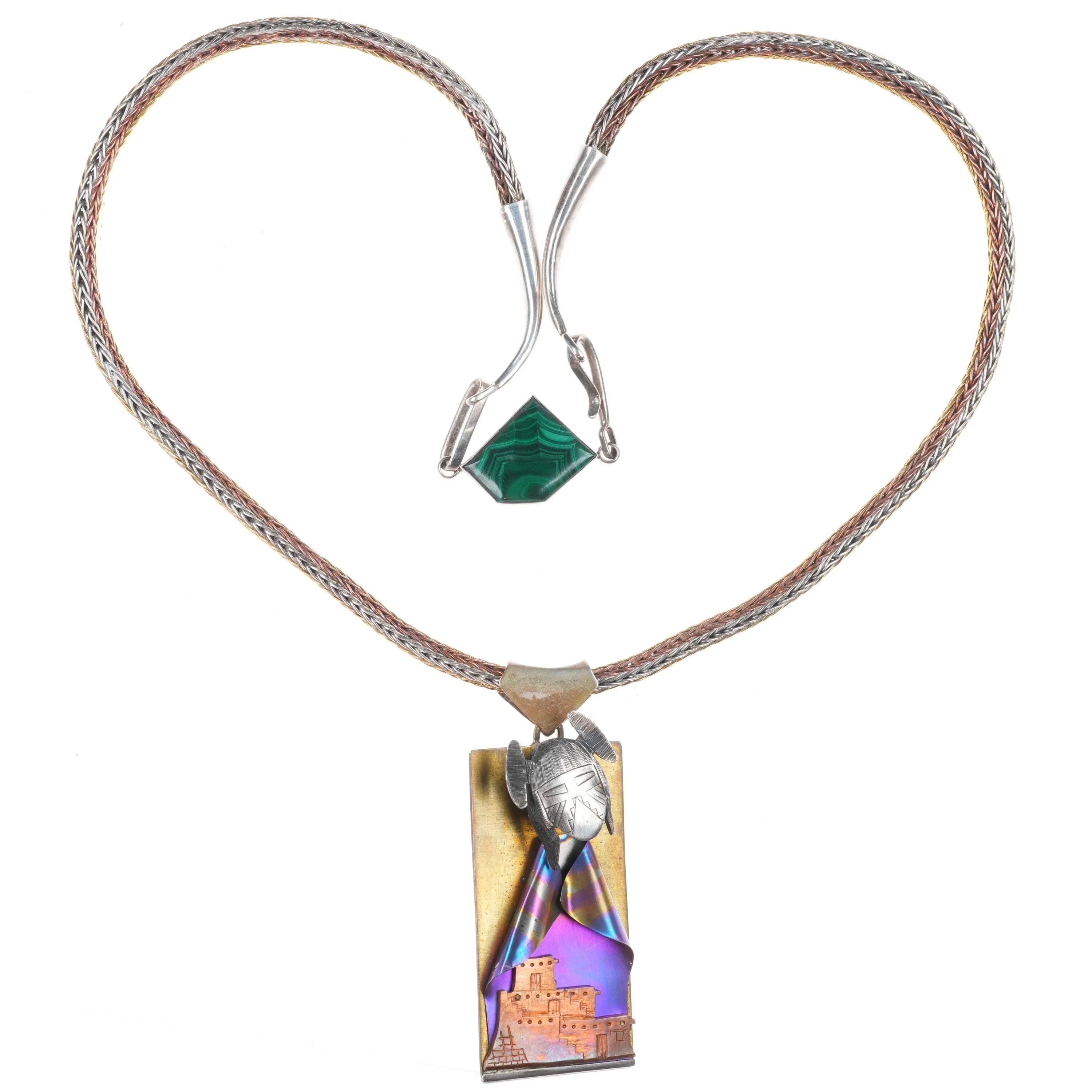 Howard Sice Hopi/Laguna Sterling silver/mixed metal copper pendant/necklace. Mixed metals, made of Sterling, copper, and brass. The Chain is woven copper, brass, and sterling. Solid sterling silver tested and guaranteed with no markings other than artists hallmark on the pendant in the back, weight and measurements in the pictures. No issues, circa last quarter of the 20th century. 25" long.