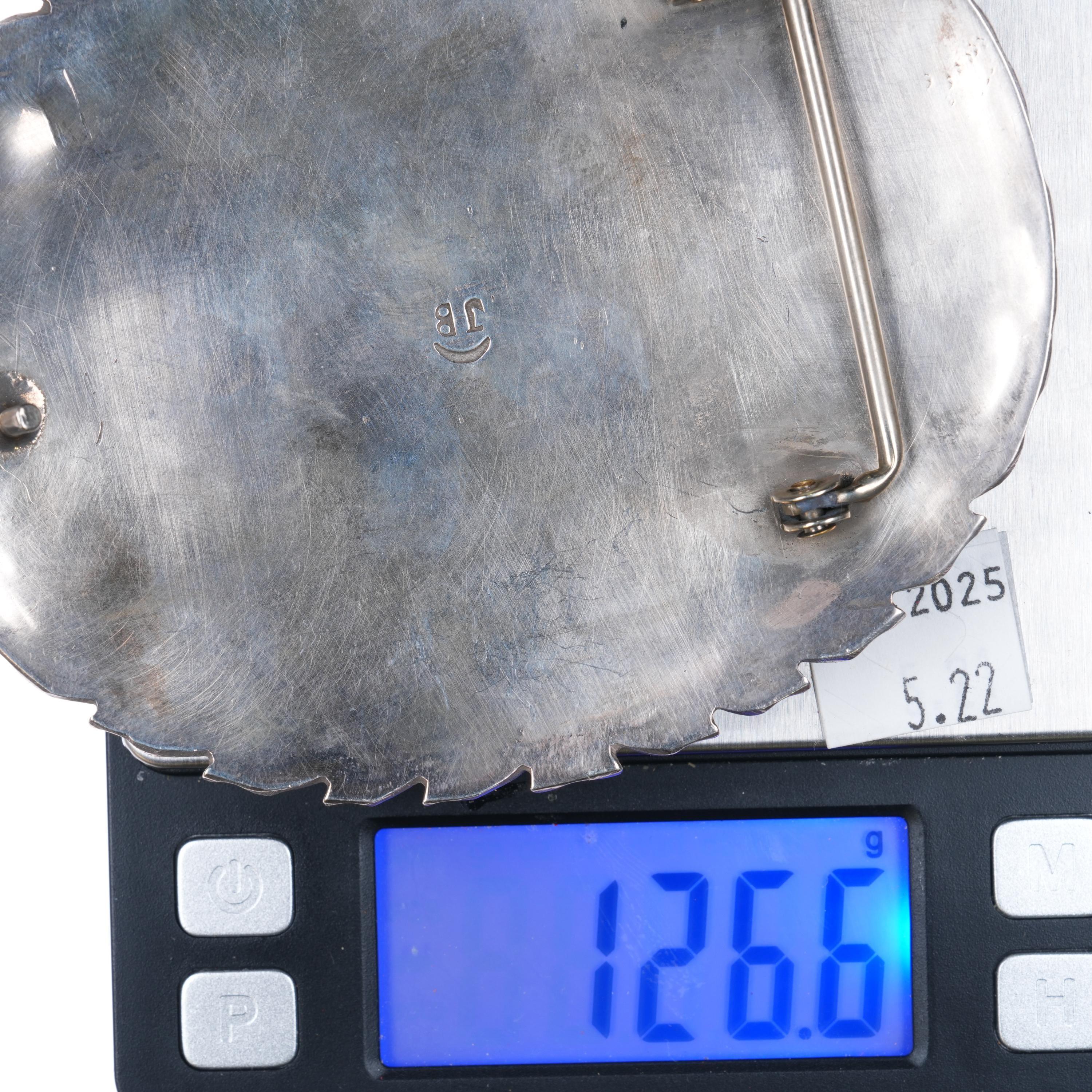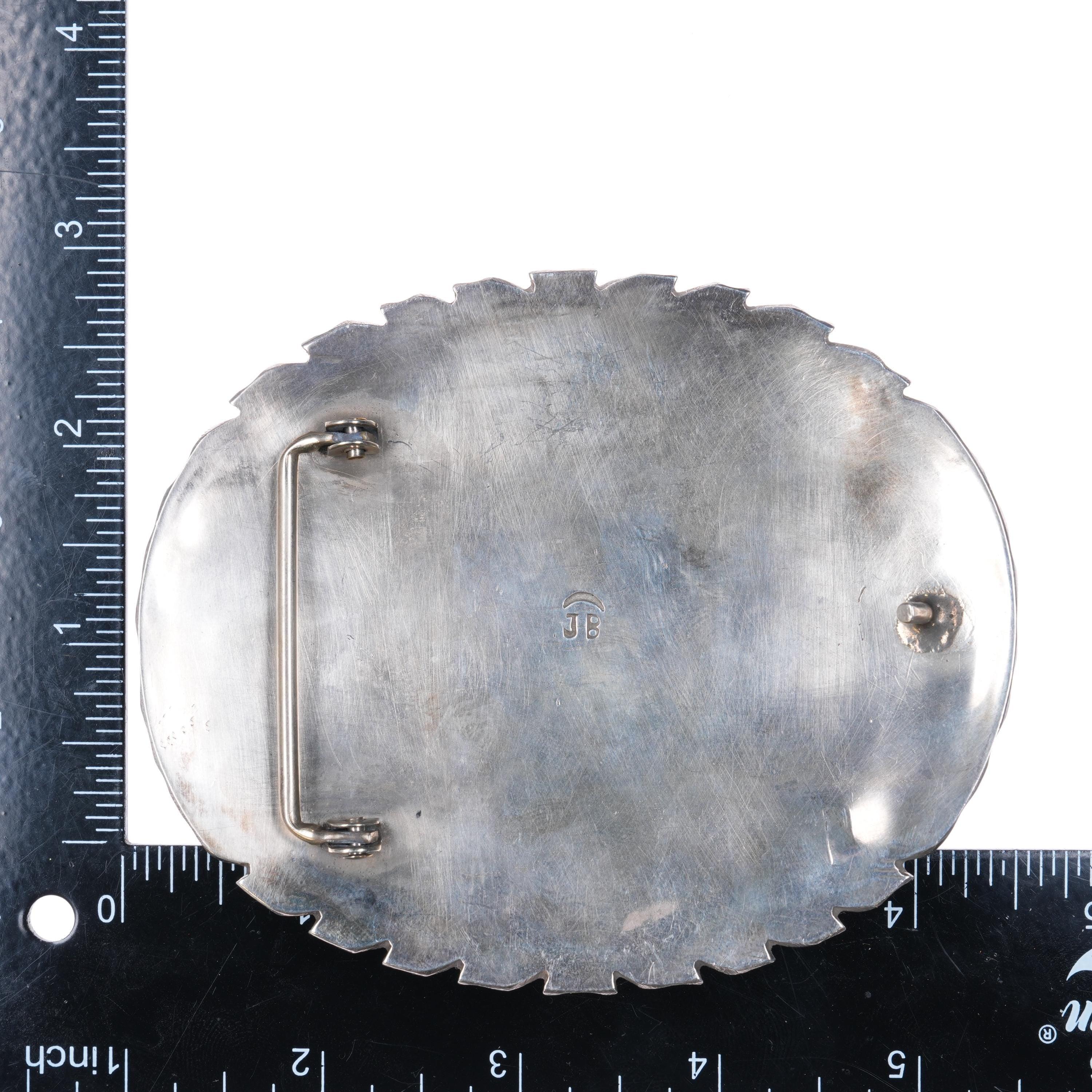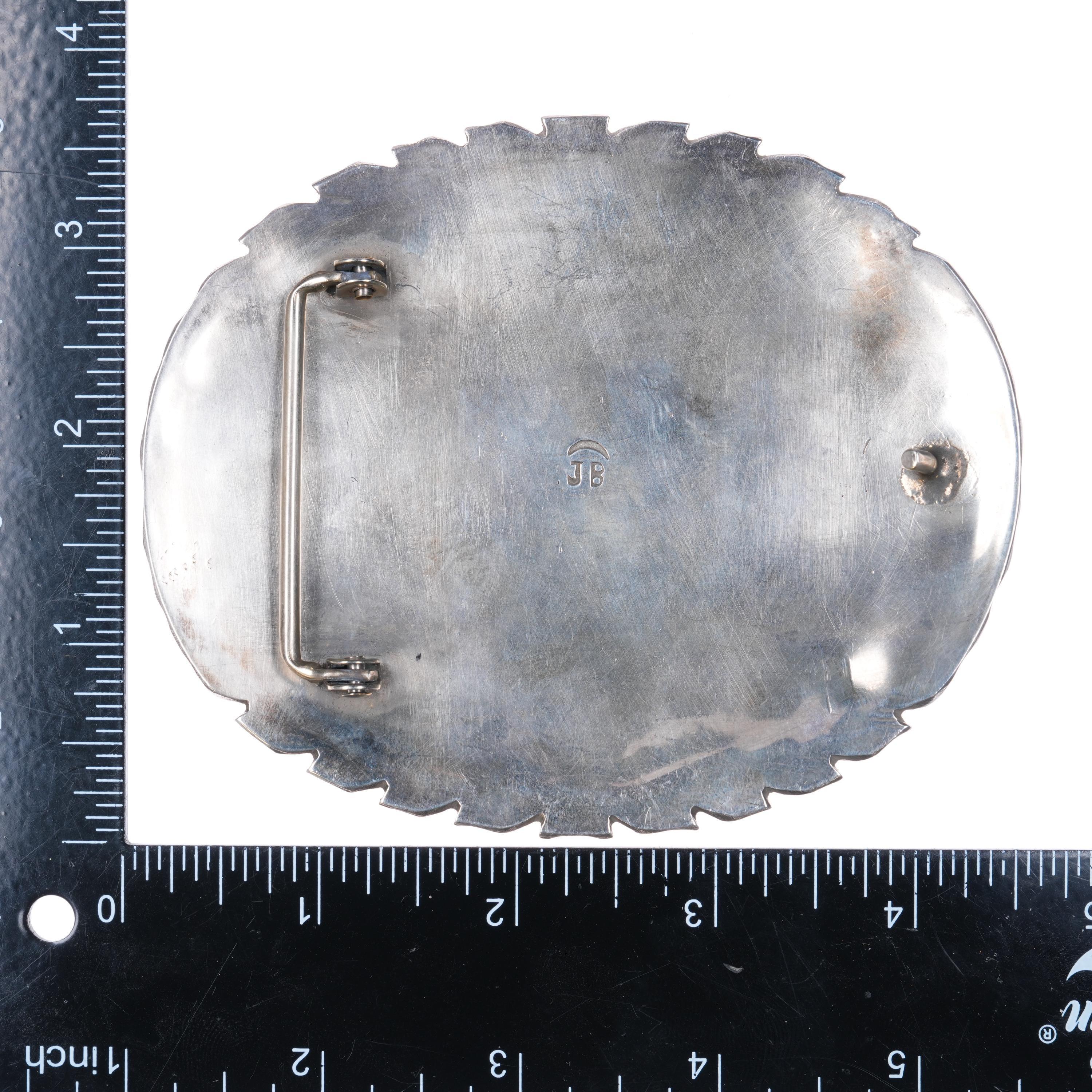 Huge JB 70‘s-80‘s Vintage Navajo sterling silver inlaid belt buckle turquoise. Solid sterling silver (tested) buckle with weight and measurements in pictures.. Fits up to a 2" belt. No issues, appears possibly unworn.