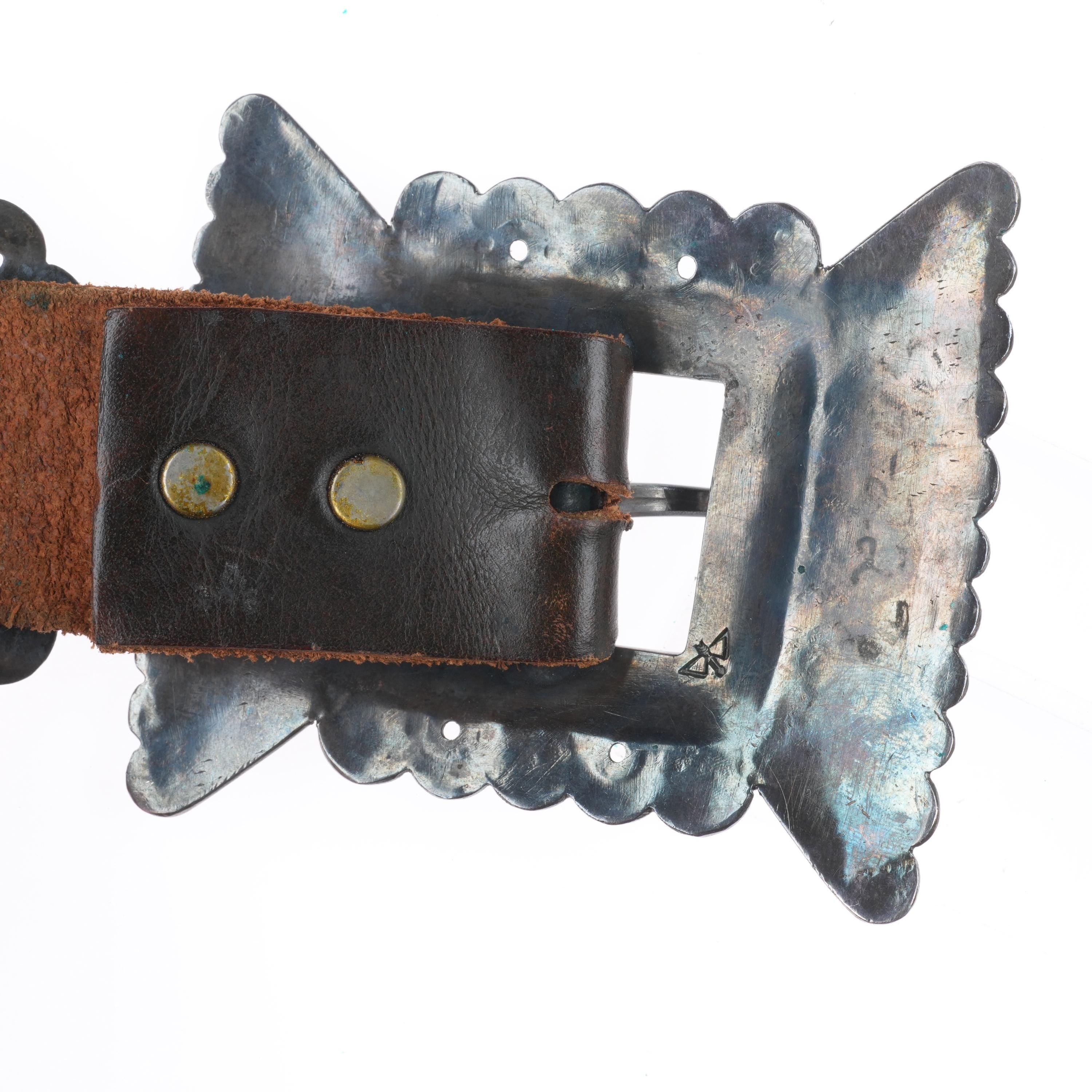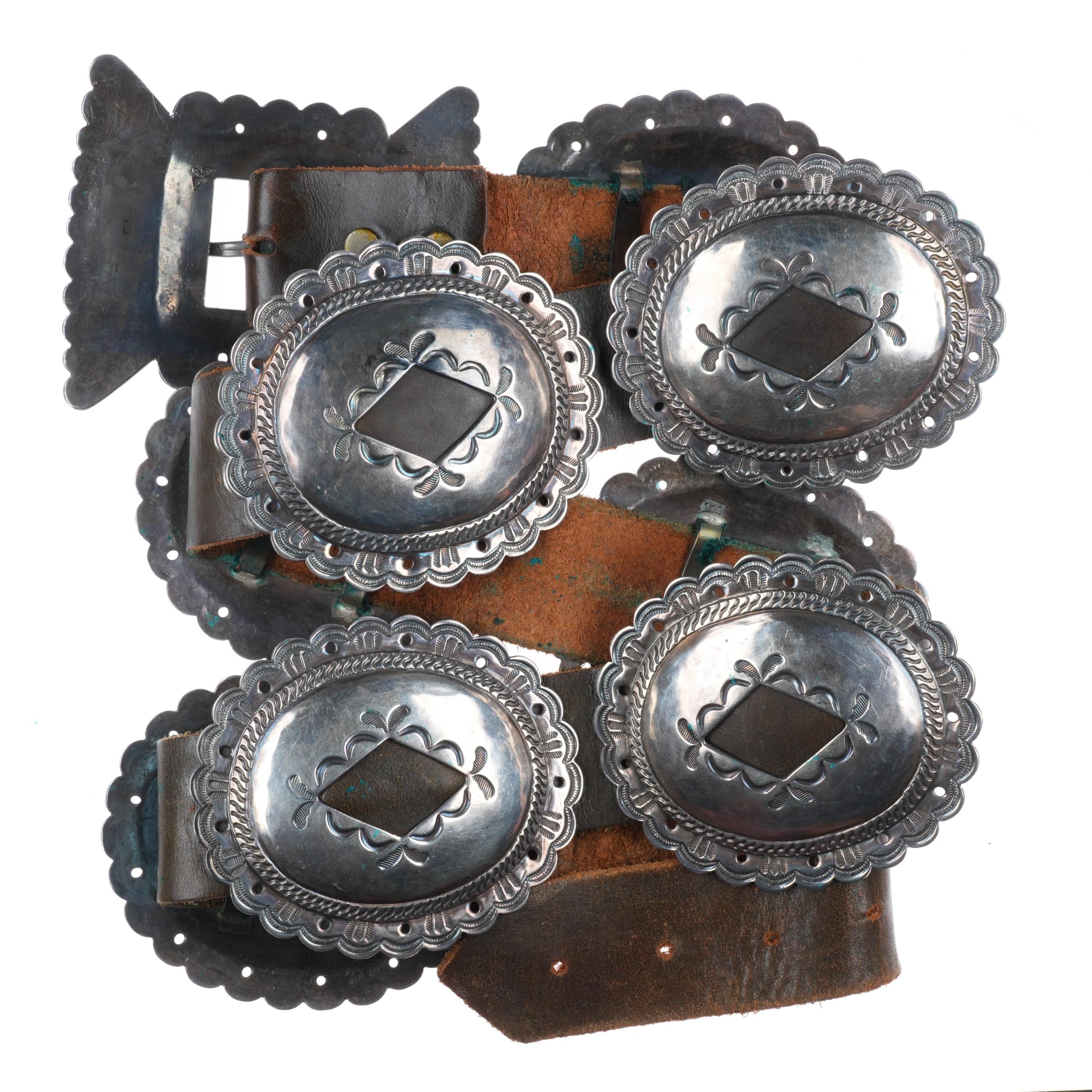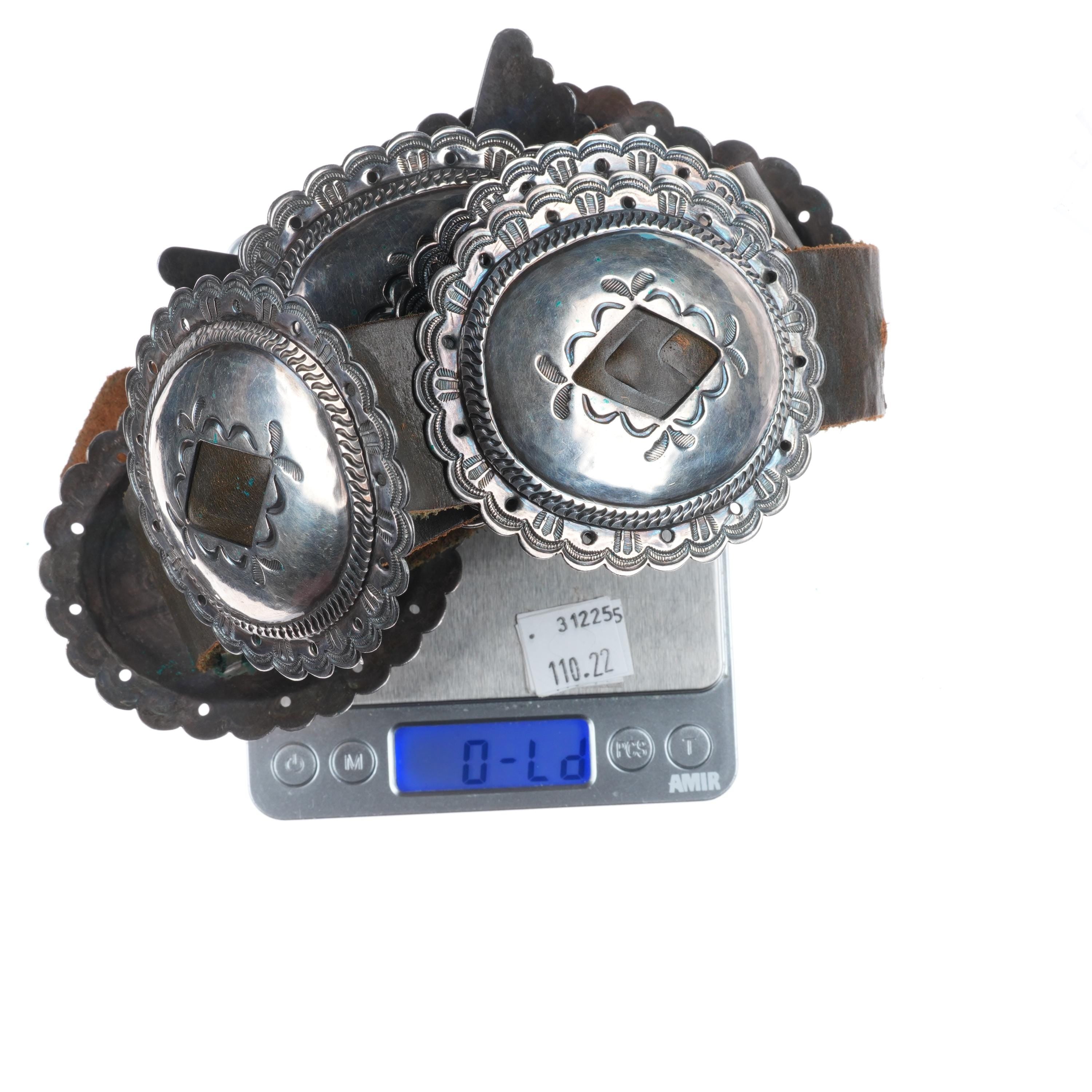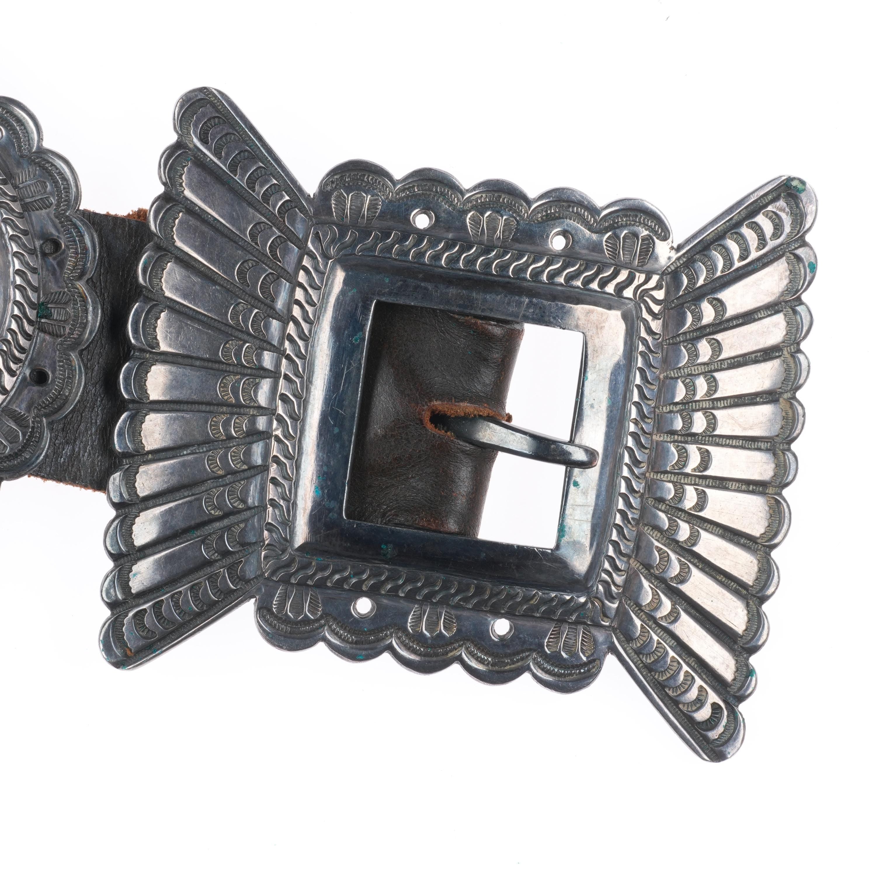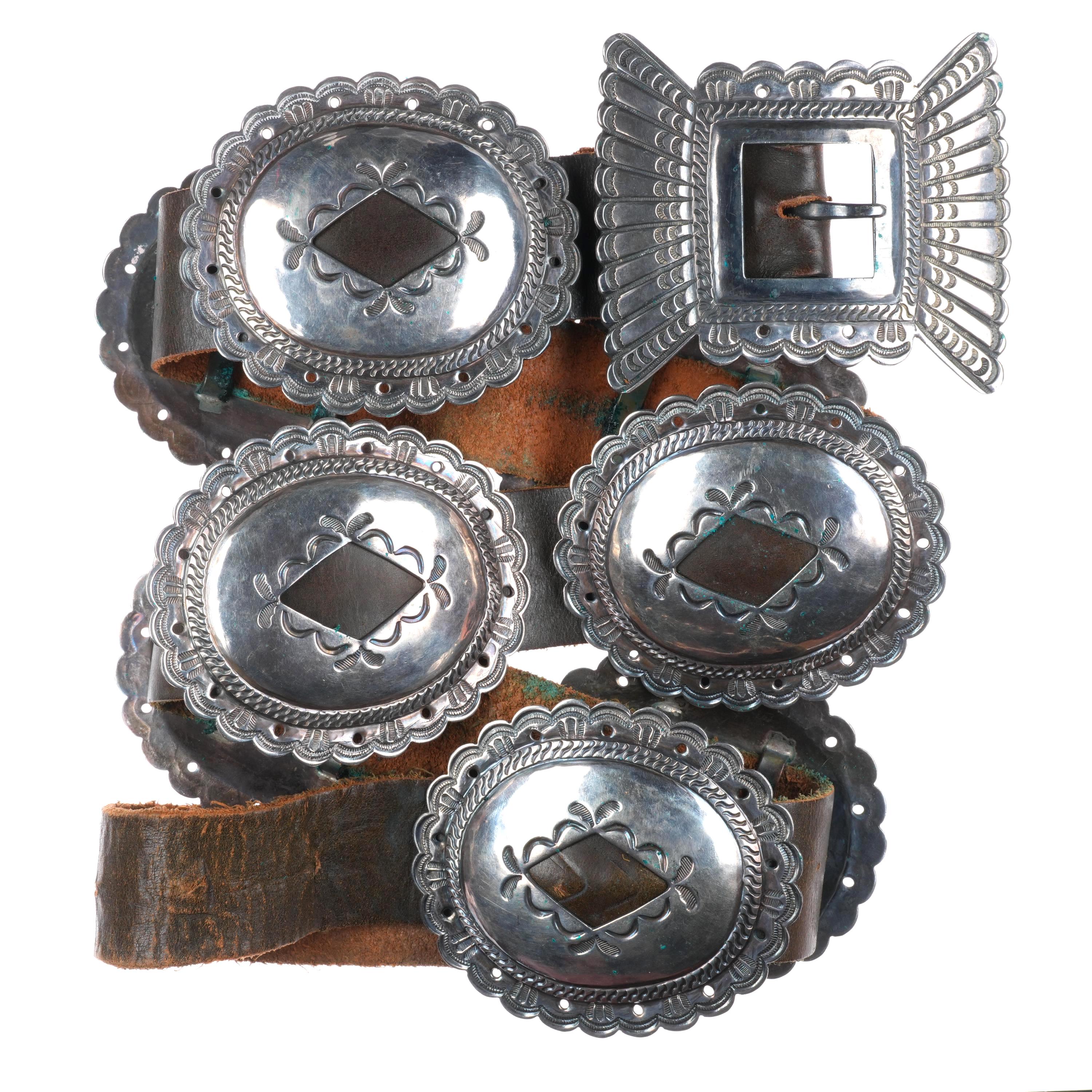 Ike Wilson (1900-1942) Navajo First Phase style sterling silver concho belt Fits up to a 40" waist but obviously could be worn shorter. Tape measure shown in pics.. Weight and measurements in pictures. No damage or issues, tested and guaranteed solid sterling silver. 8 Conchos and one buckle, circa second quarter of the 20th century, hallmarked as shown. 570 grams.