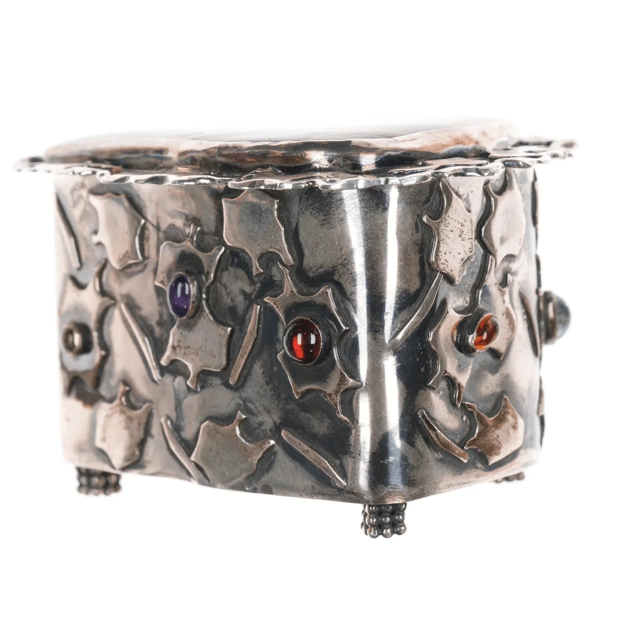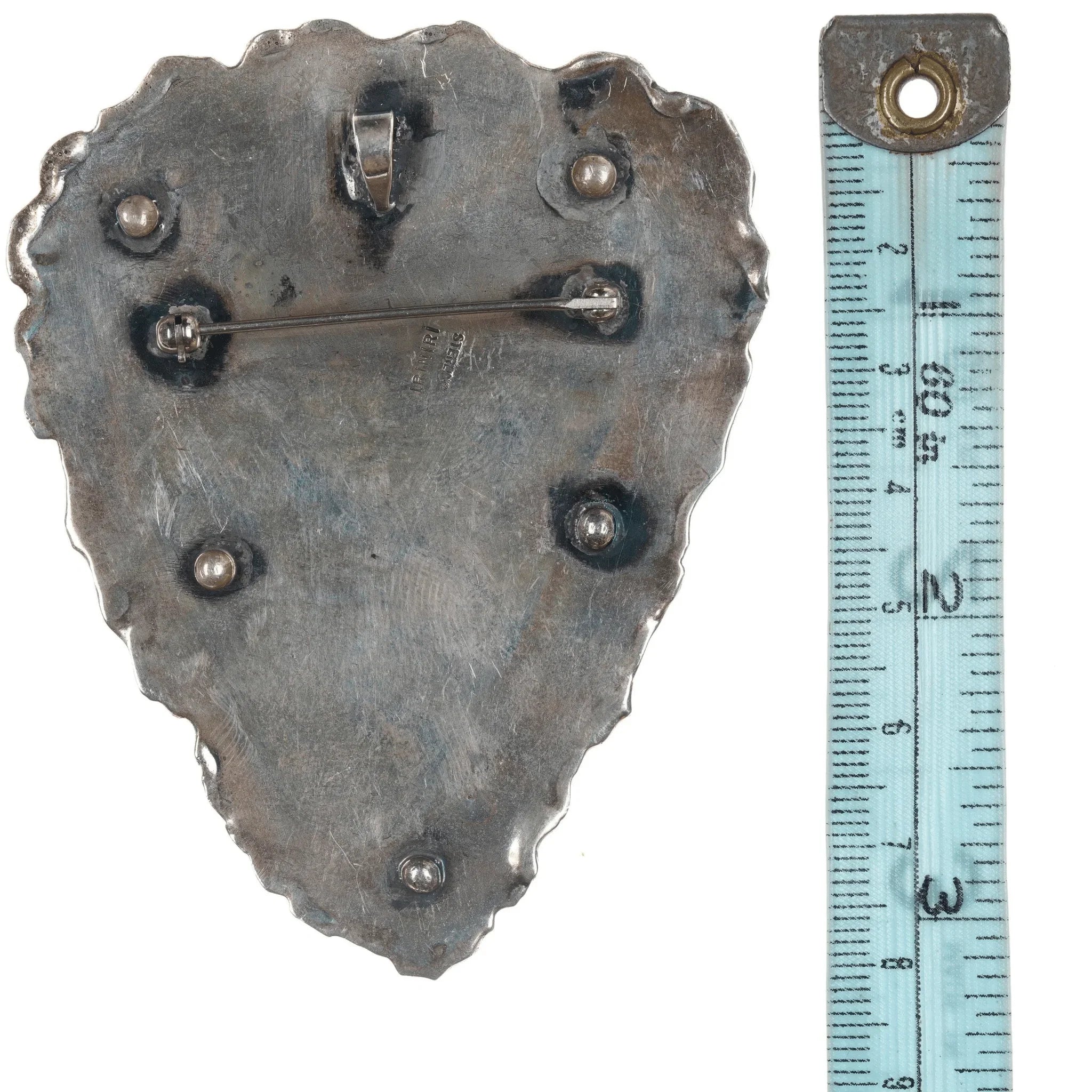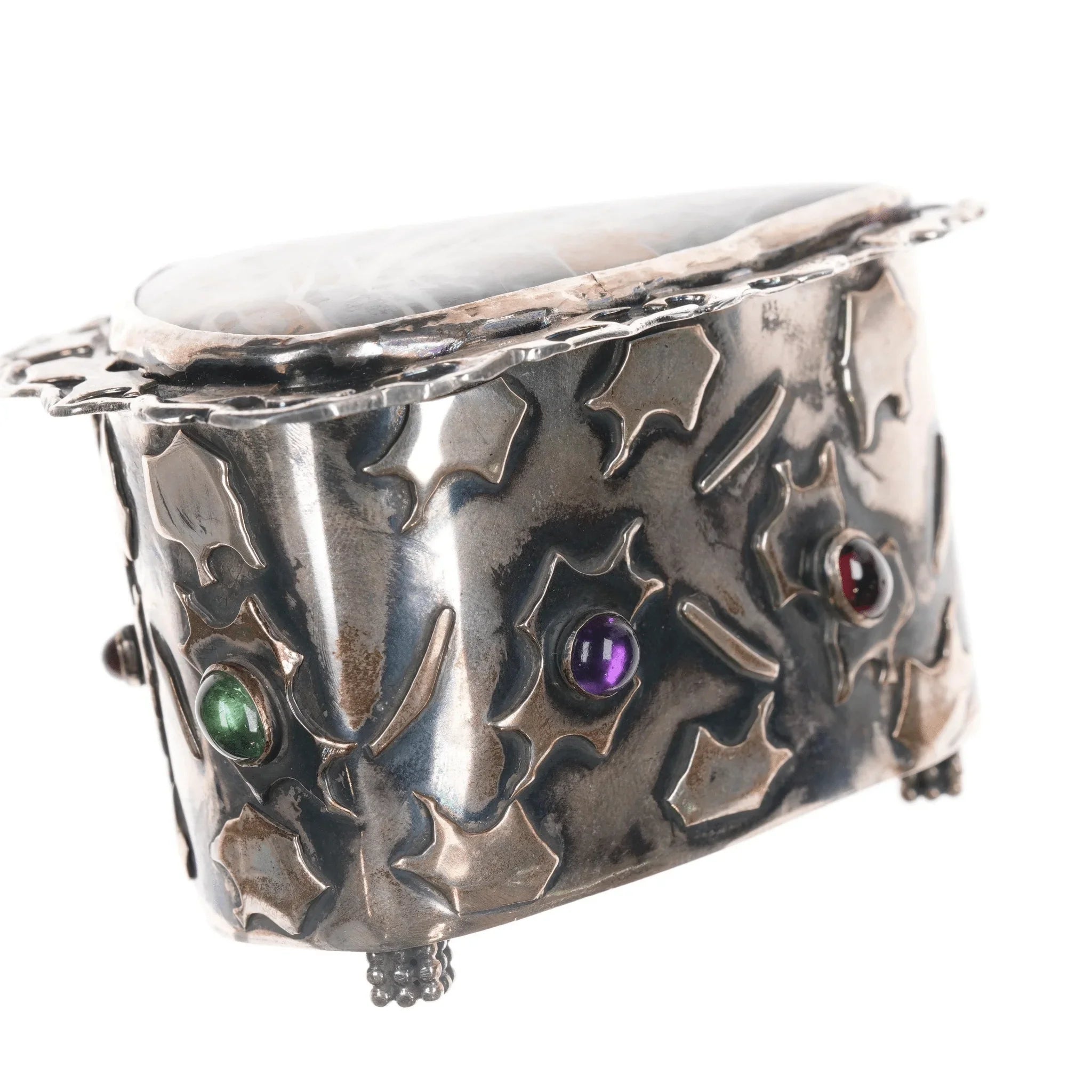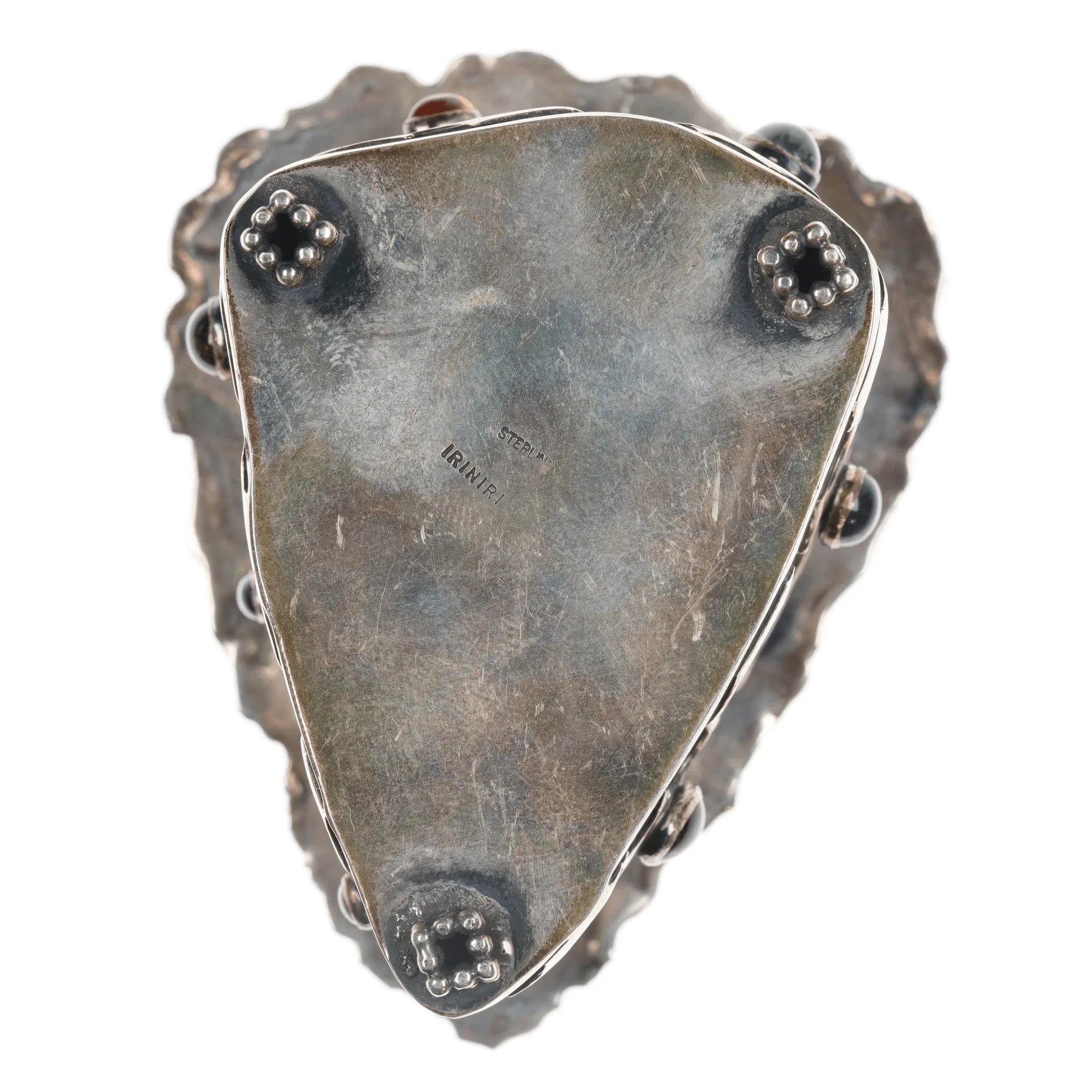 Iriniri Gemstone mounted Sterling silver box/pendant/pin. Very cool box who's lid doubles as a pendant/pin. 2" deep, 114.2 grams, other measurements in pics. The lid/pendant is Sterling with a large cabochon of some sort of petrified something or other.