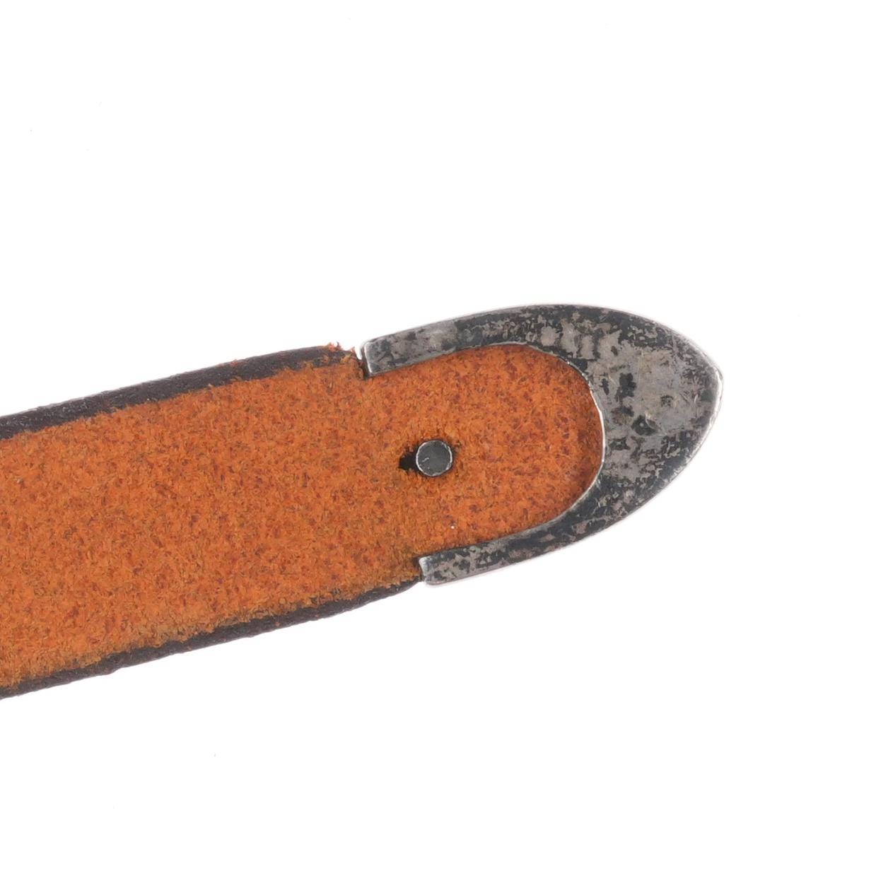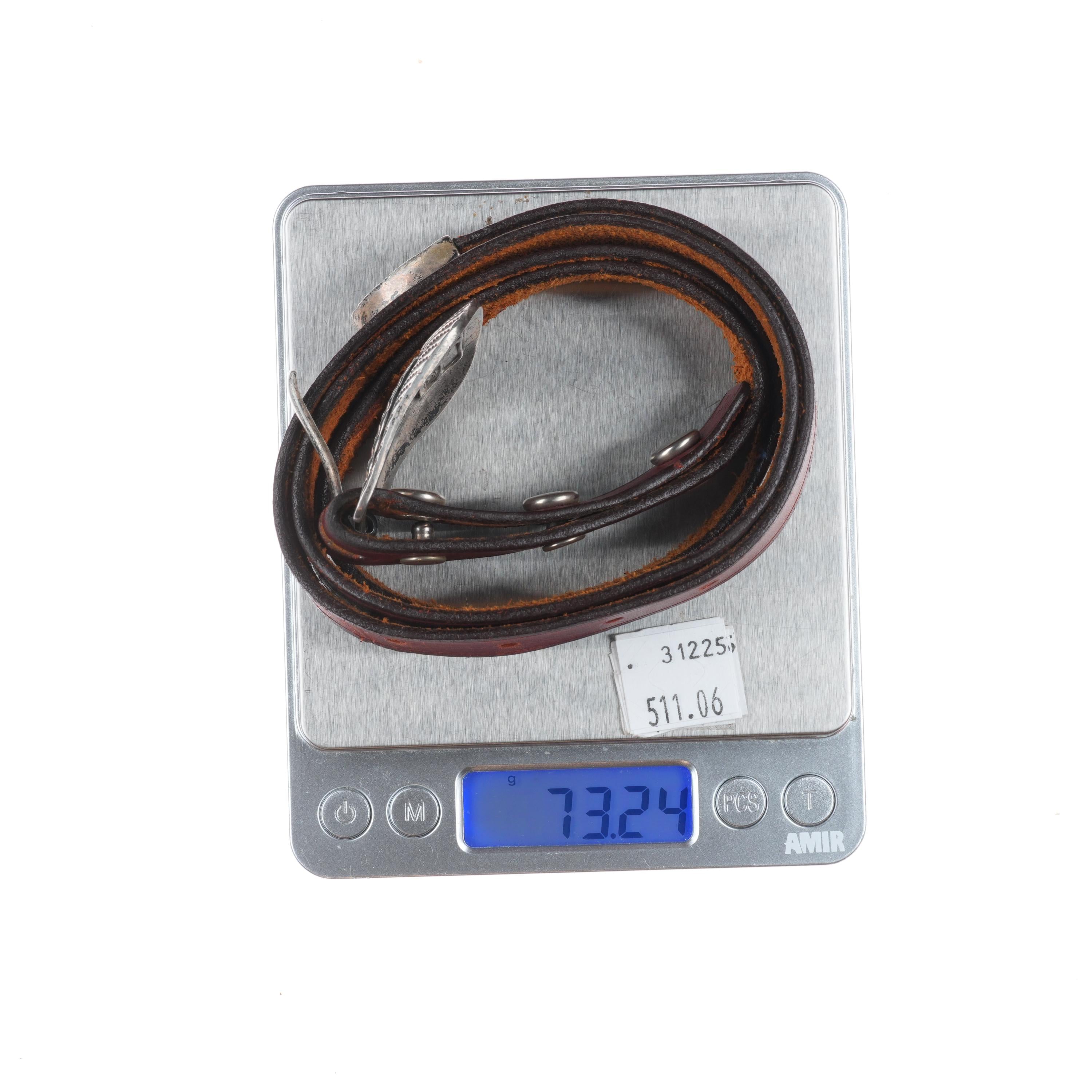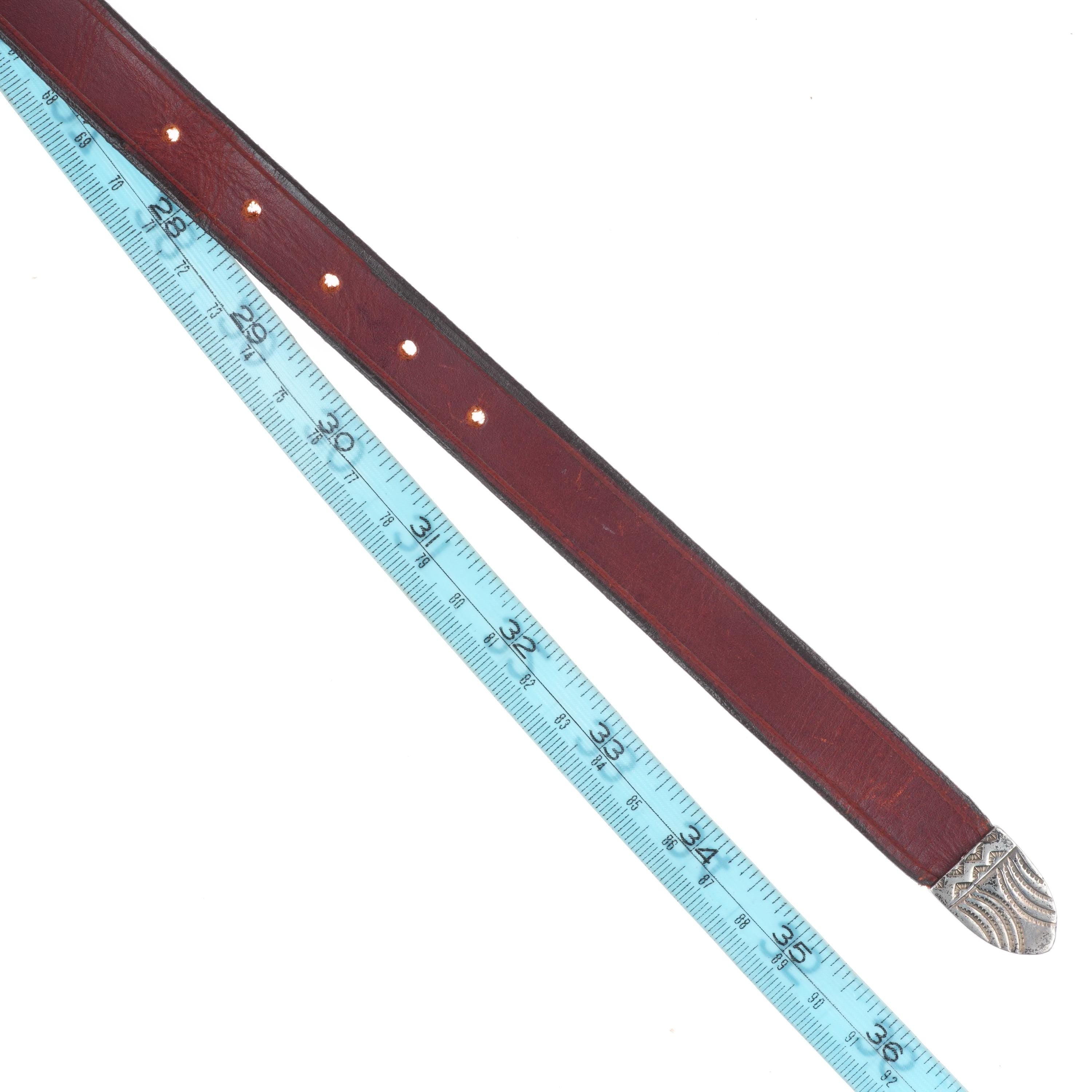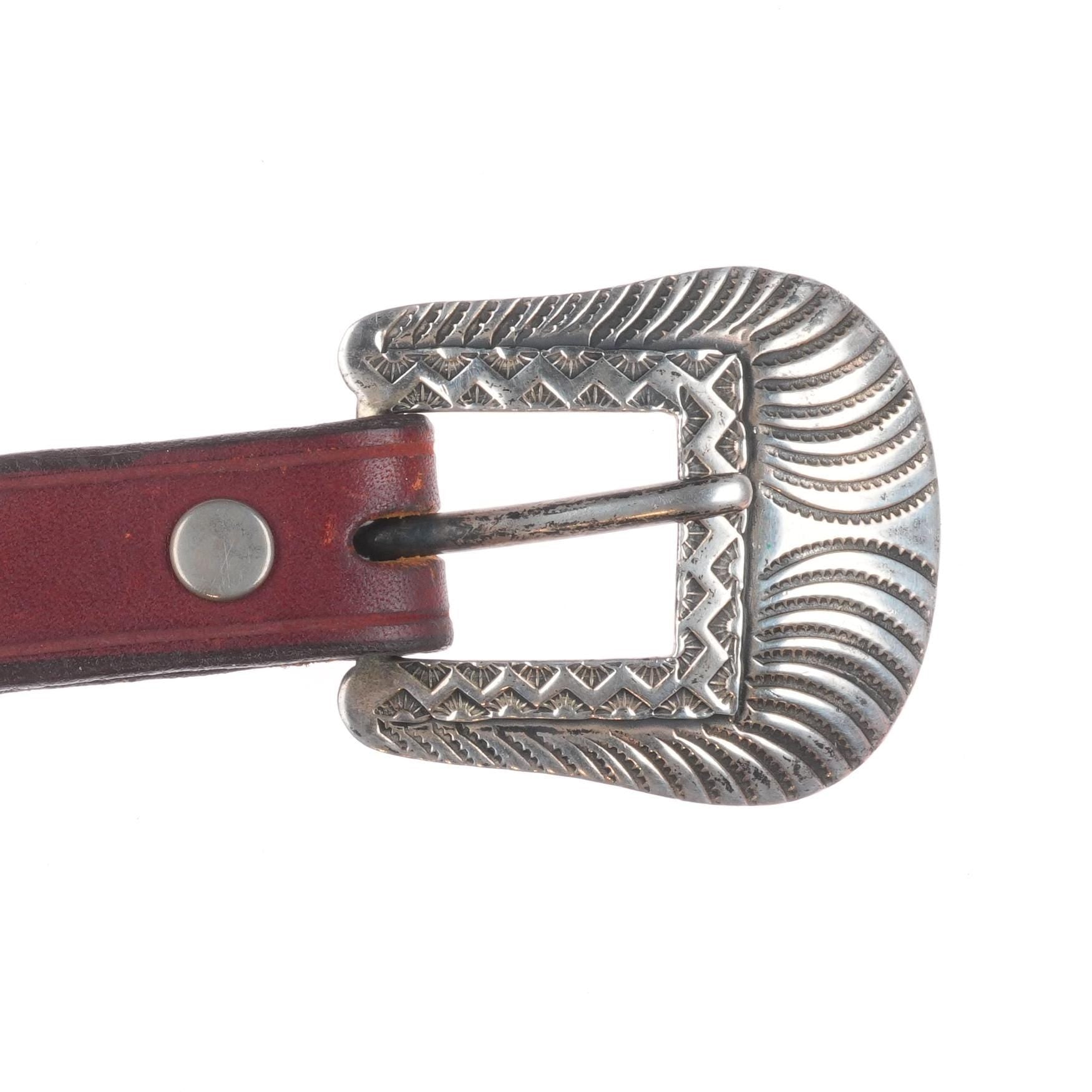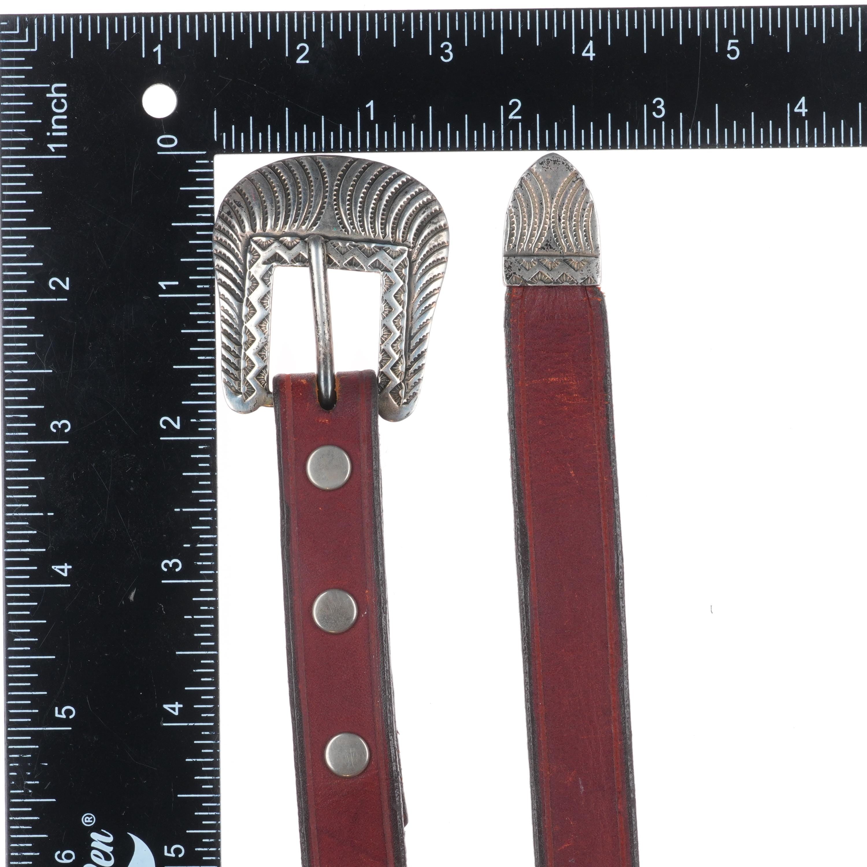 James Reid Santa Fe Southwestern Sterling silver belt buckle/tip. Vintage set with some expected wear but no significant issues. Fits up to 3/4" ranger belt. Ranger belts are wider and taper down at the buckle/keepers/tip. No keeper, Last hole is at 31", more holes could be added or it could of course be worn shorter.