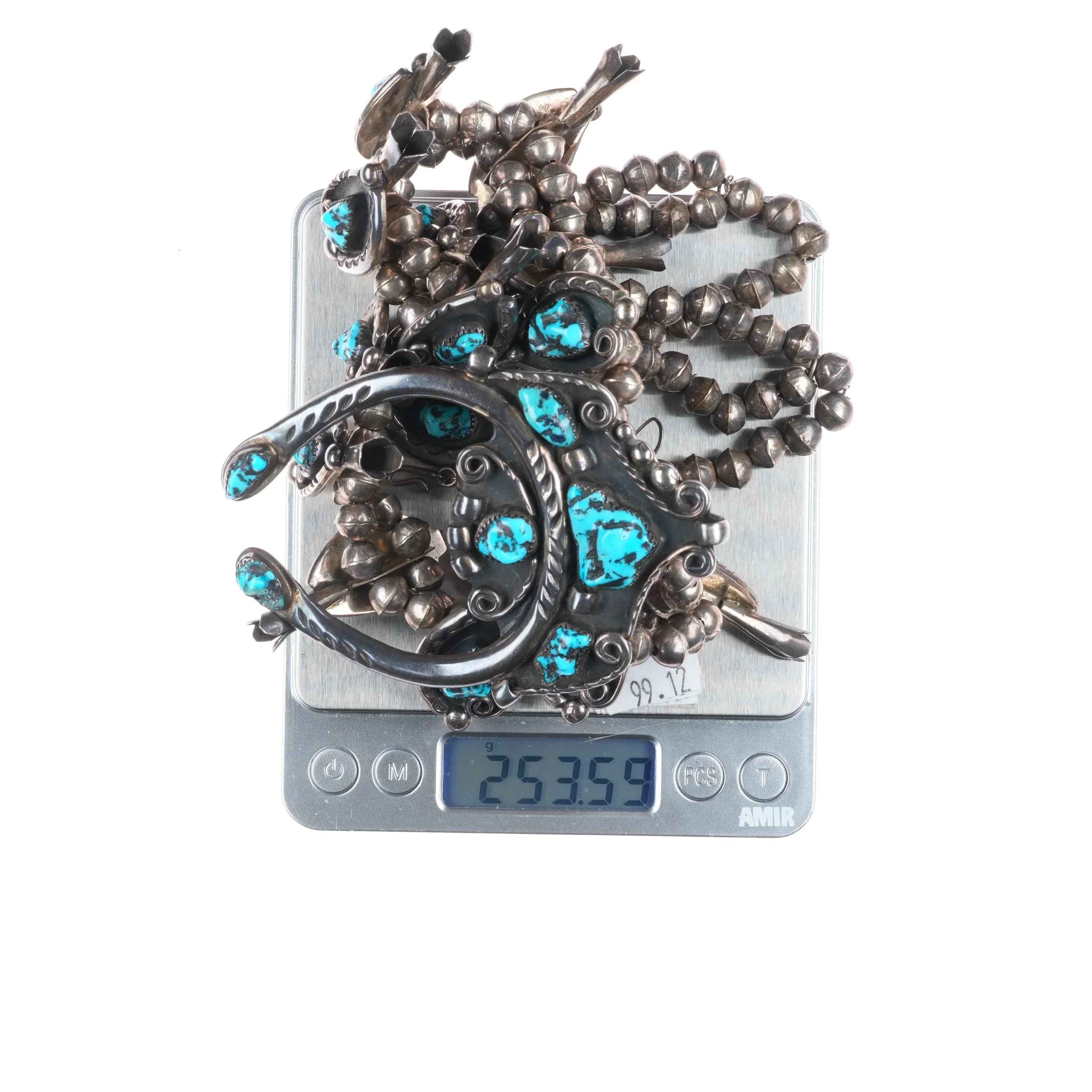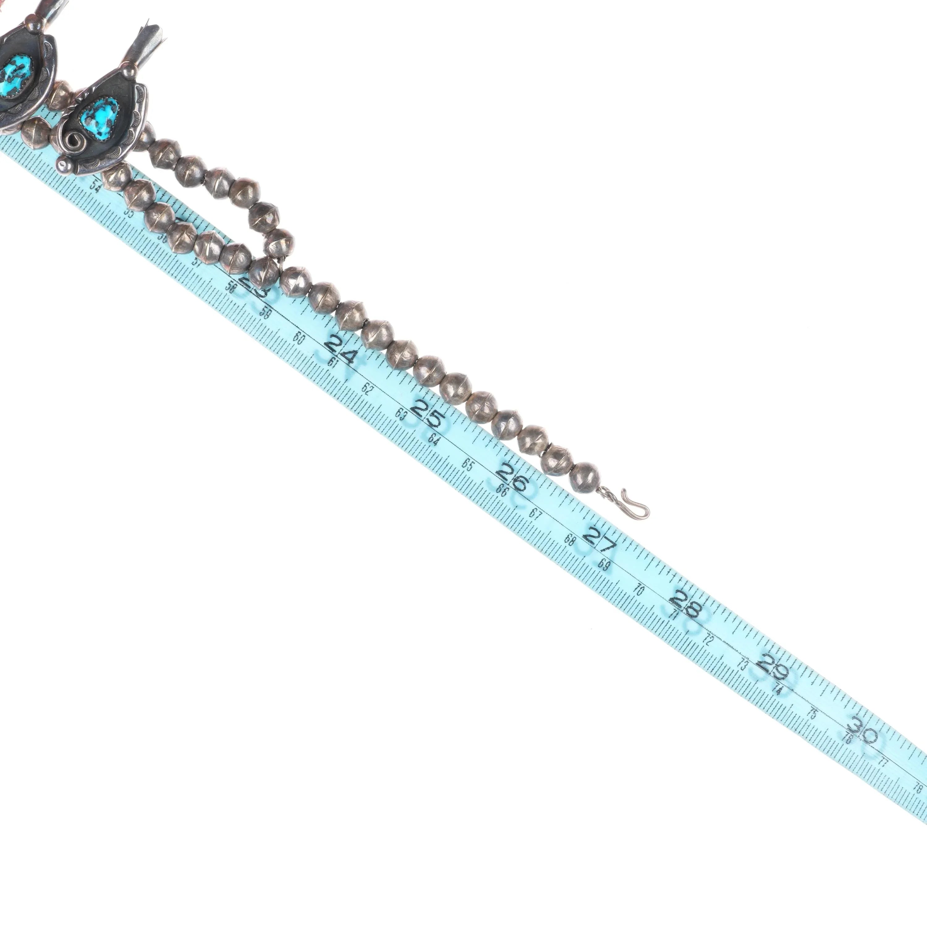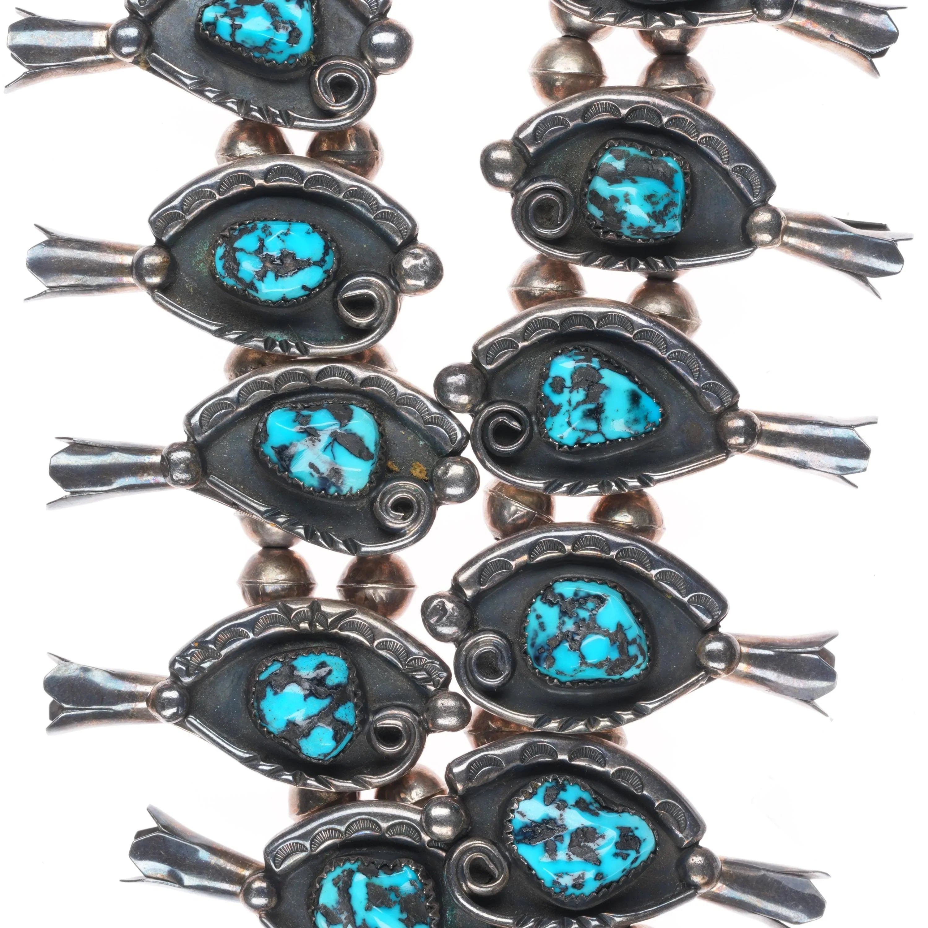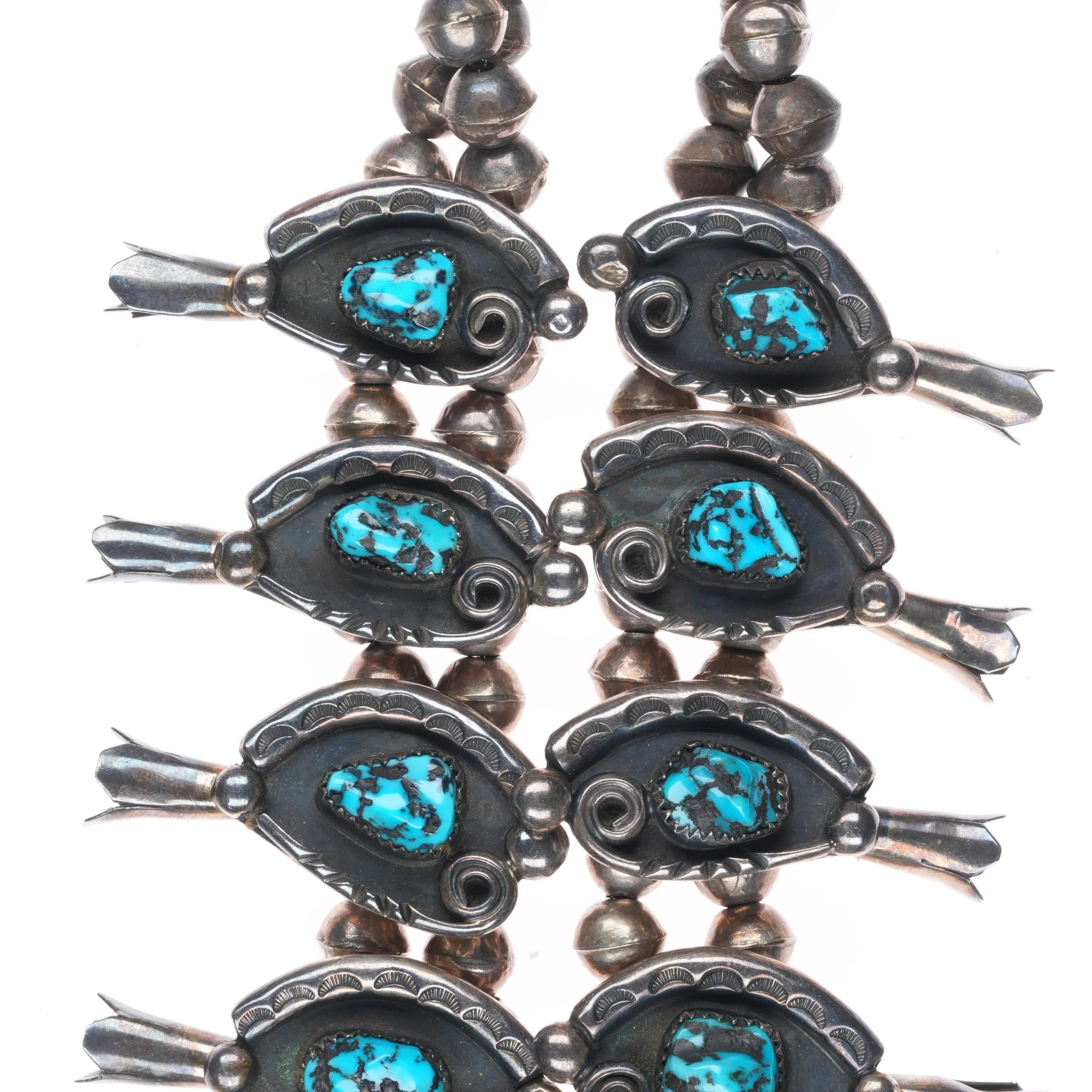 Jimmy Long Navajo turquoise vintage sterling silver squash blossom necklace with earrings set. Circa third quarter of the 20th century, tested and guaranteed solid sterling silver. No apparent issues. 27" long. Marked on back as being Lone Mountain turquoise, I‘m not sure if that was a later attribution or not. It is nice turquoise, but I‘m not sure it‘s Lone Mountain. I just noticed that these earrings are not an exact match, but both appear to be made by the same hand.