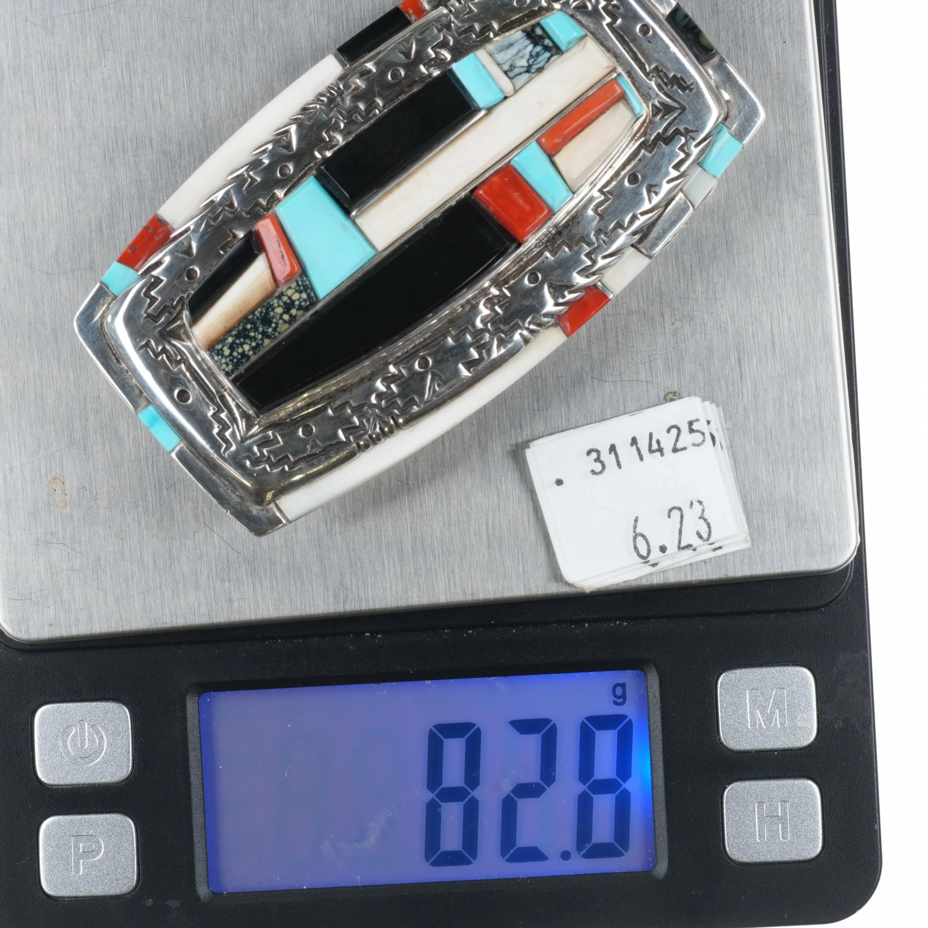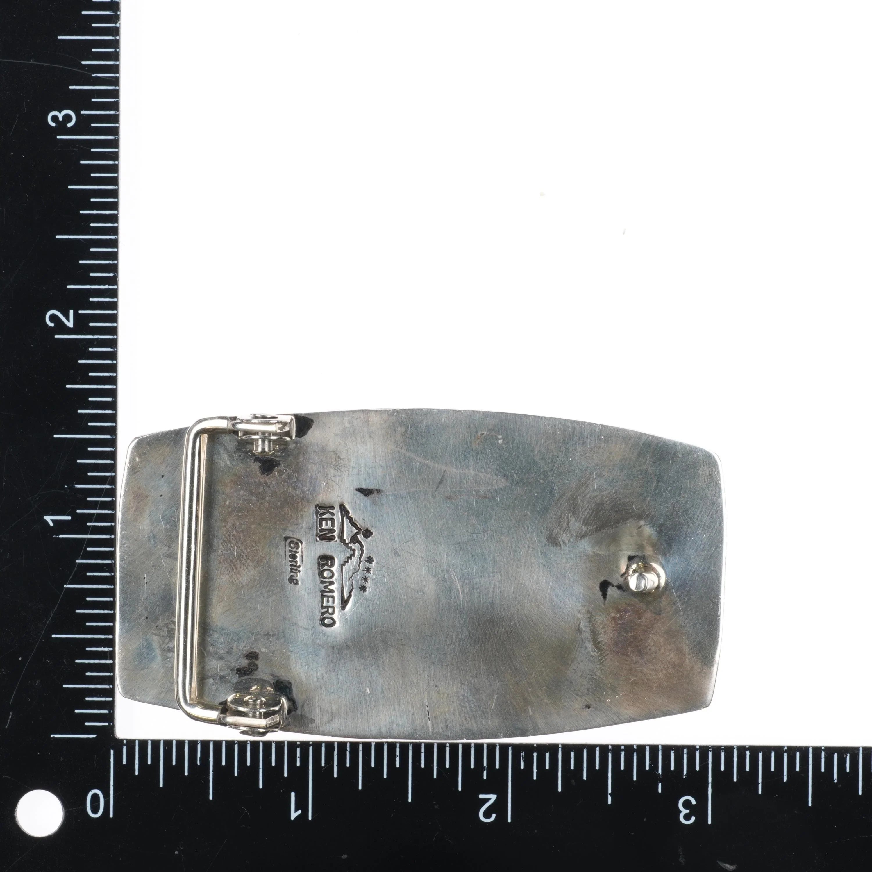Ken Romero Taos/Laguna sterling silver cobblestone inlay belt buckle turquoise/coral. Tested and guaranteed solid sterling silver, fits a 2" wide belt. No issues, some expected wear. Circa last quarter of the 20th century. Weight and measurements in pictures. Signed illegibly with a hallmark I don‘t recognize.