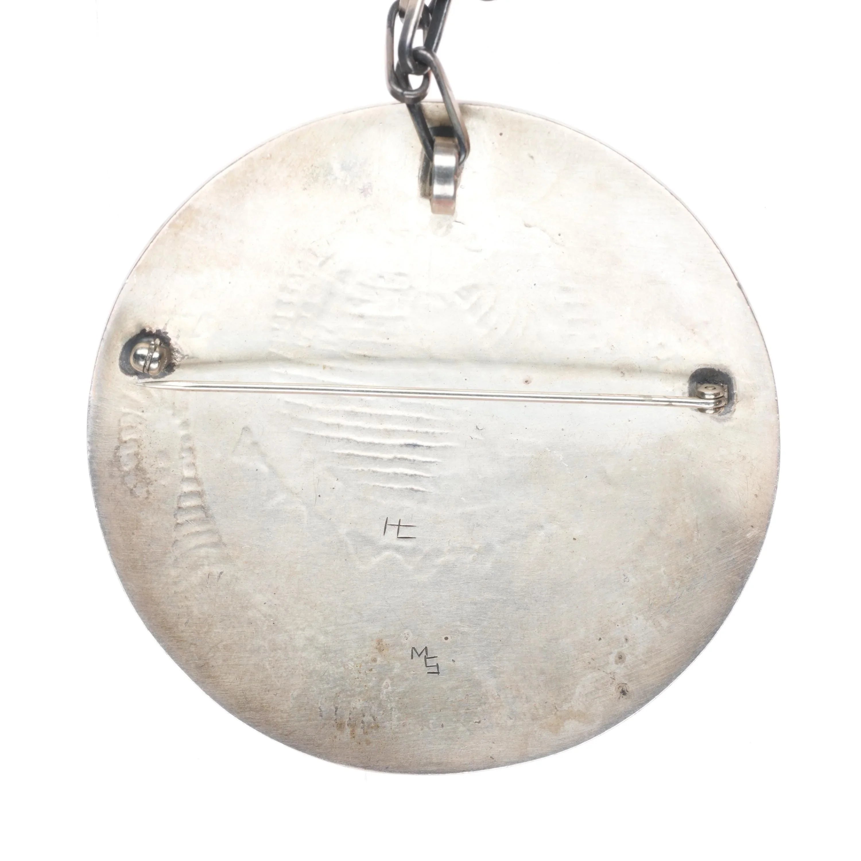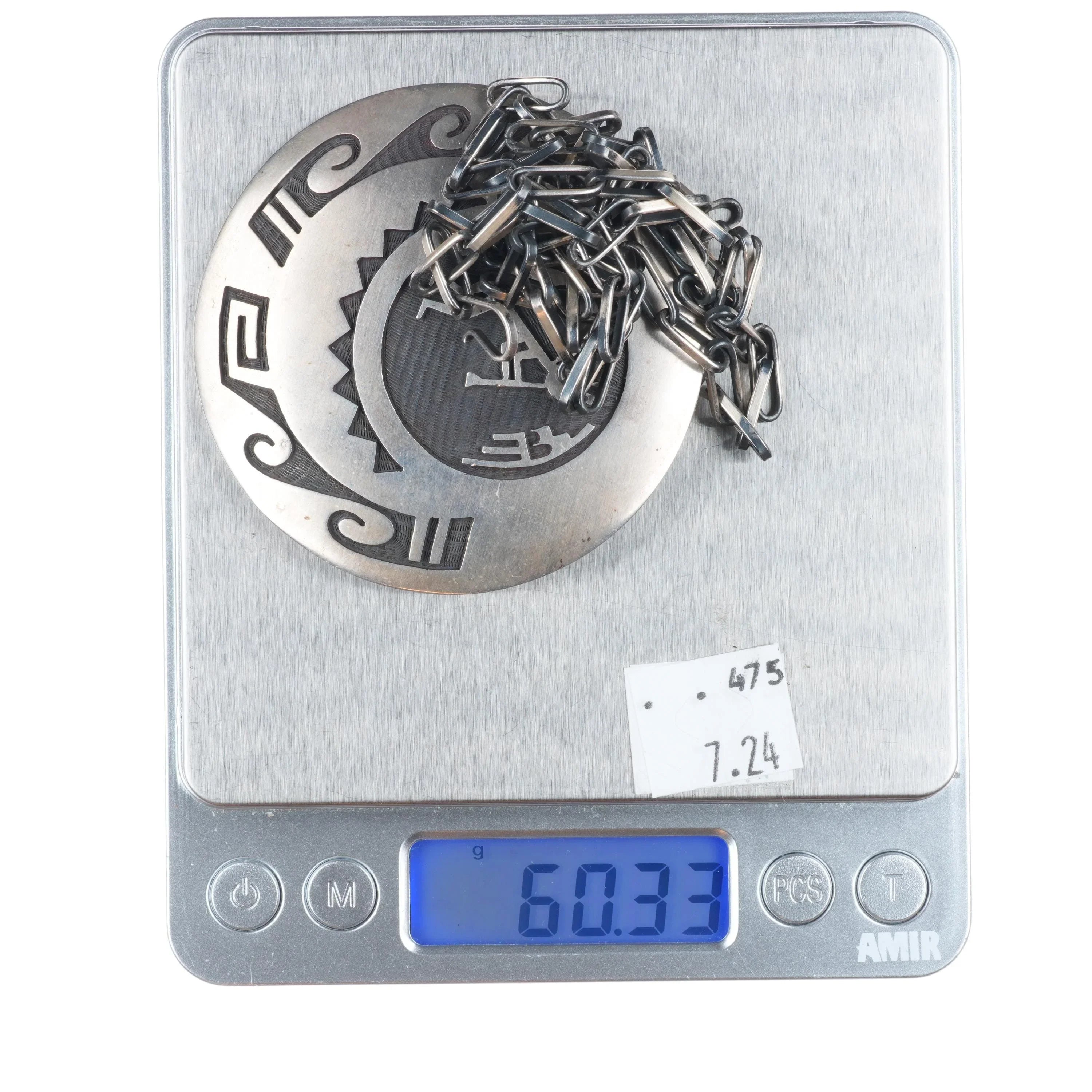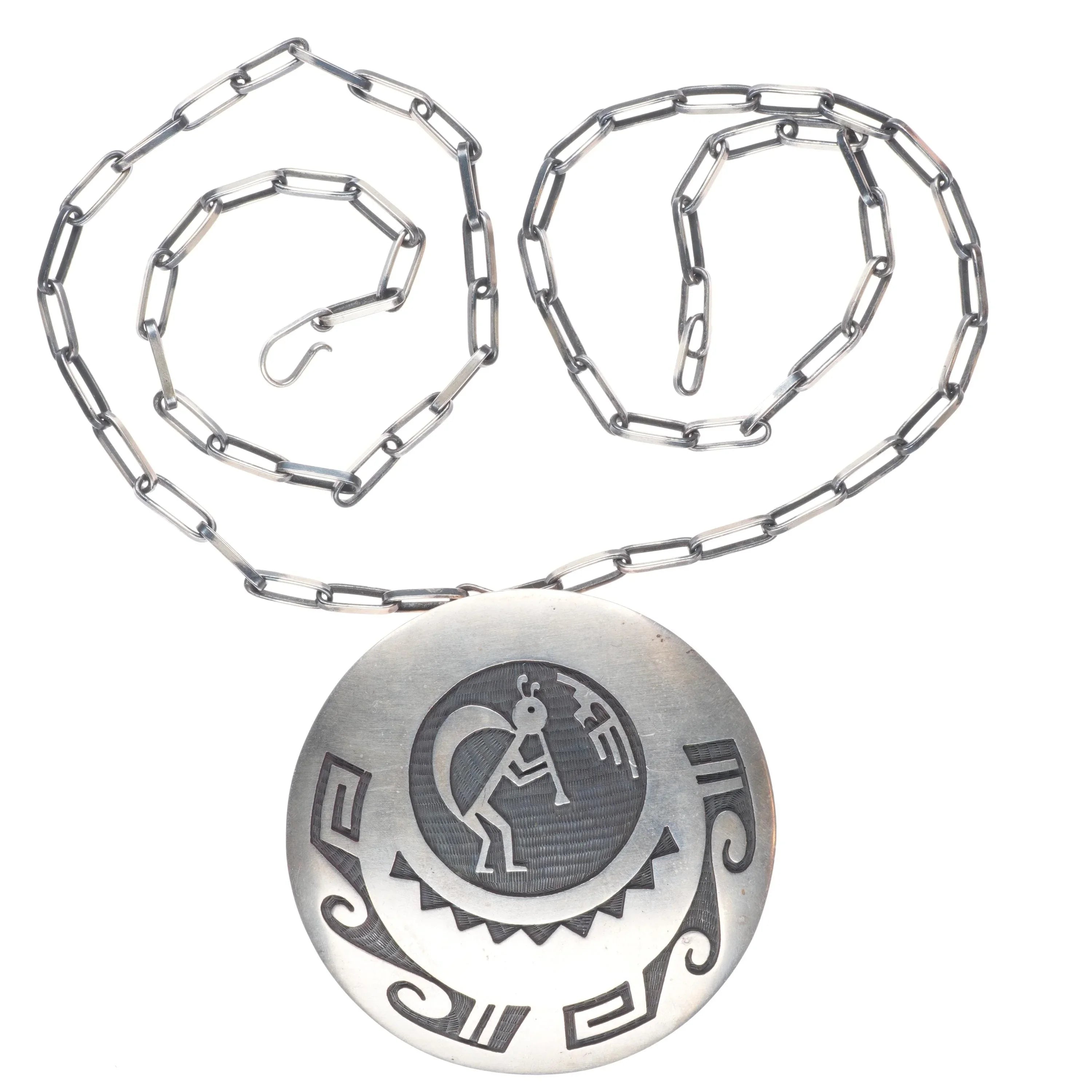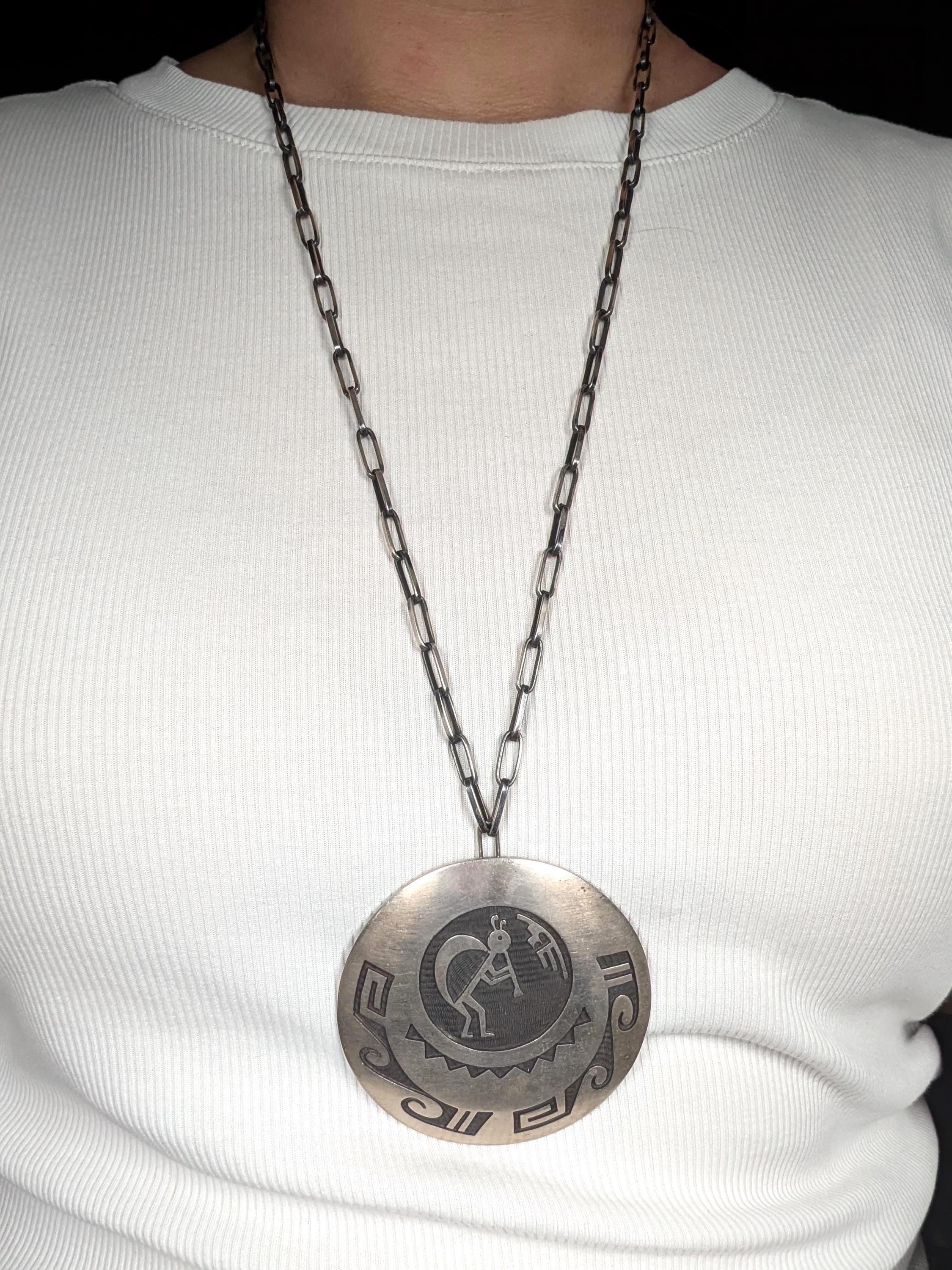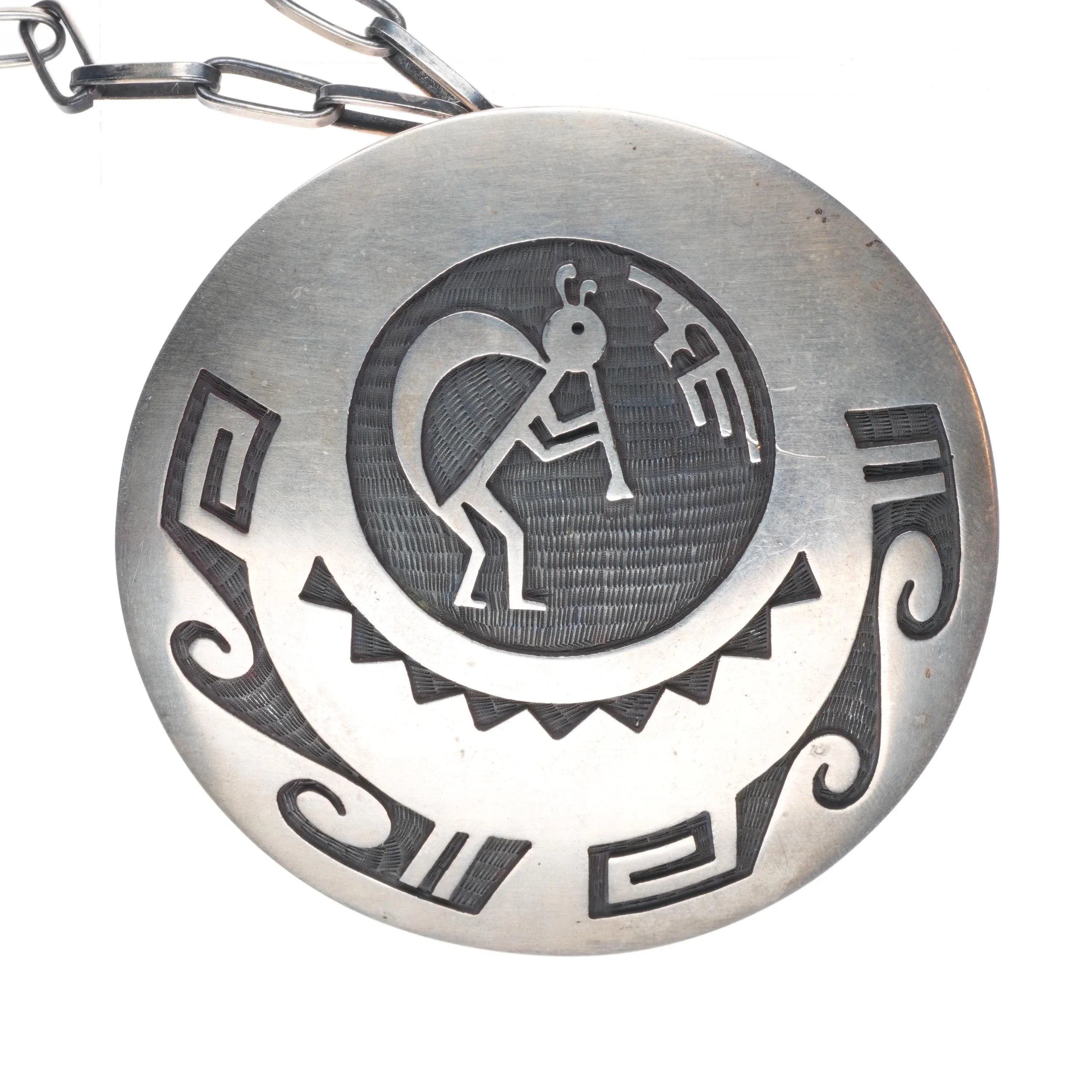 Large Michael Sockyma Hopi Overlay kokopelli pendant/pin sterling silver. Solid sterling silver tested and guaranteed with weight and measurements in the pictures. No issues, circa last quarter of the 20th century. 26.5" long necklace.