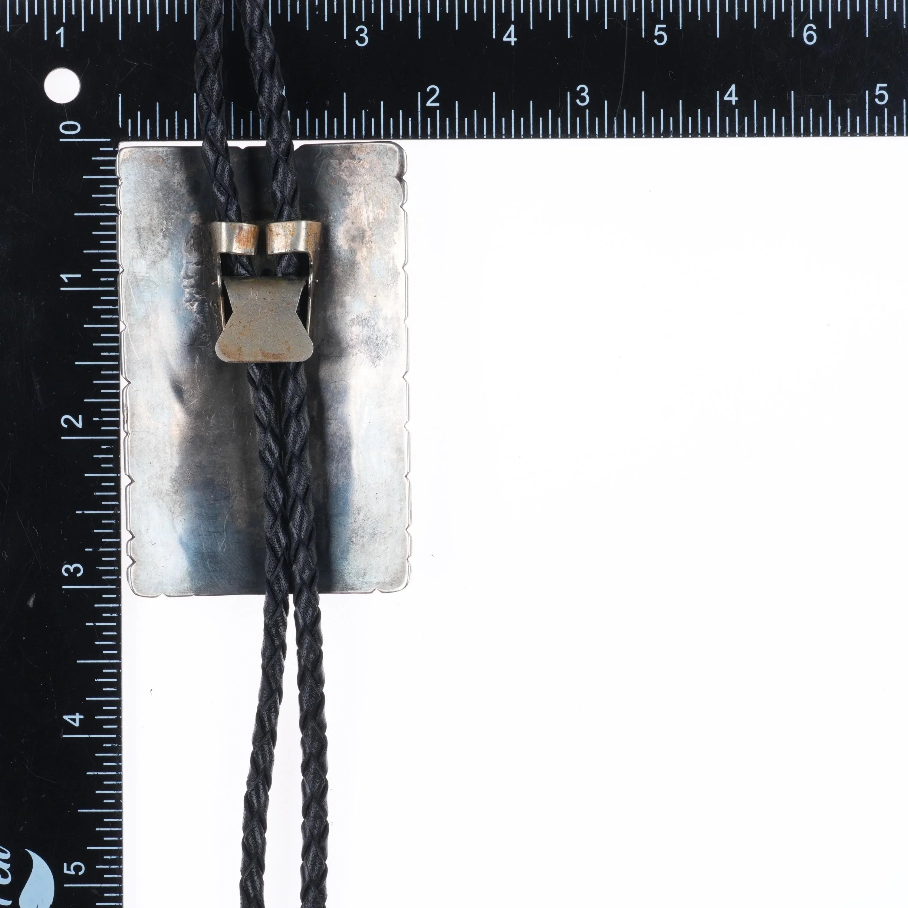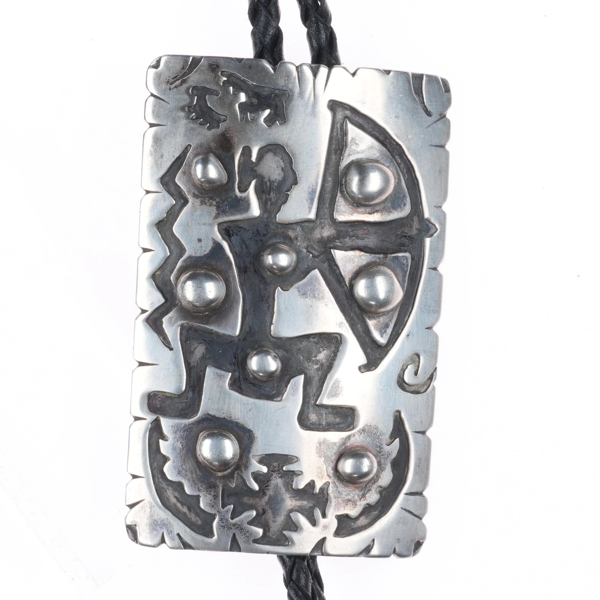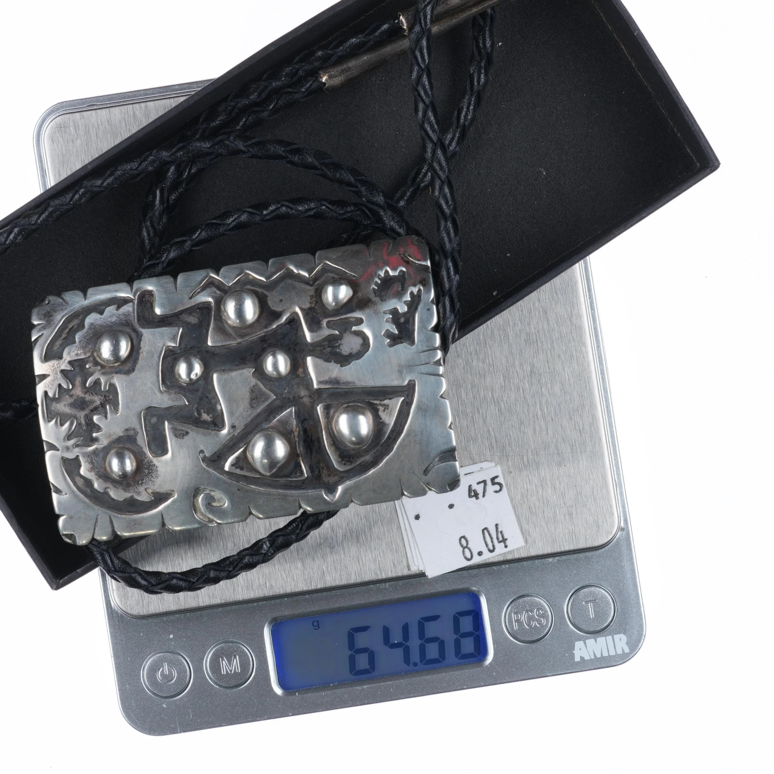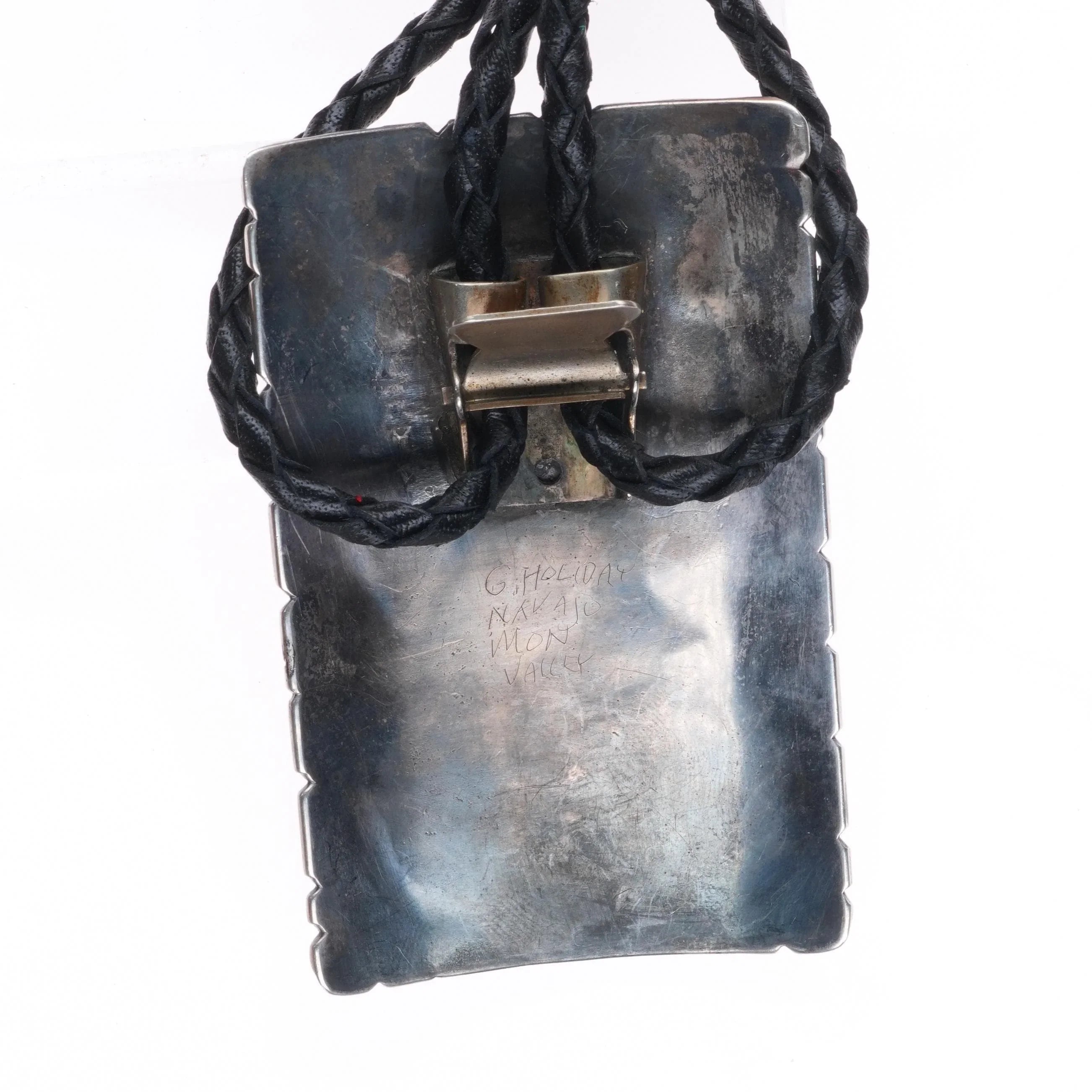 Large Vintage G Holiday Navajo sterling silver Mimbres hunter overlay bolo tie