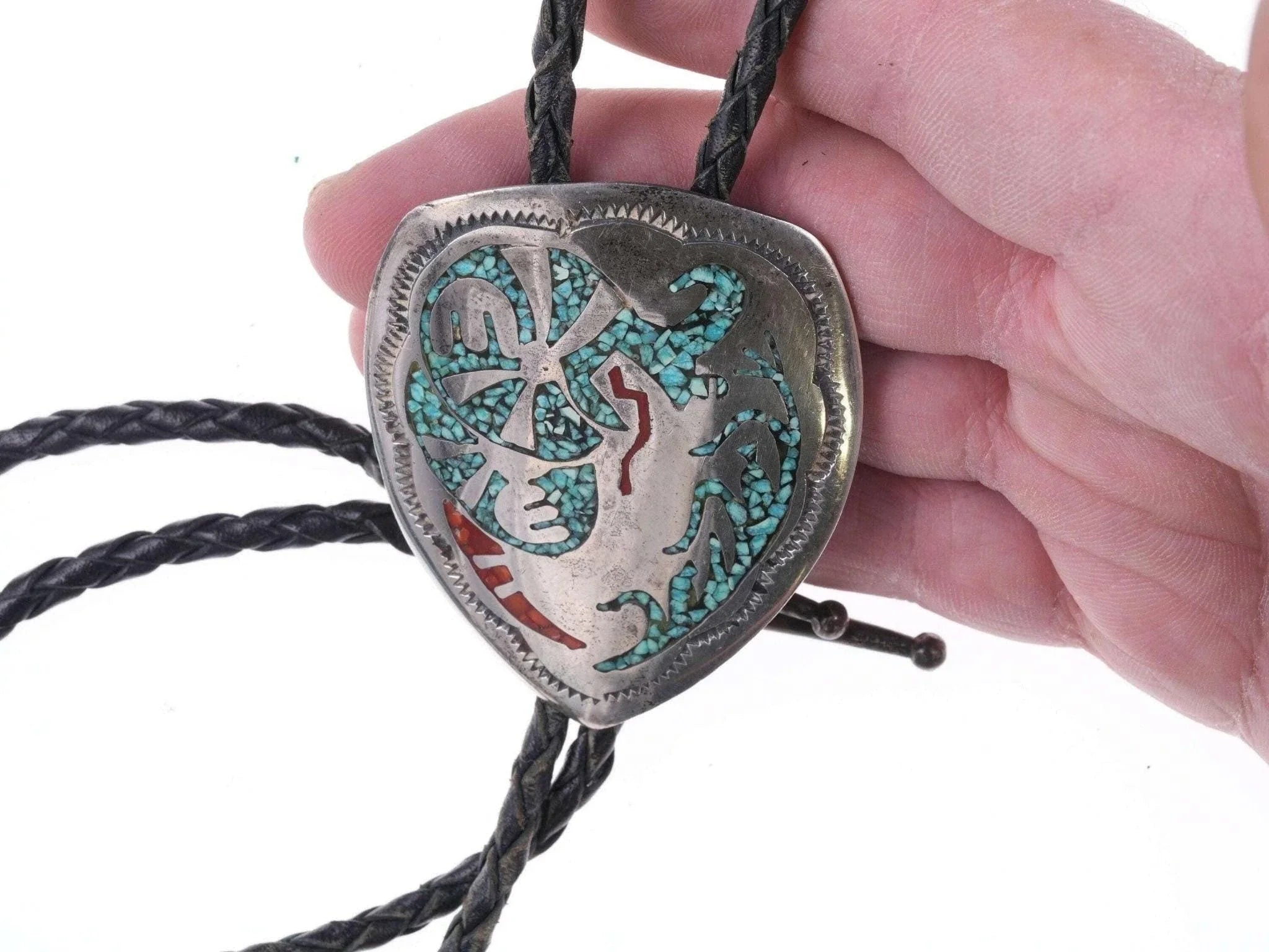 Large vintage Navajo silver chip inlay bolo tie. Nice bolo from the third<br>quarter of the 20th century. 40" long 3.5" x 2" 47.3 grams<br><br>All precious metals are tested and guaranteed, any Native American jewelry<br>referred to as Silver or Sterling is guaranteed to be a minimum of 90% (coin)<br>silver and possibly higher content. Anything marked is guaranteed to be what<br>it's marked, most bracelets are photographed on a 6" wrist, rings photographed<br>on the appropriate sized finger when possible. With bracelets if the measurement<br>is not given in the description then inside circumference is shown where the<br>metal meets the number on the the cloth tape measure.