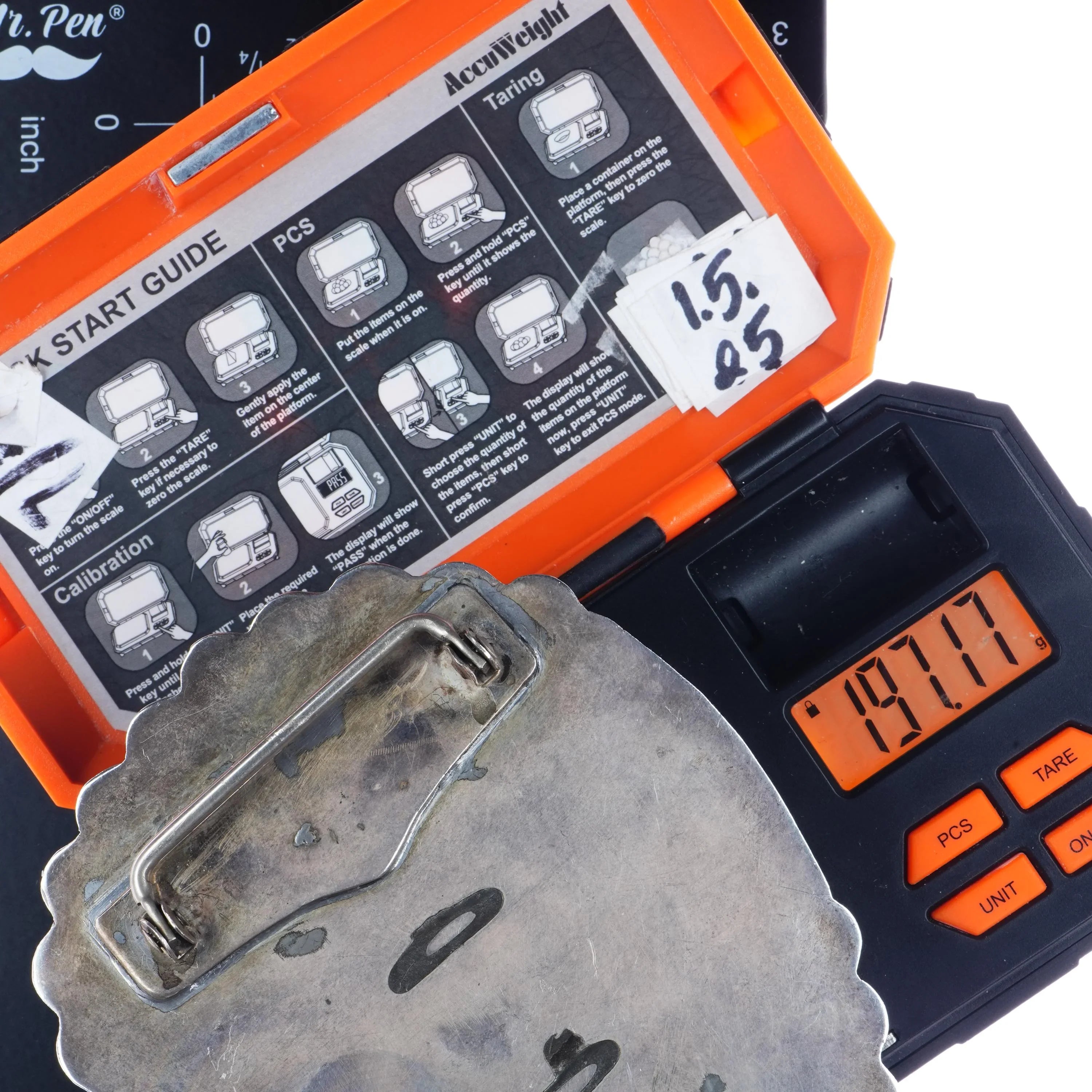 Large Vintage sterling turquoise abstract slab cluster border belt buckle. Solid sterling silver with weight and measurements in pics. Fully functional, with appropriate wear as shown in the pictures. No apparent markings.