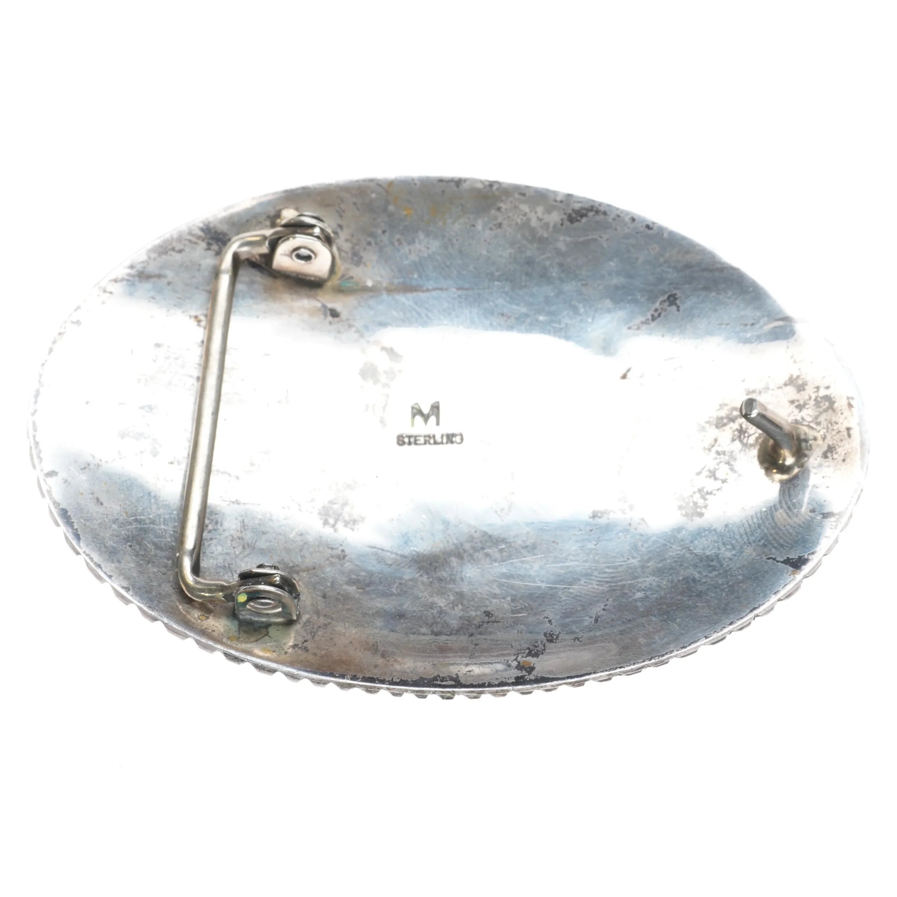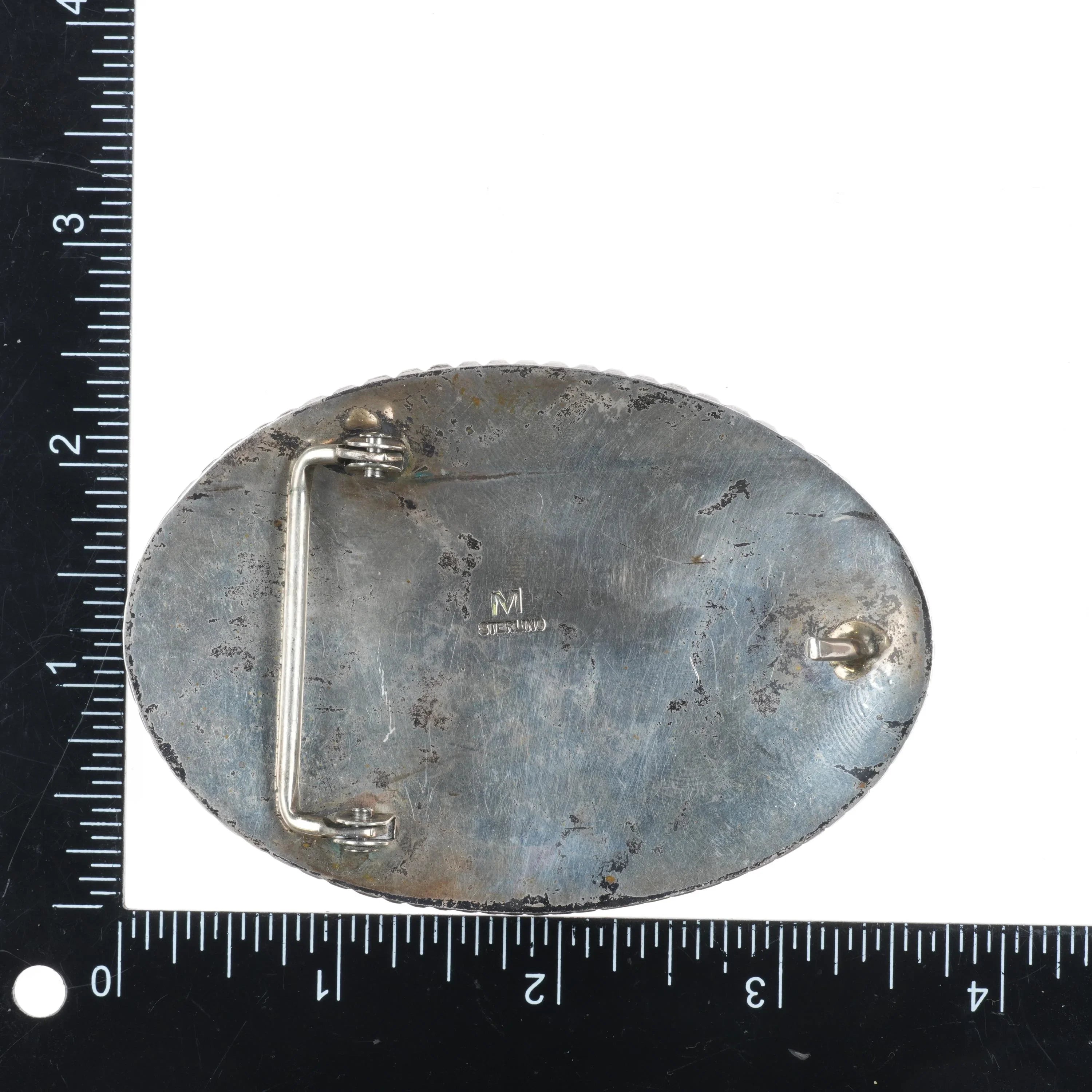 Pete Morgan Navajo heavy stamped sterling silver belt buckle spiderweb turquoise. Tested and guaranteed solid sterling silver, fits a 1.5" wide belt. No issues, some expected wear. Circa last quarter of the 20th century. Weight and measurements in pictures.