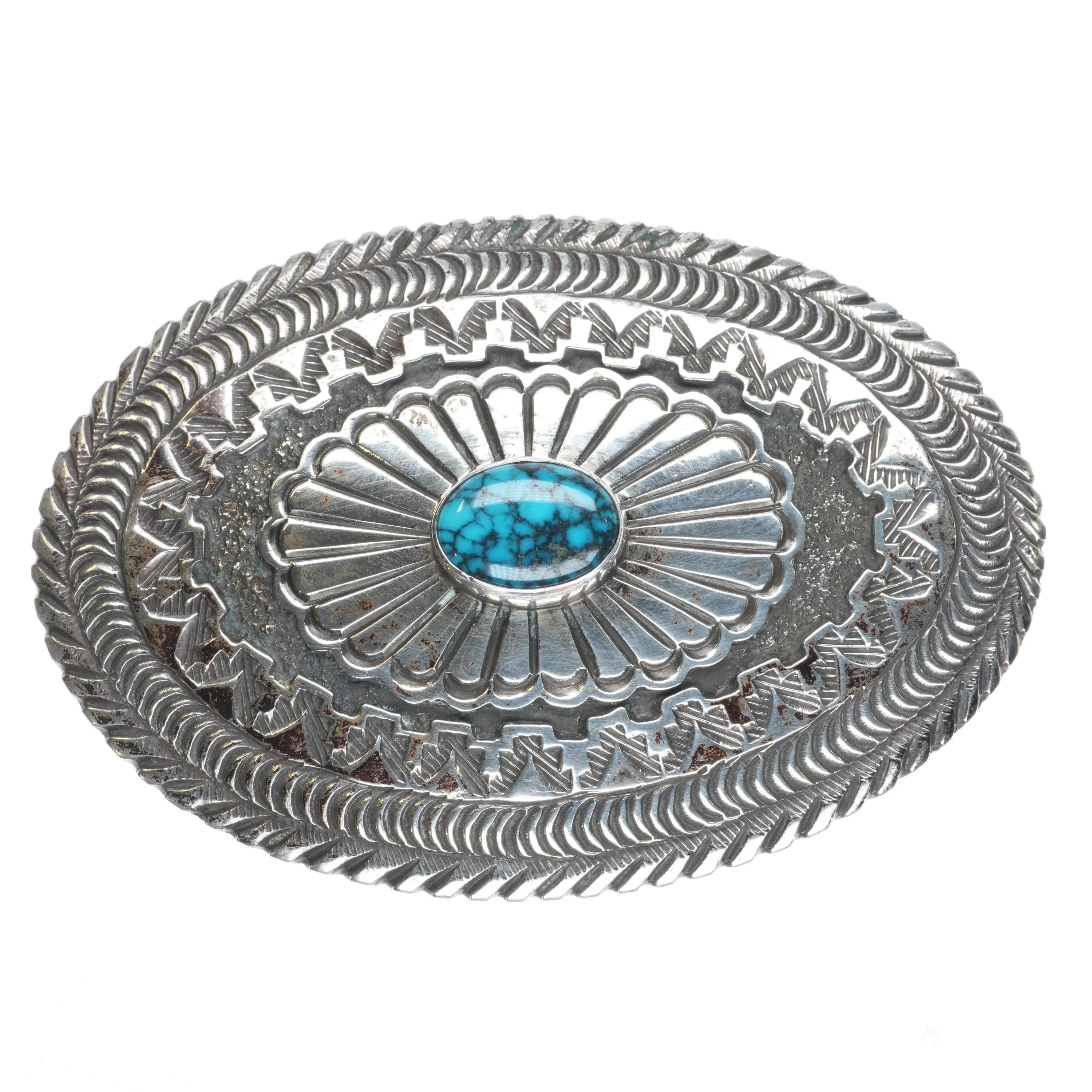 Pete Morgan Navajo heavy stamped sterling silver belt buckle spiderweb turquoise