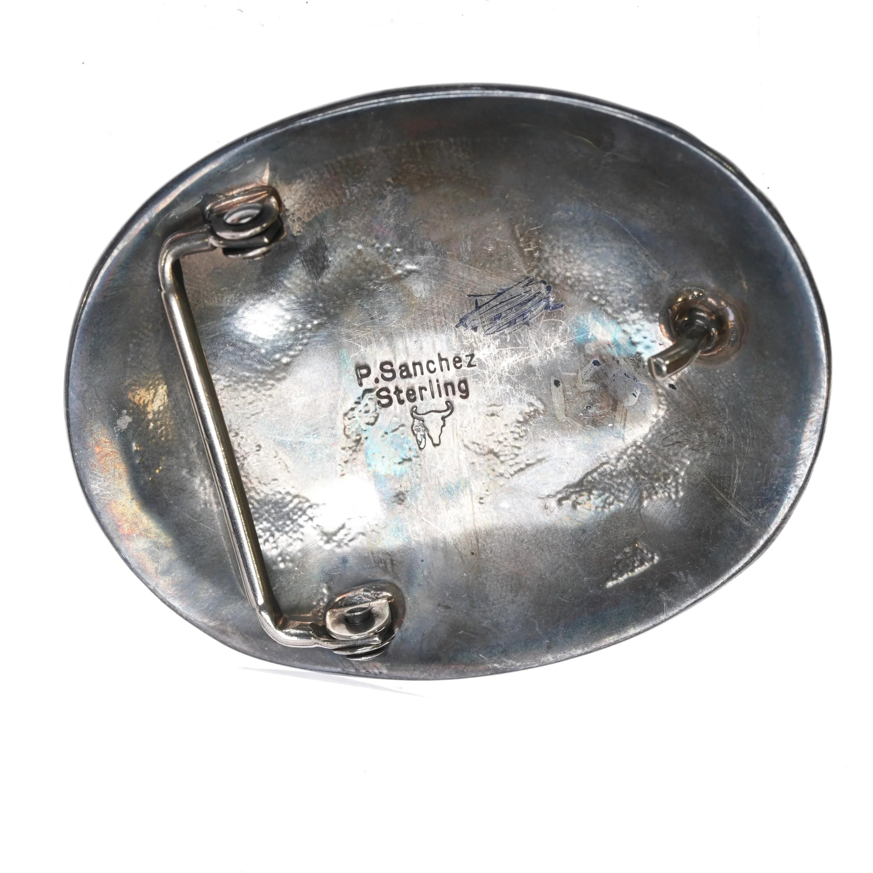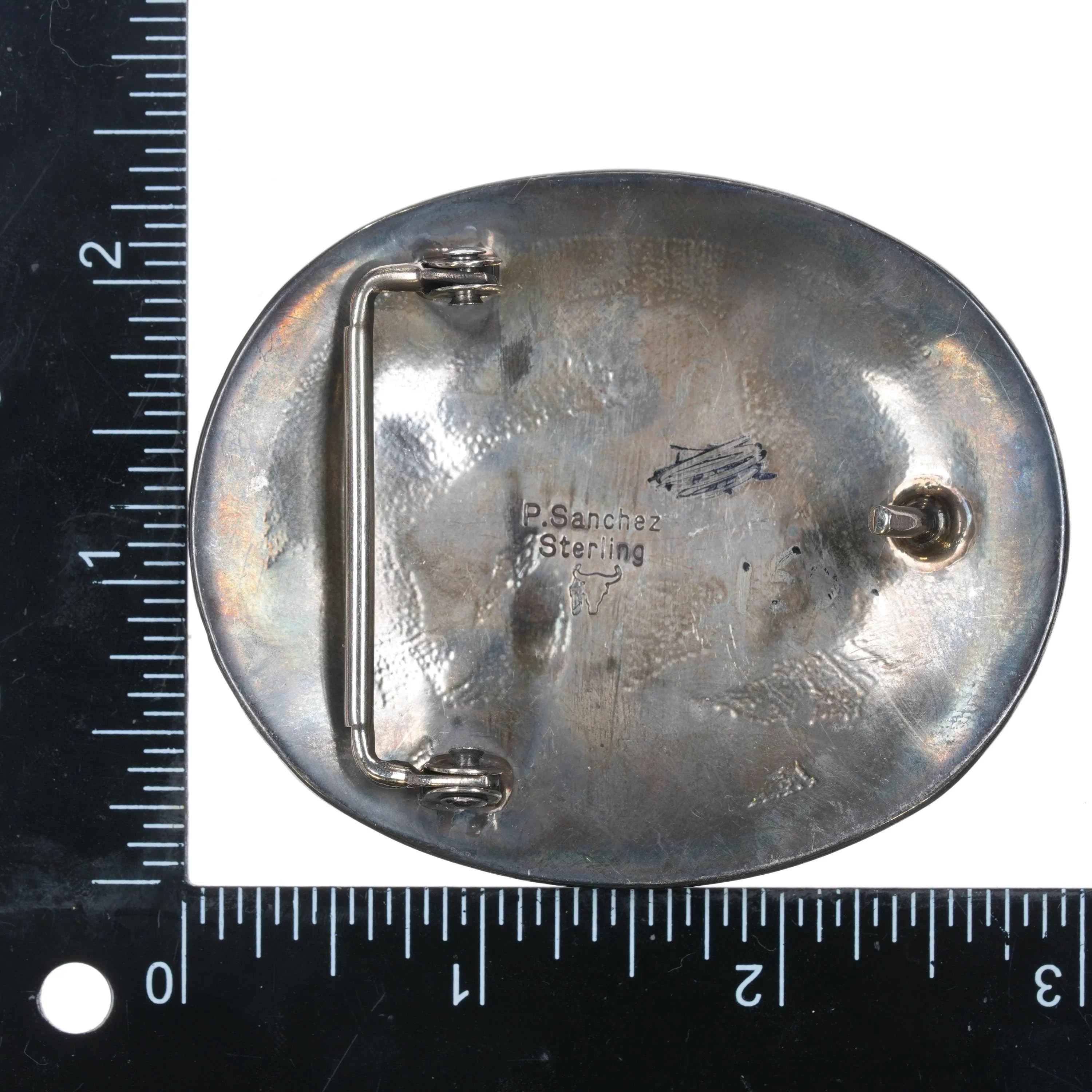 Pete Sanchez Isleta Pueblo sterling silver "End of the Trail" belt buckle. Fits up to a 1.5" belt. Solid sterling silver, Marked as shown. Weight and measurements in pictures. Tested and guaranteed solid sterling silver.