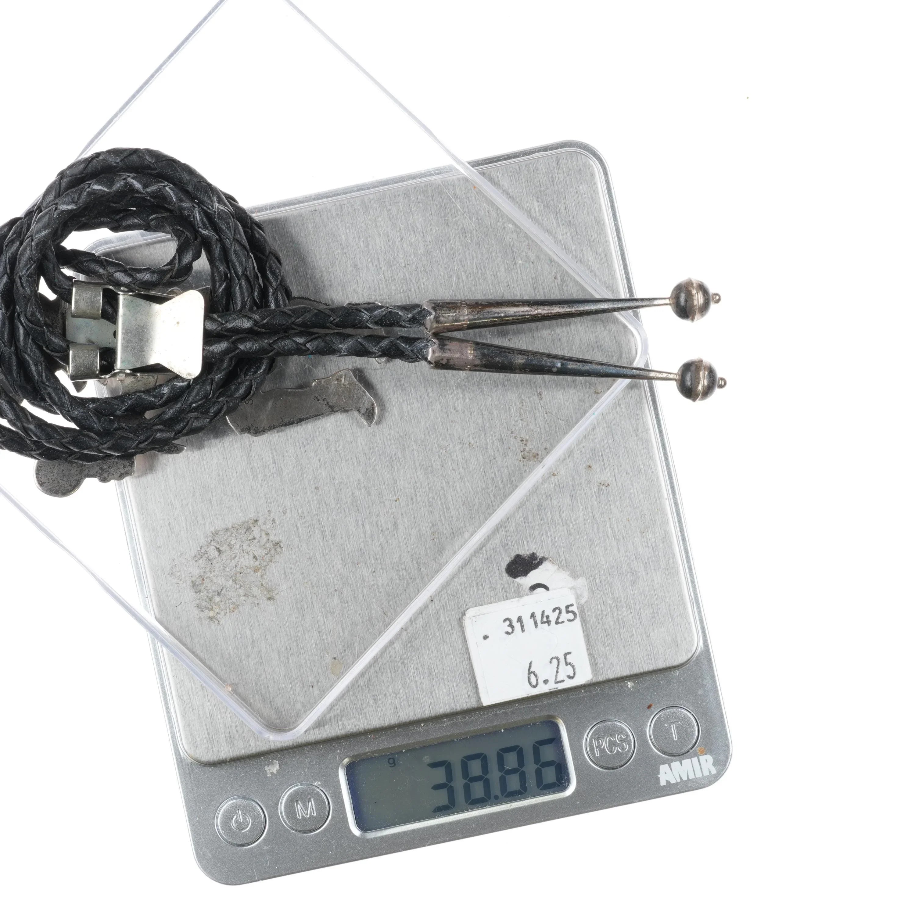 Vintage Bisbee Bob Arizona Sterling silver, turquoise, shard kokopelli bolo tie. Tested and guaranteed solid sterling silver slide and tips. Weight and measurements in pictures. Great bolo, 38" long with no issues. Tray is tared out, so weight shown is just the bolo of course.