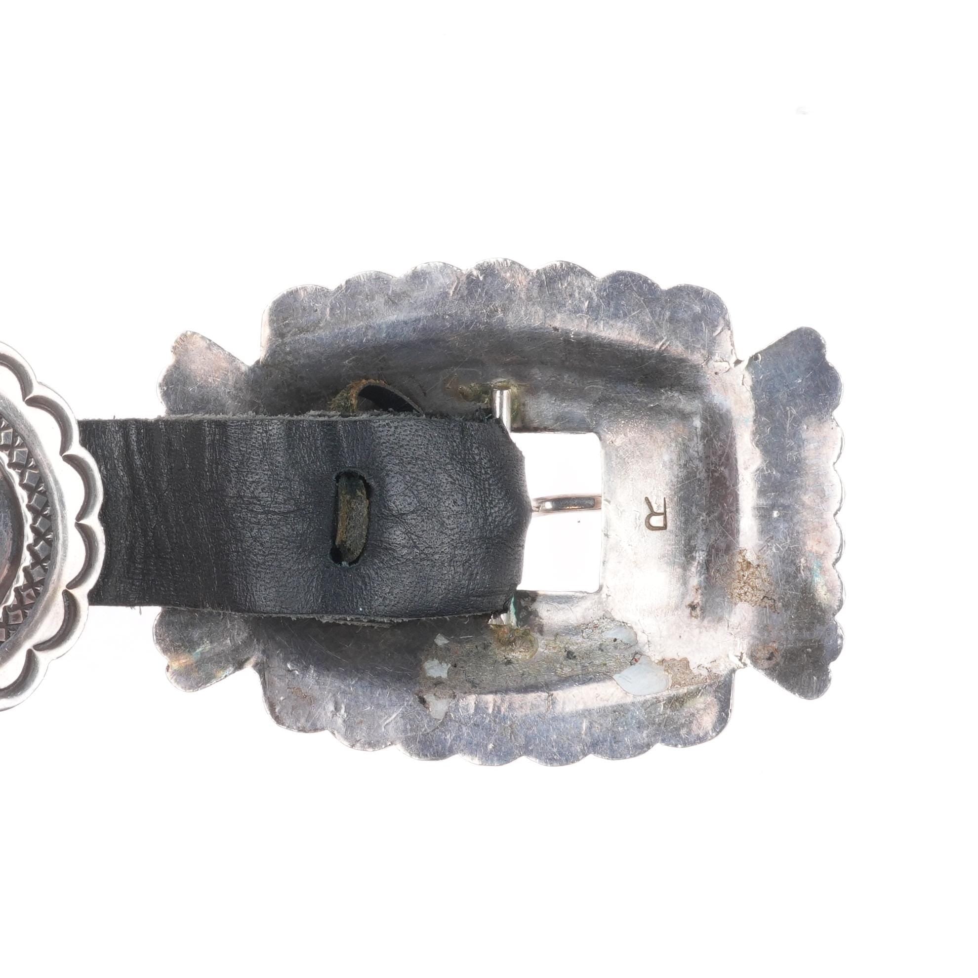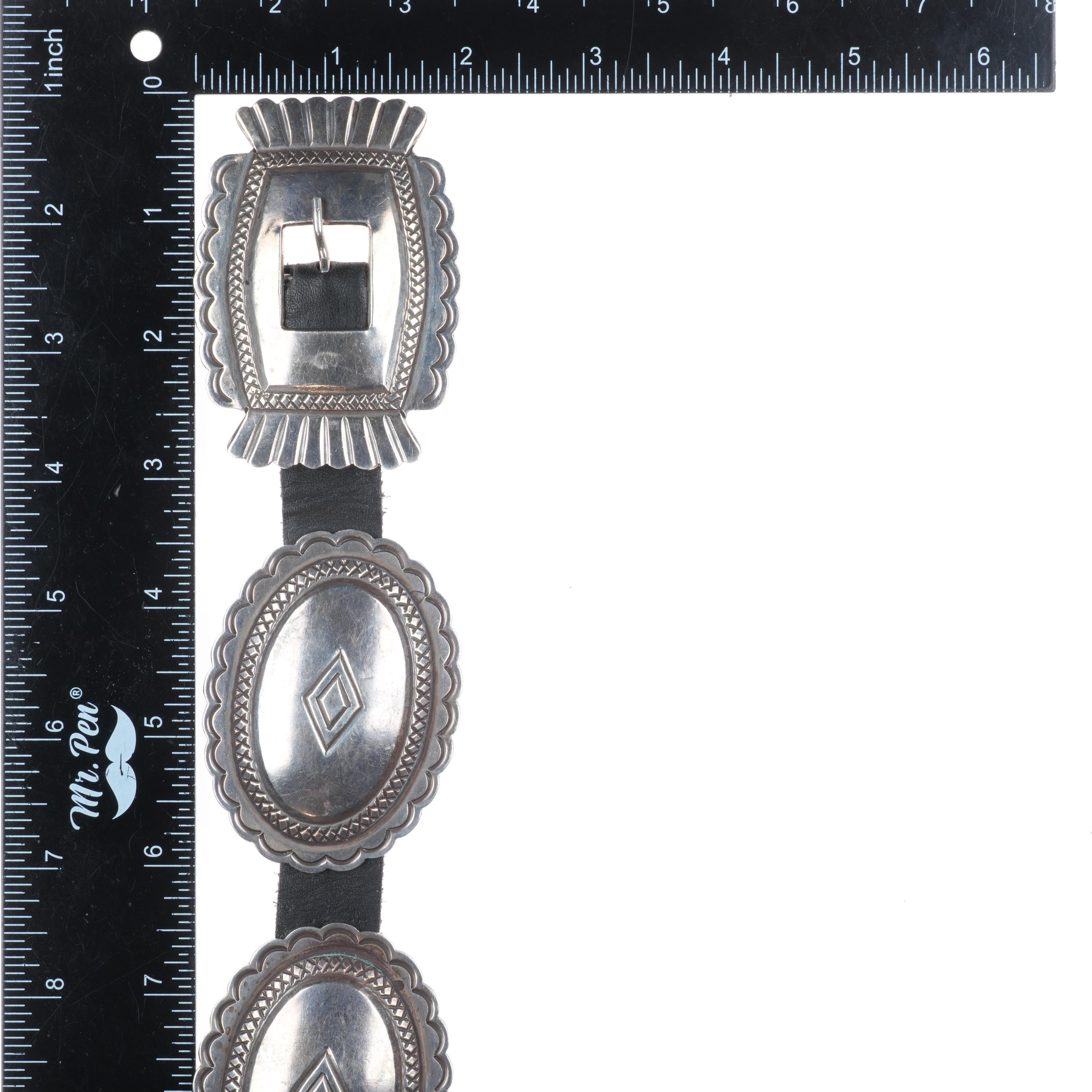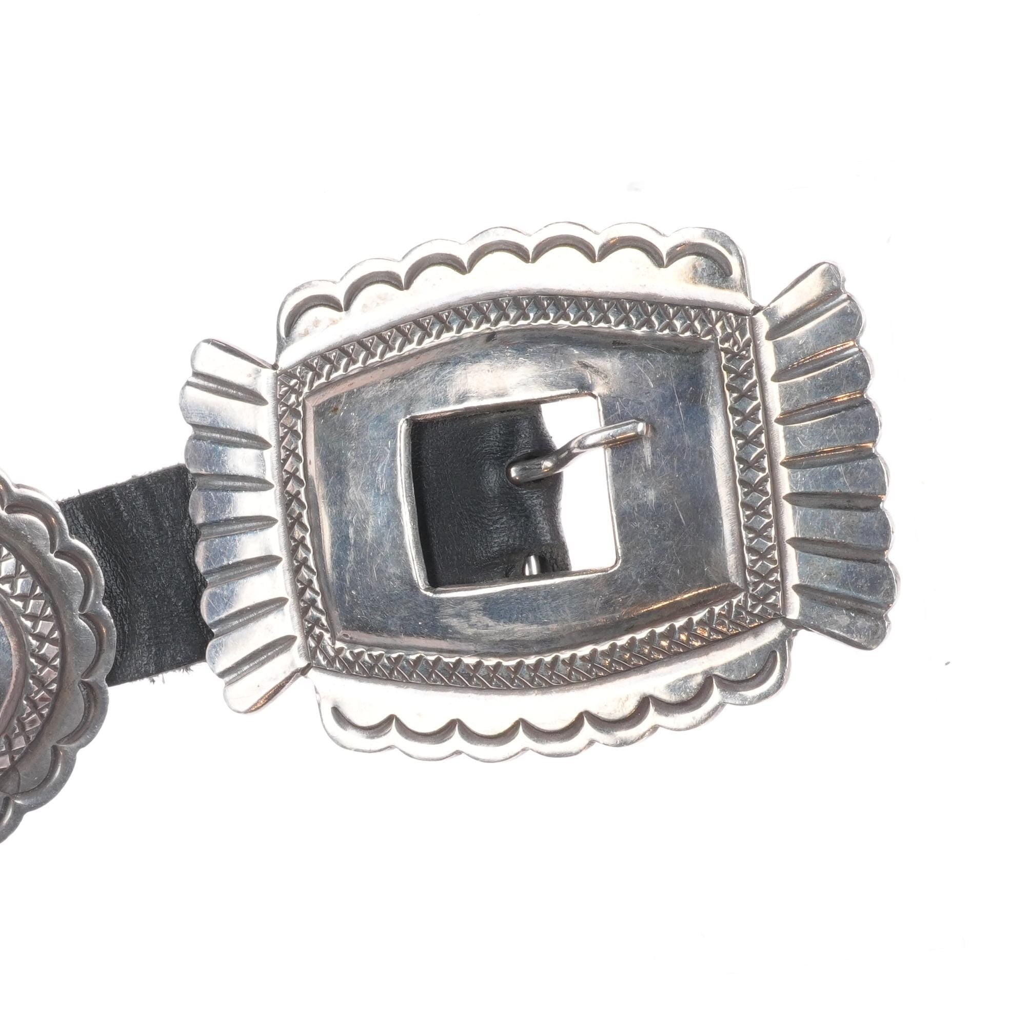 Roger Skeet Jr Navajo sterling silver hand stamped vintage concho belt. Fits up to a 38" waist but obviously could be worn shorter or more holes added. Tape measure shown in pics.. Weight and measurements in pictures. No damage or issues, tested and guaranteed solid sterling silver. 10 Conchos and 1 Buckle. All solid sterling silver, circa third quarter of the 20th century, hallmarked as shown. If you need holes in the belt I can put holes wherever you request. I don‘t see any holes, 40" total length.