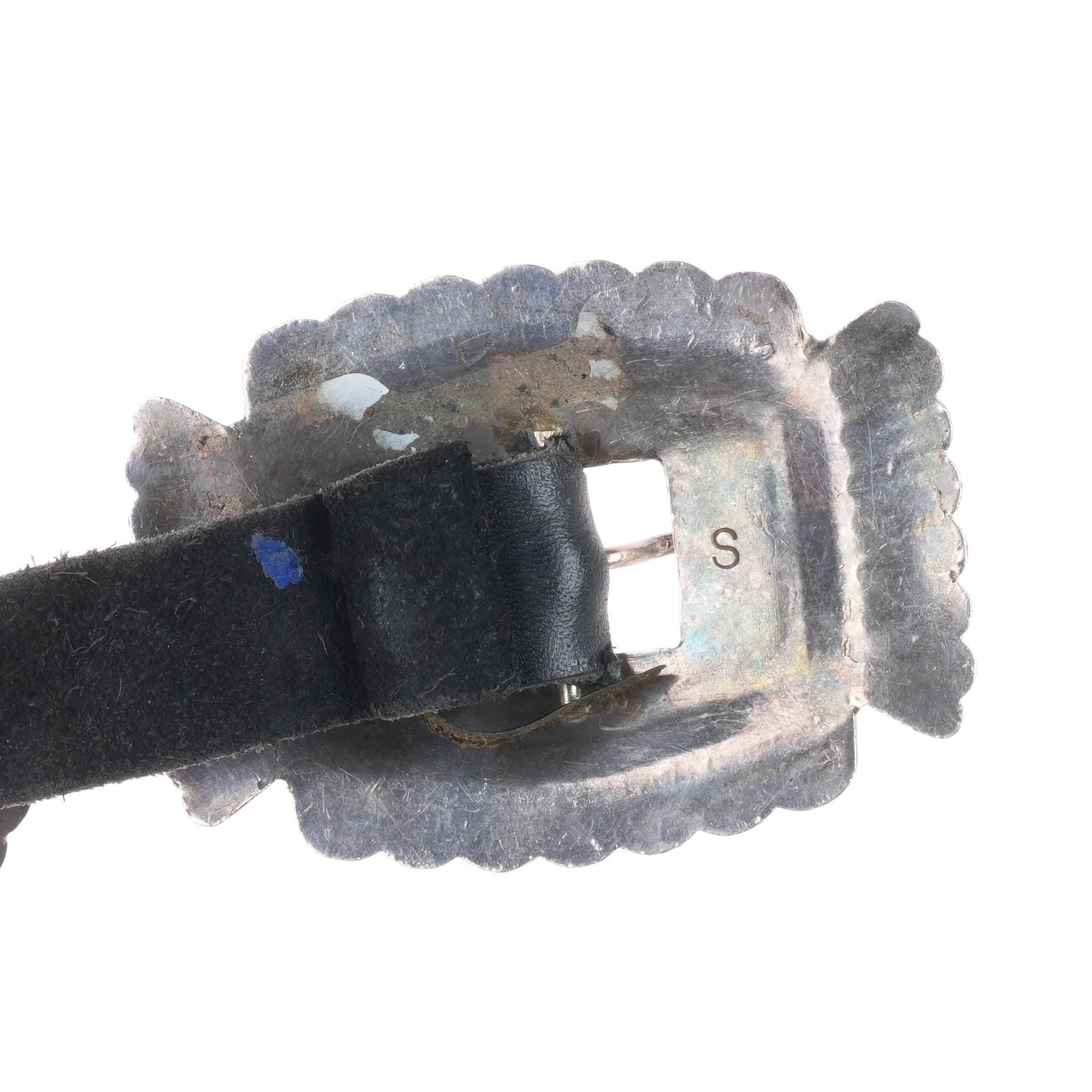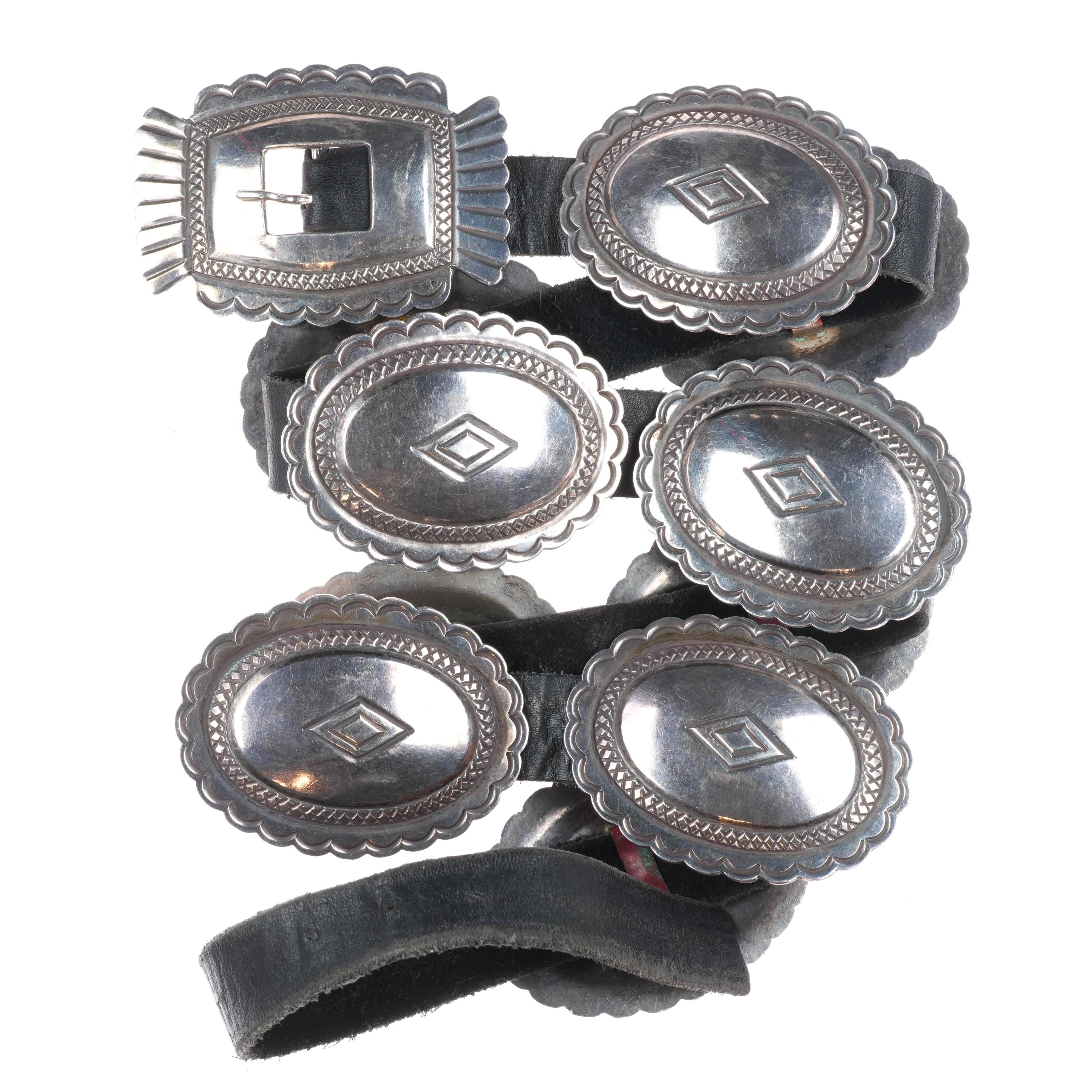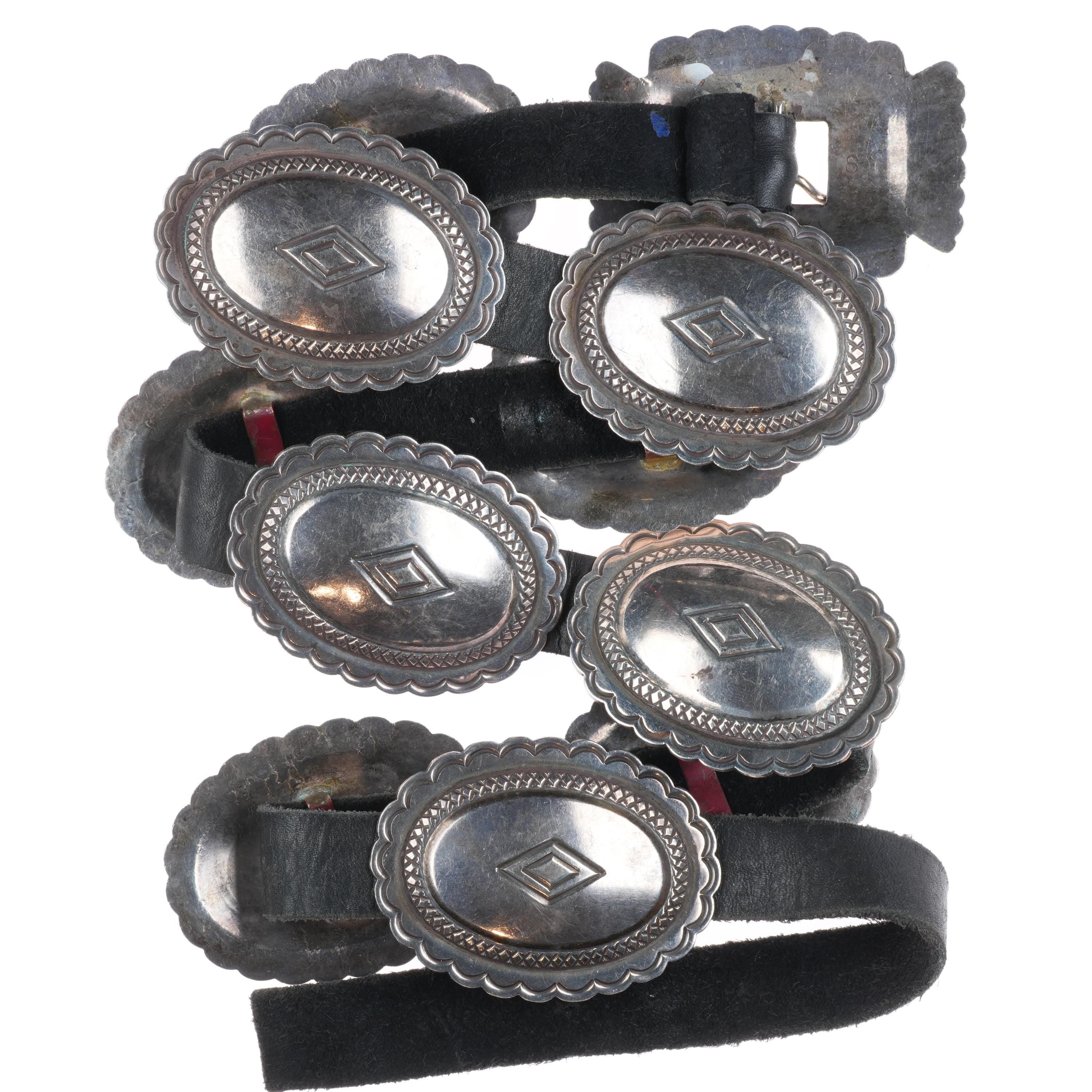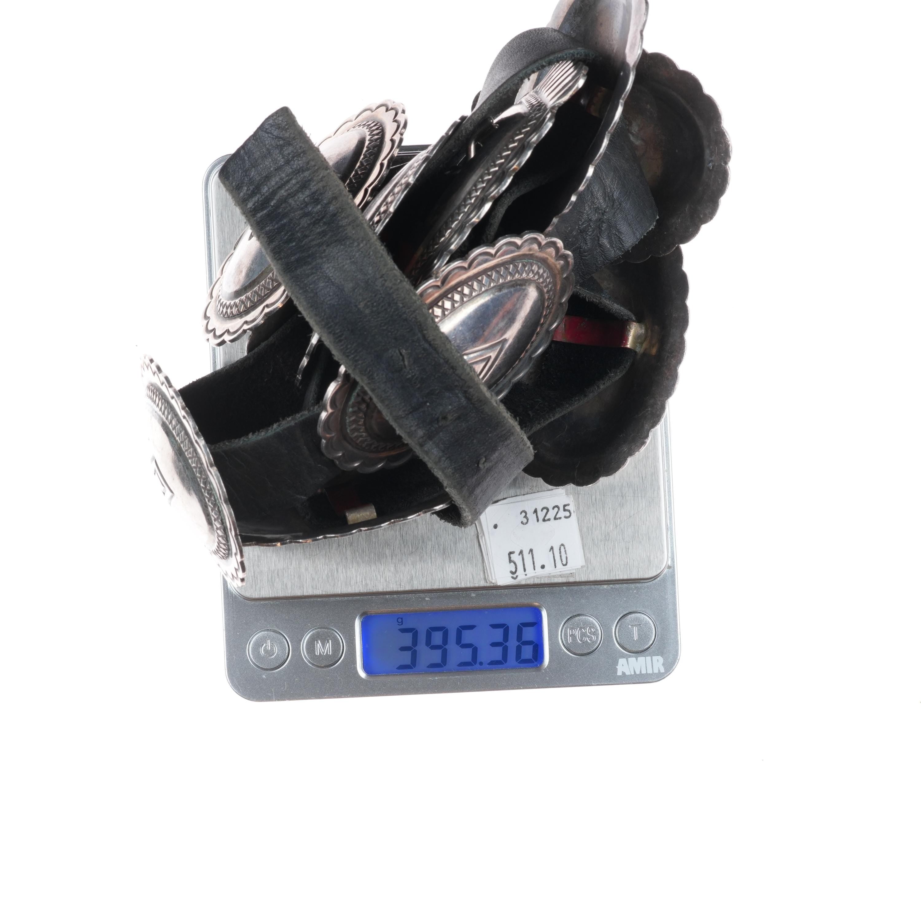 Roger Skeet Jr Navajo sterling silver hand stamped vintage concho belt. Fits up to a 38" waist but obviously could be worn shorter or more holes added. Tape measure shown in pics.. Weight and measurements in pictures. No damage or issues, tested and guaranteed solid sterling silver. 10 Conchos and 1 Buckle. All solid sterling silver, circa third quarter of the 20th century, hallmarked as shown. If you need holes in the belt I can put holes wherever you request. I don‘t see any holes, 40" total length.