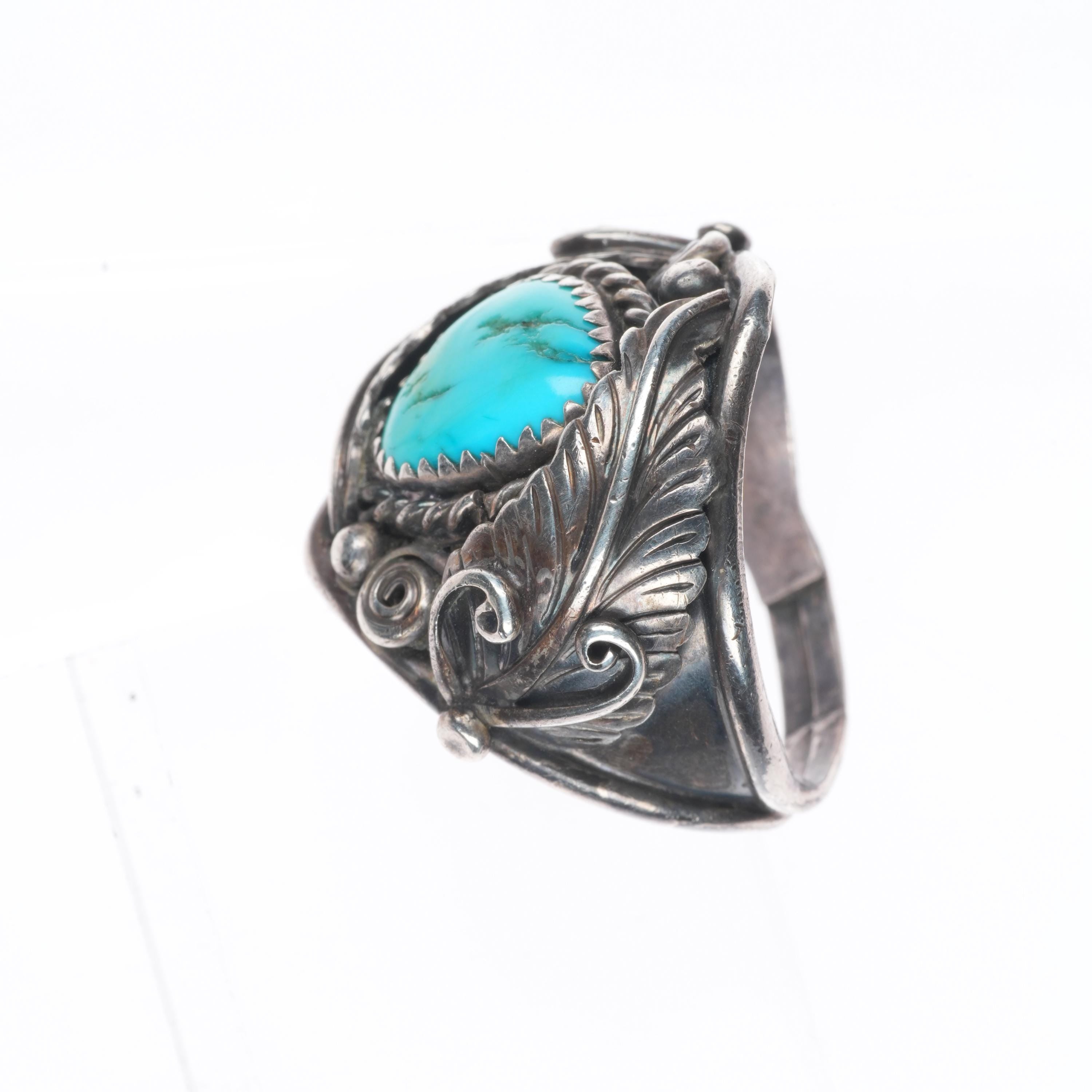 sz10.5 70‘s-80‘s Vintage Navajo sterling silver feather design turquoise ring. Tested and guaranteed solid sterling silver. Nice ring from last quarter of the 20th century. Some expected wear, weight and measurements in pictures.