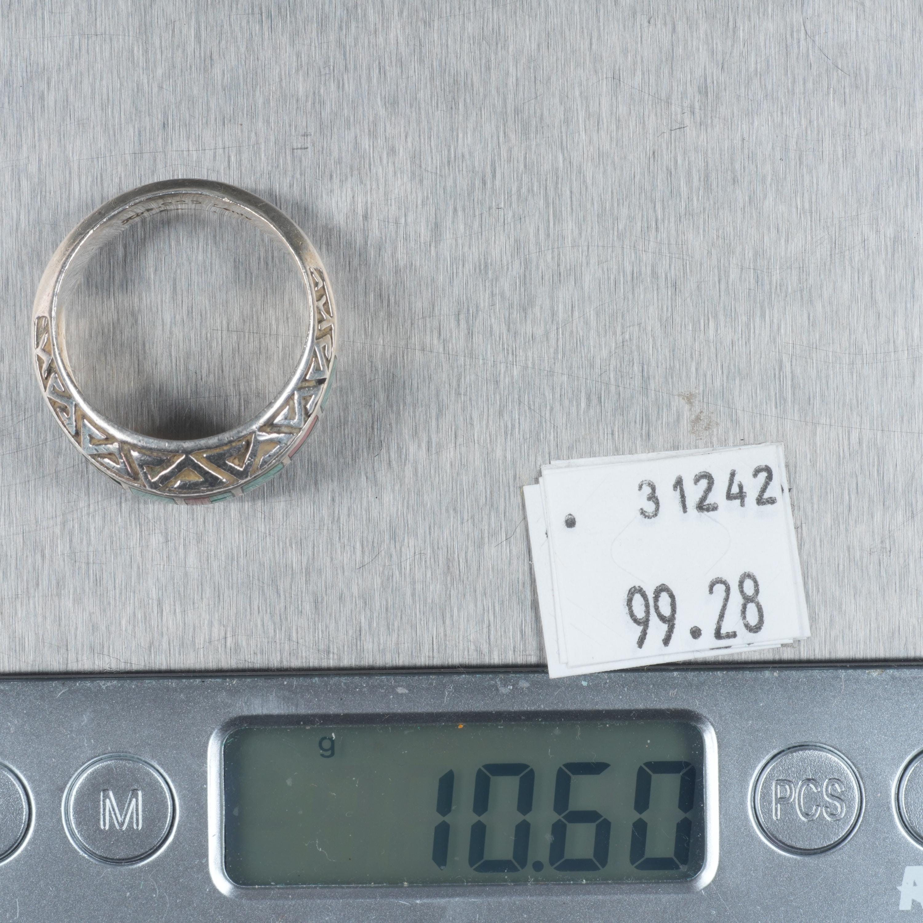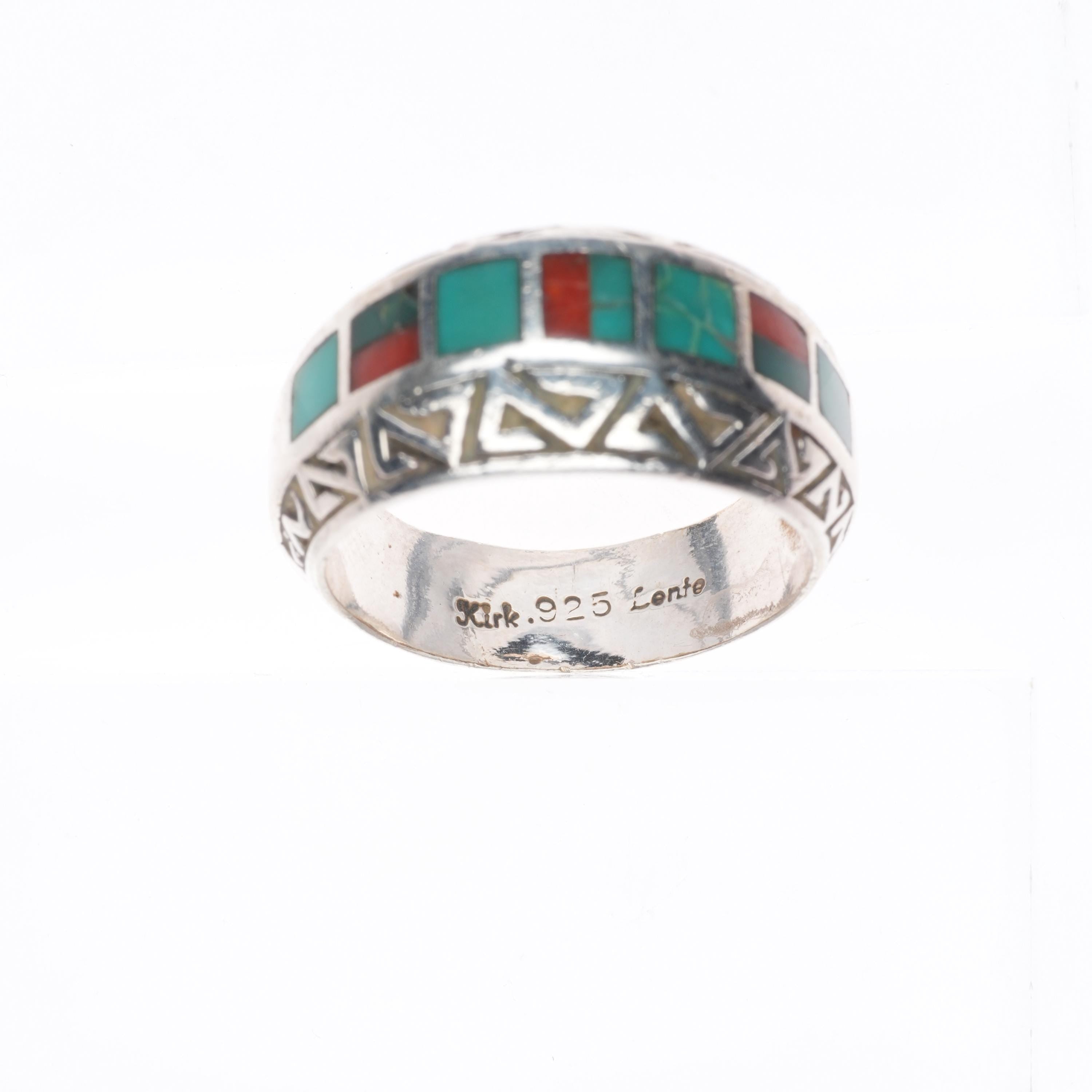 sz11.5 Melanie Kirk-Lente Isleta sterling silver, turquoise, coral inlay ring. Tested and guaranteed solid sterling silver. Nice ring from the last quarter of the 20th century. Some expected wear, weight and measurements in pictures. Stones secure with some fractures as shown.