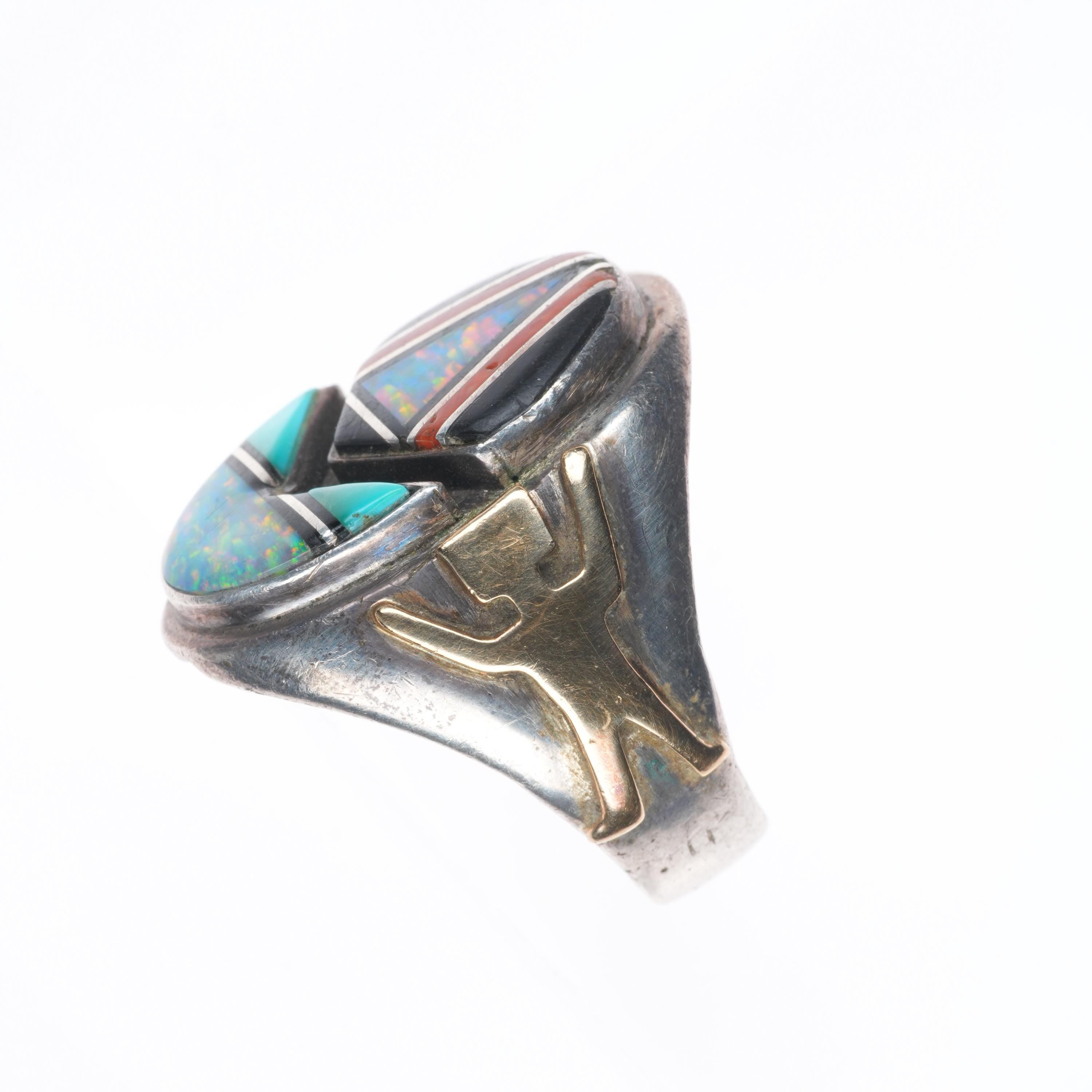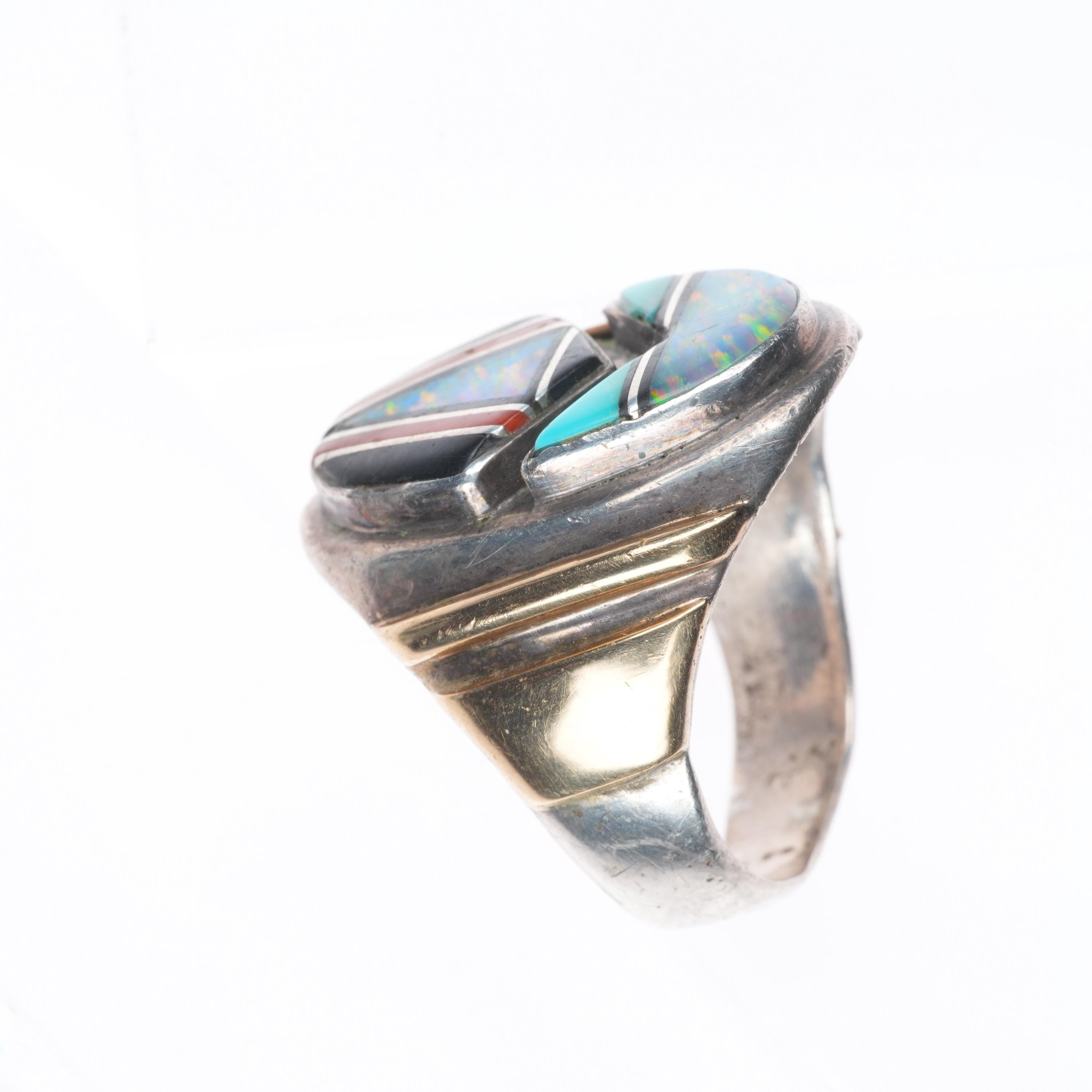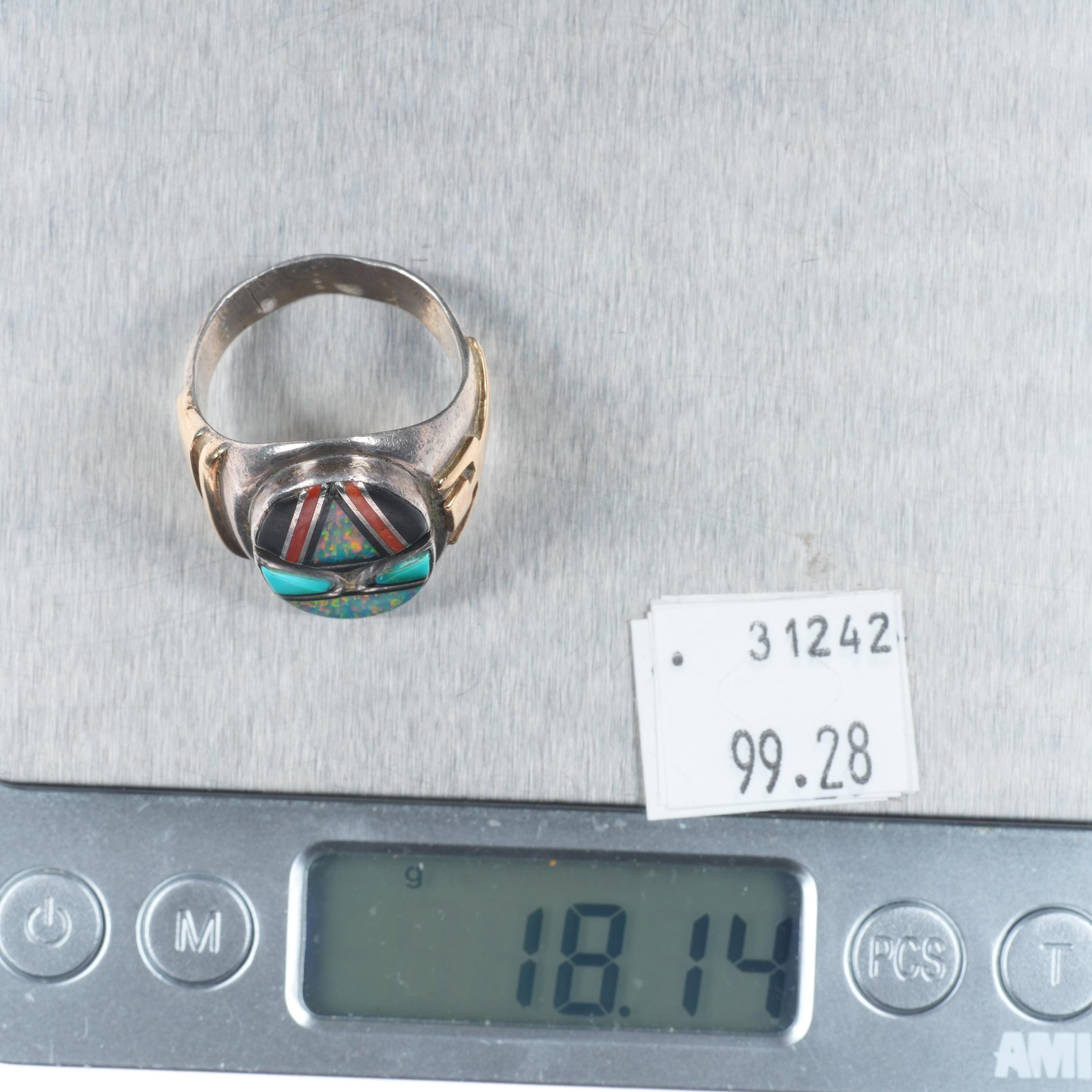 sz11.5 Vintage LJ Navajo sterling silver gold accents channel inlay men‘s ring. Tested and guaranteed solid sterling silver. Nice ring from the last quarter of the 20th century. Some expected wear, weight and measurements in pictures. I‘m not sure if the gold applied design is gold filled or solid 14k gold.