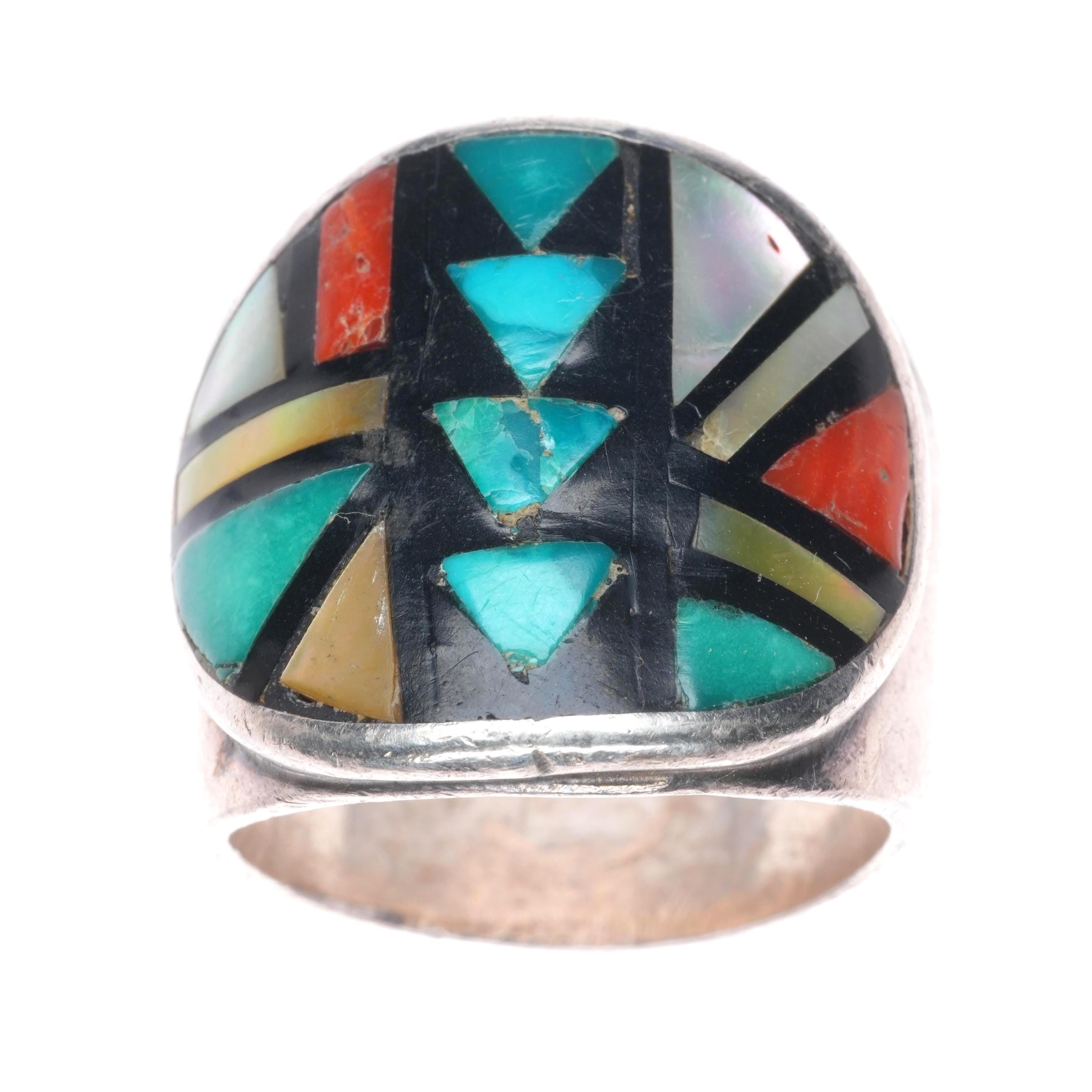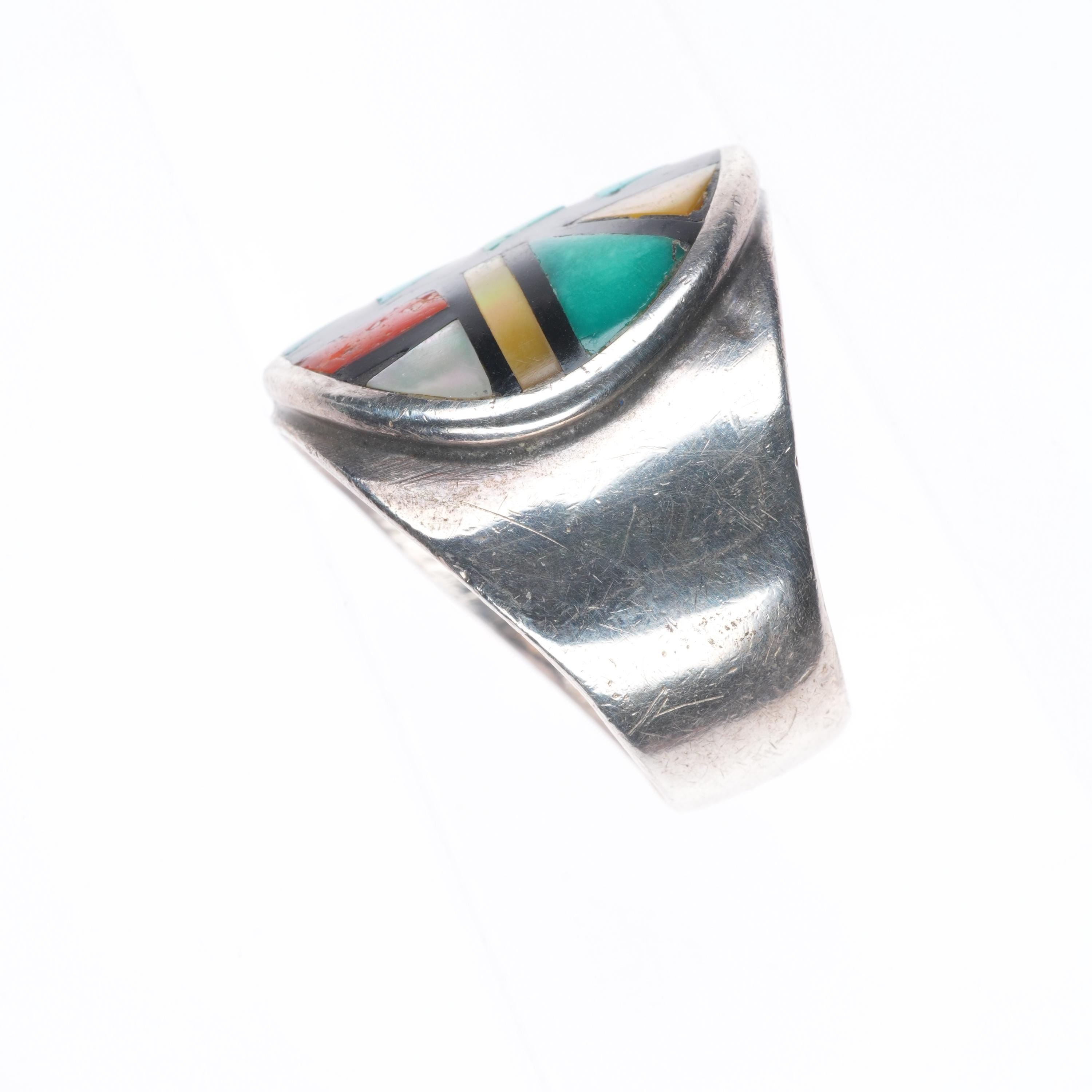 sz11 Big Vintage John & Rosalie Bowannie sterling silver intarsia inlay ring